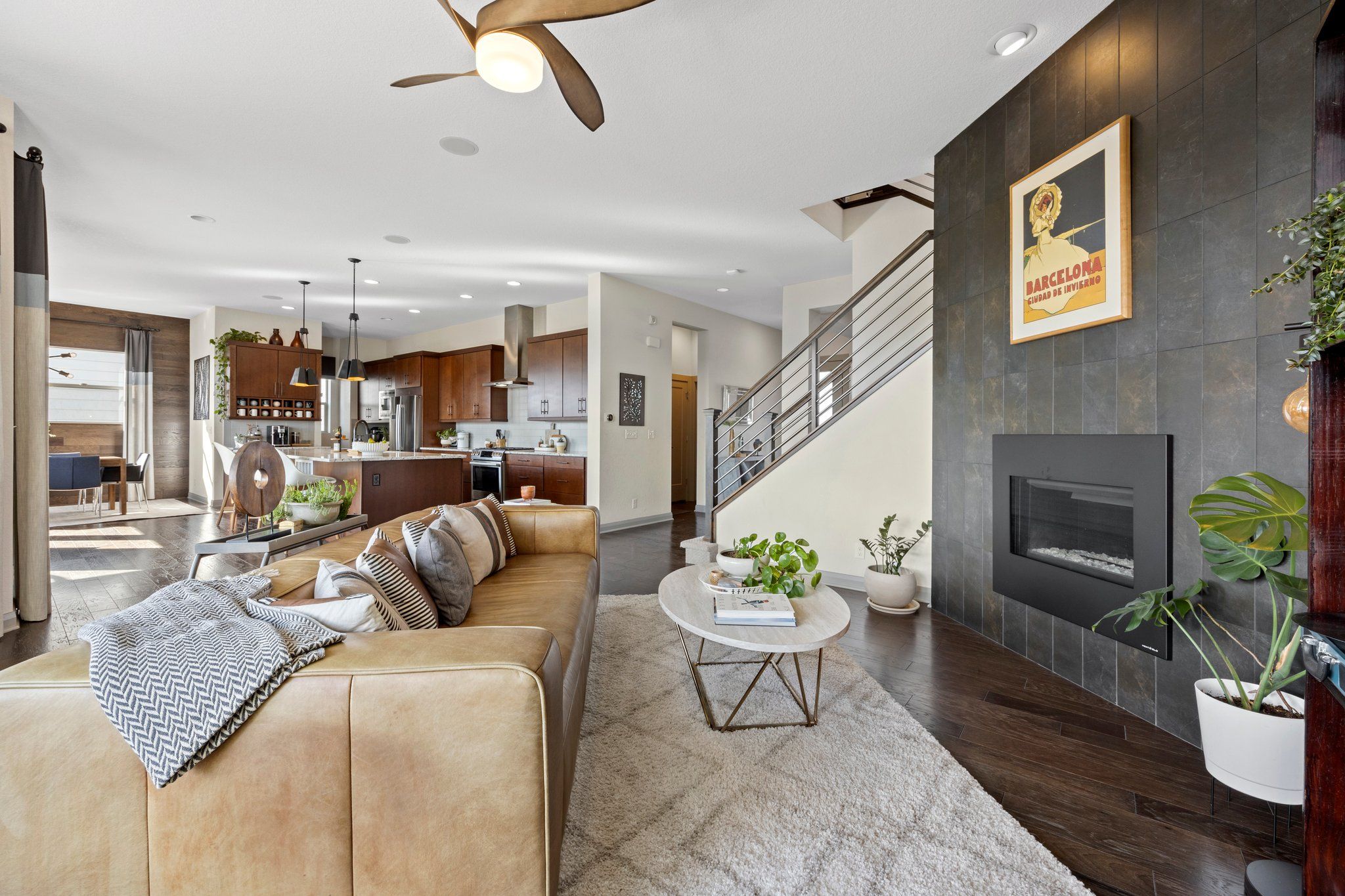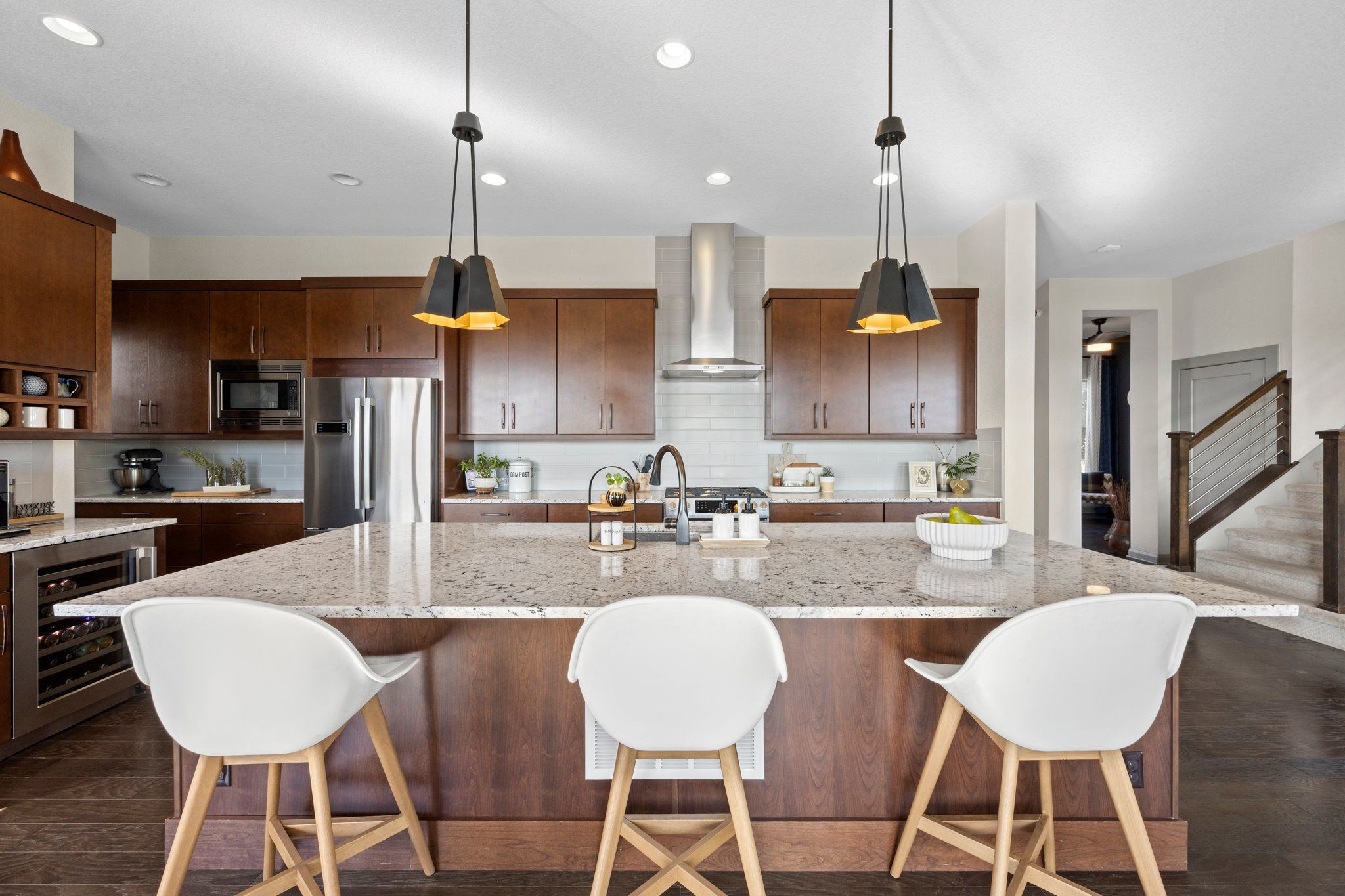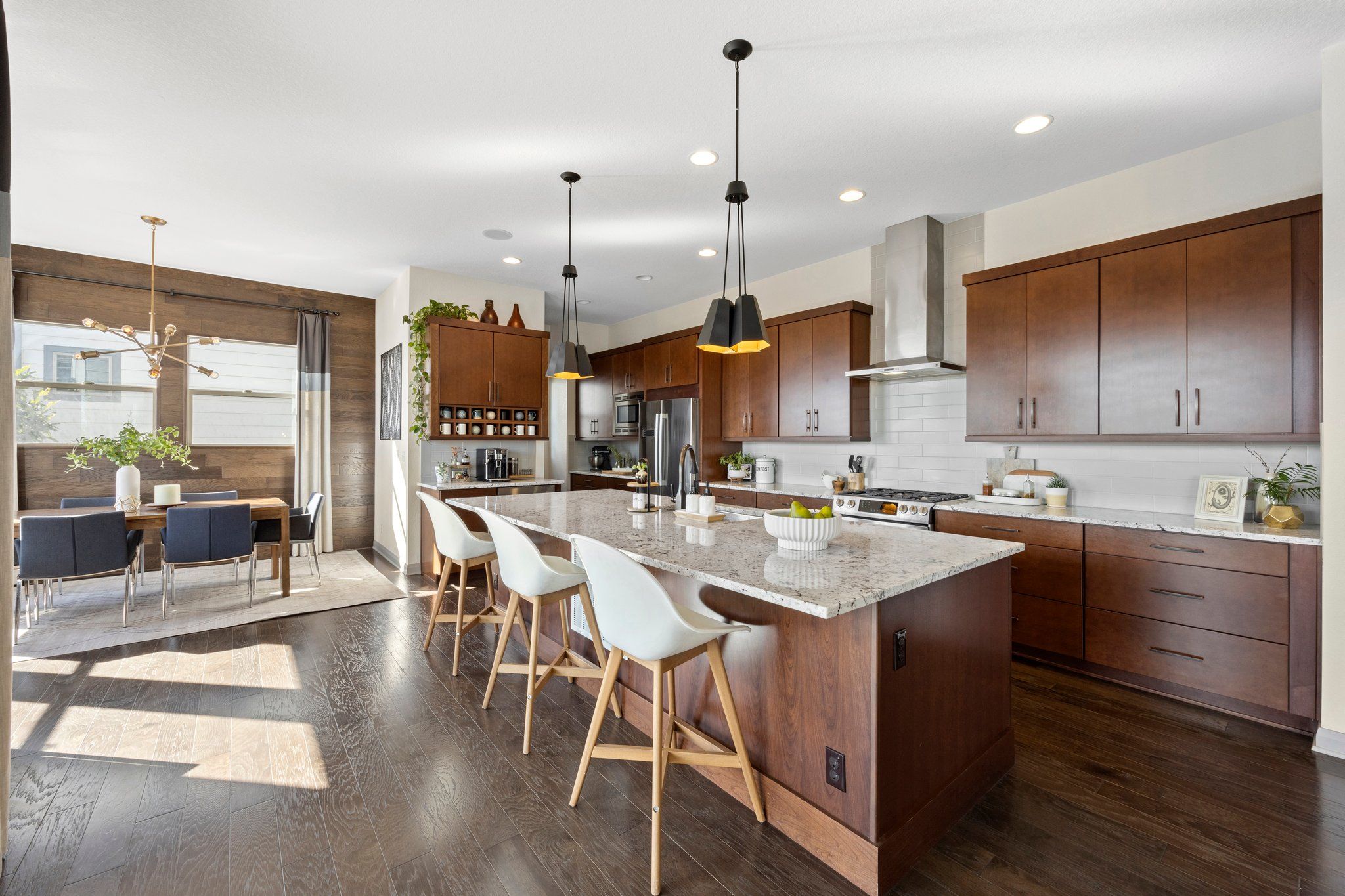 The gourmet kitchen features a large quartz island, stainless steel appliances, pantry, and wine/coffee bar. Upstairs, a spa-like Master Retreat with a large walk-in closet and en-suite bath affords additional privacy A light and bright loft separates the Master from two additional bedrooms and a convenient upstairs laundry with built in storage. The fully finished walk-out basement boasts high ceilings and lots of windows continuing the spacious, open feel with an additional bed, bath, and recreation space. A large yard with a greenbelt just beyond ensures additional privacy and unobstructed views.