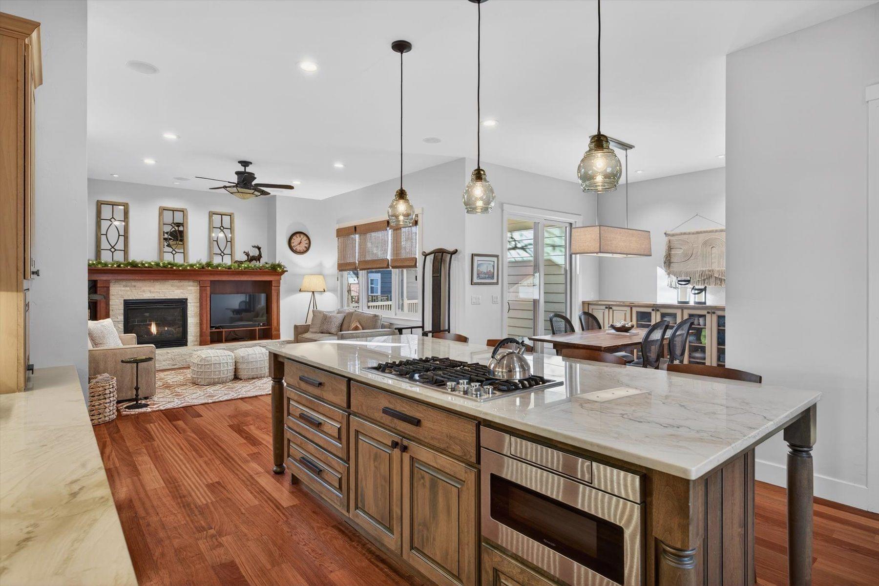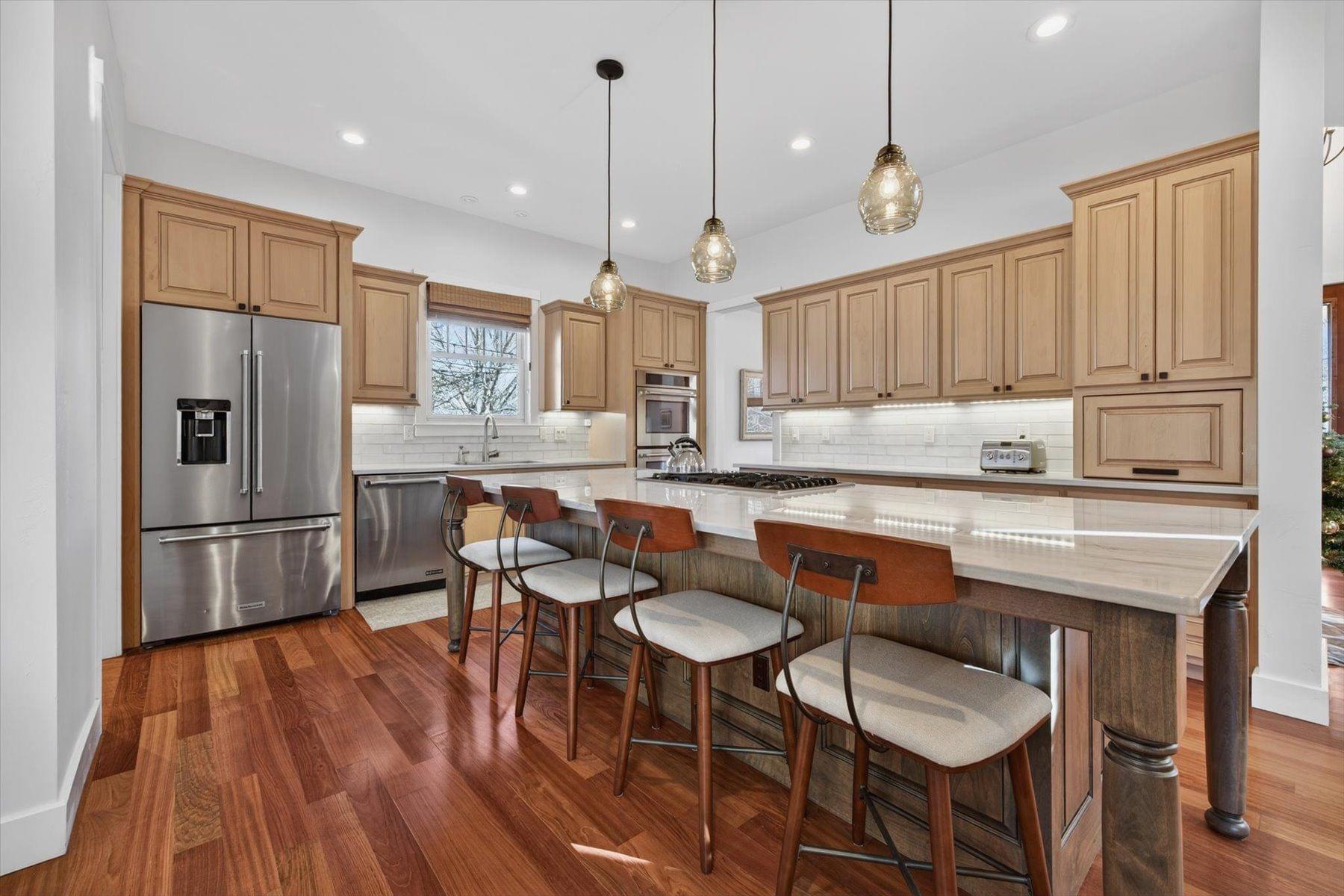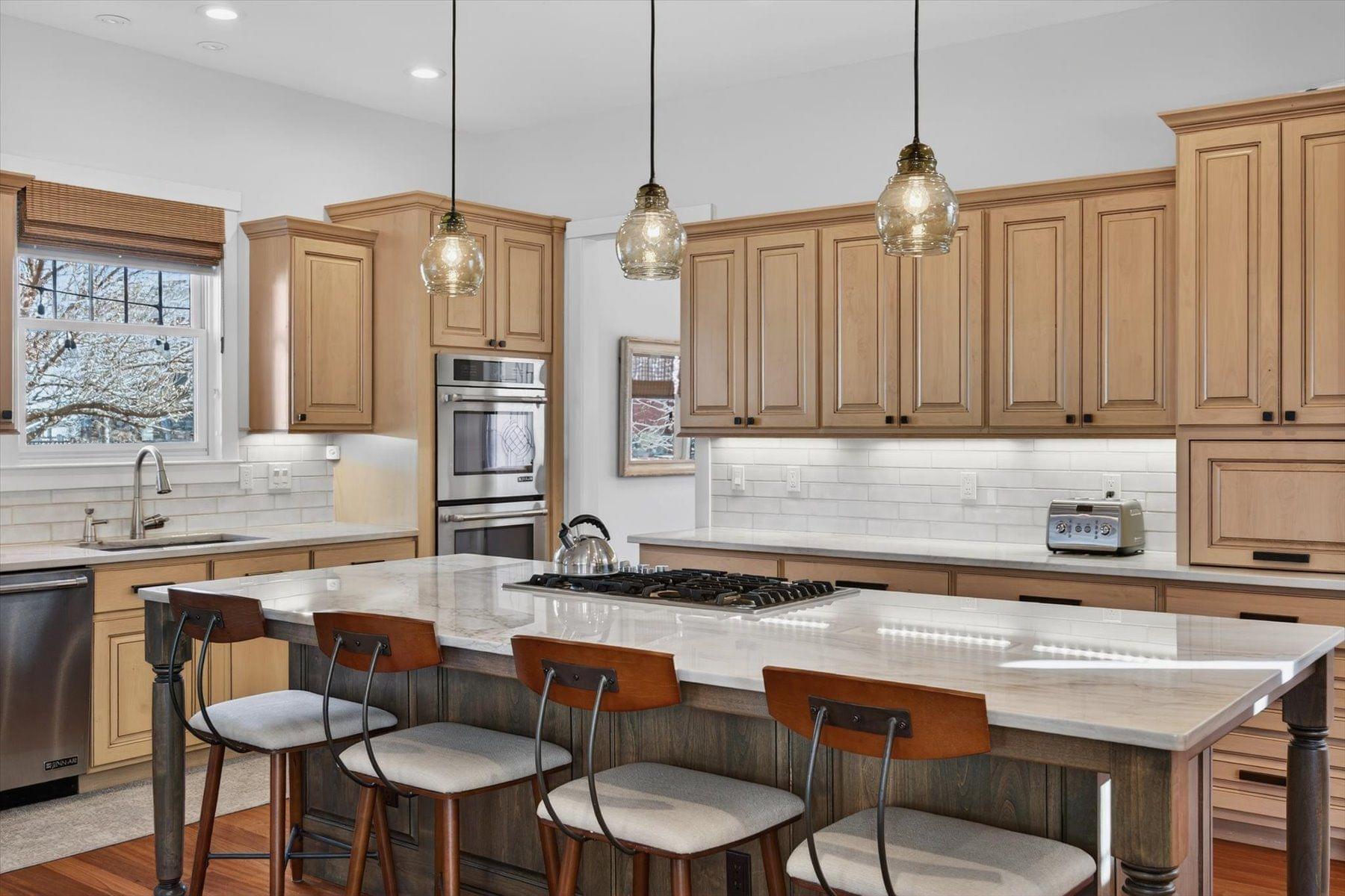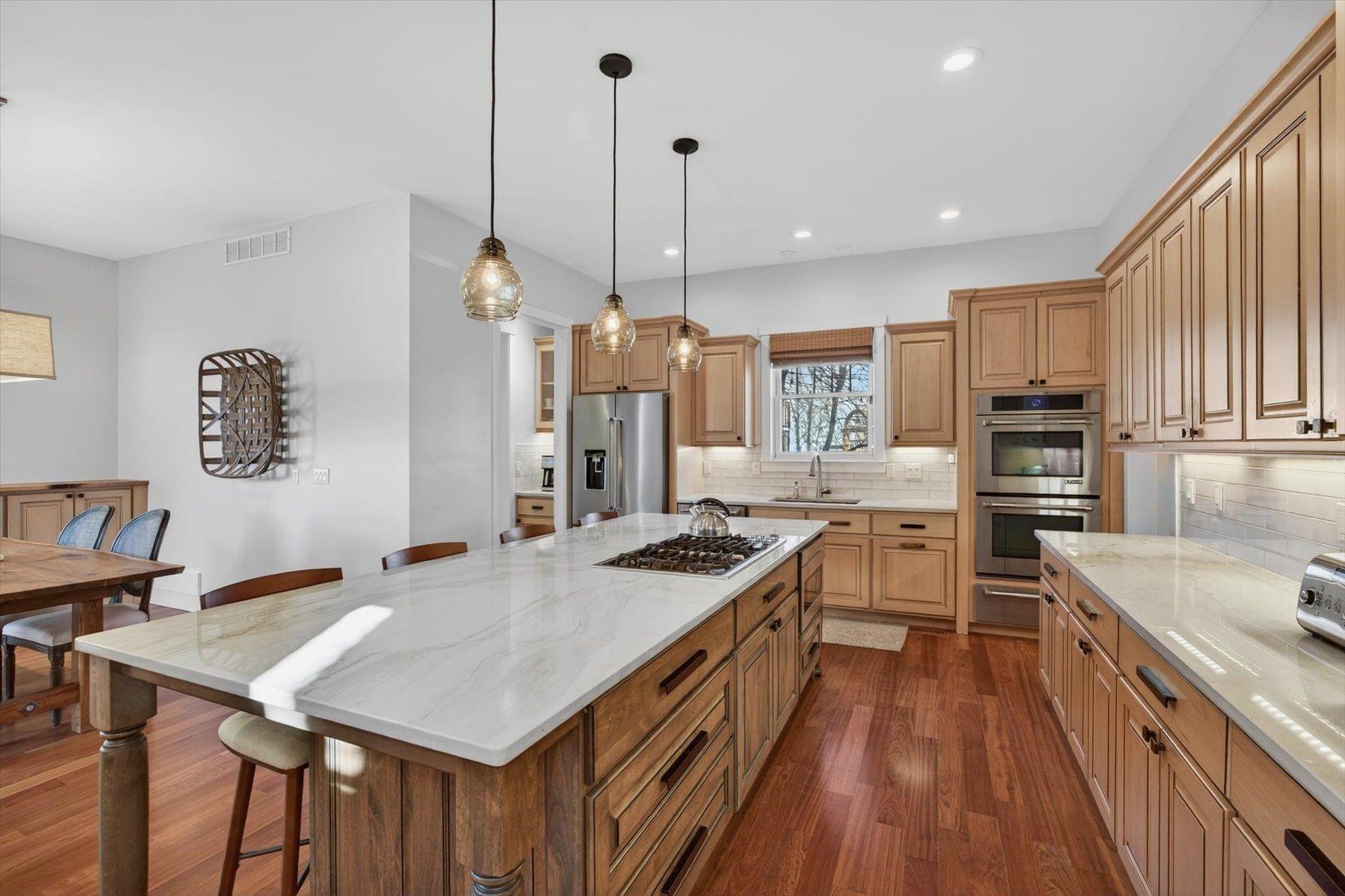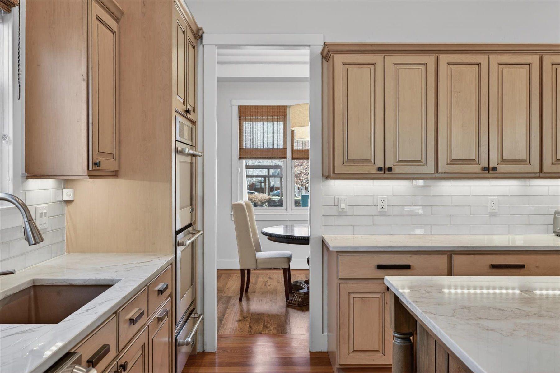 Light-filled interiors are elevated by soaring ceilings, freshly refinished hardwood floors (2024), designer lighting, and crisp baseboard detailing. The heart of the home is a newly remodeled, chef-worthy kitchen featuring custom Shaker cabinetry with crown molding, sleek stainless steel appliances, creamy subway tile backsplash, and a generous quartzite island that anchors the open-concept dining and living spaces.