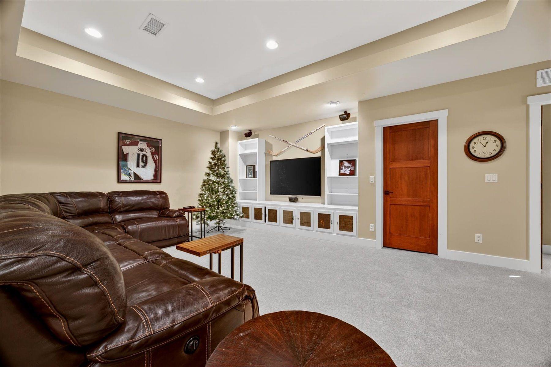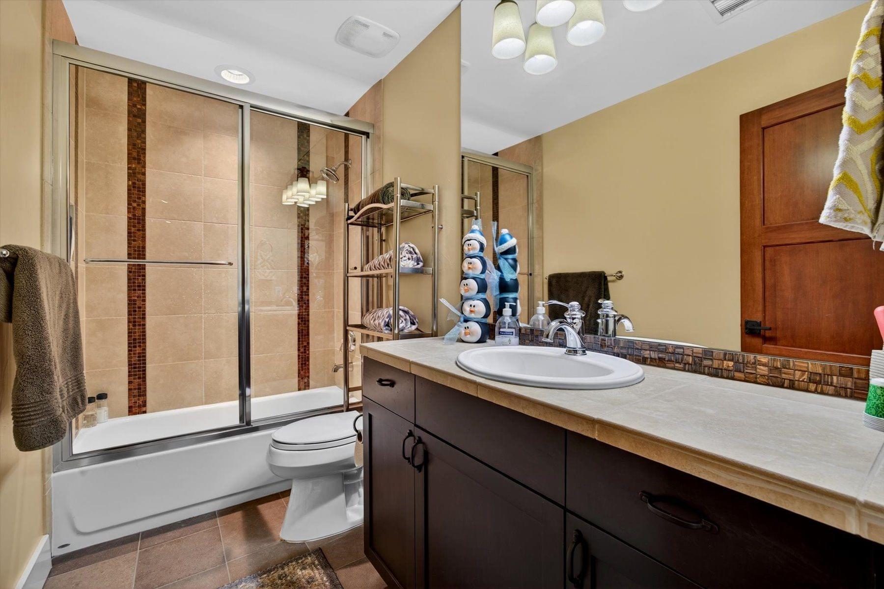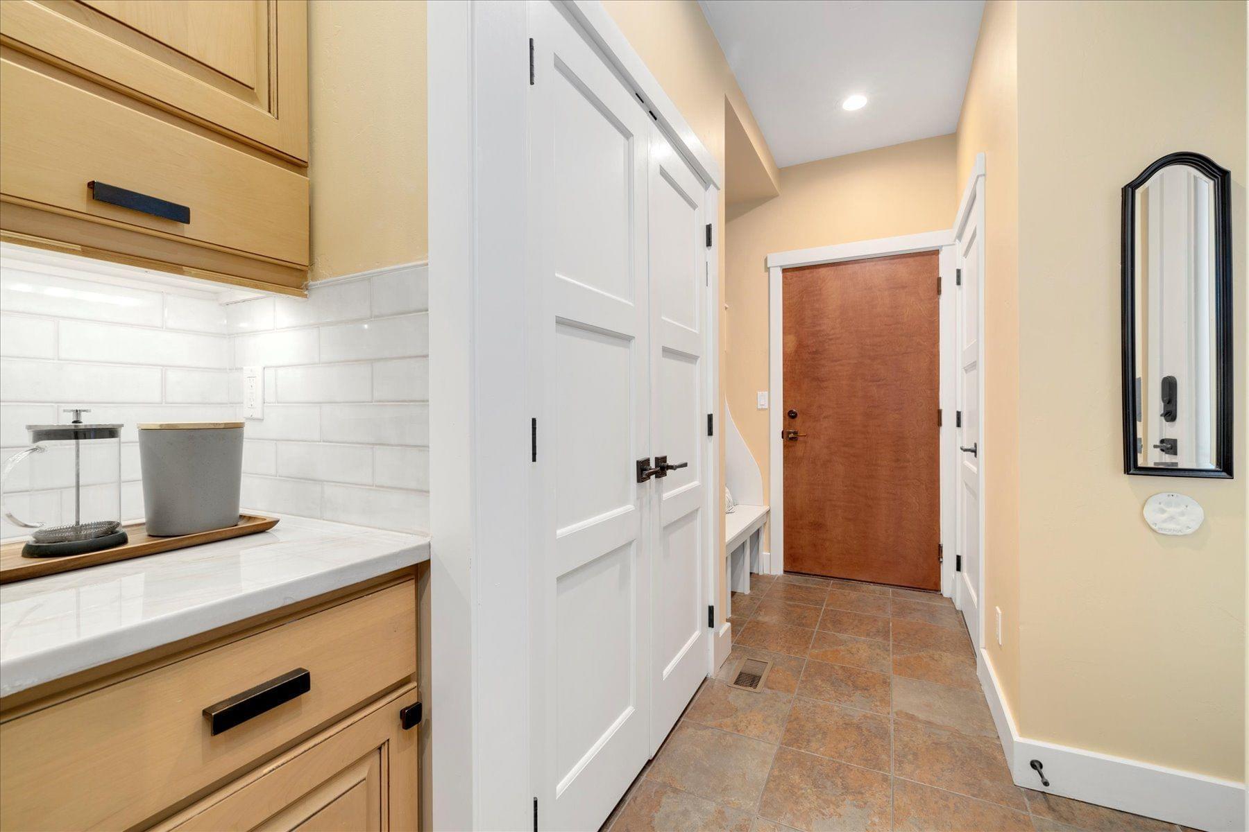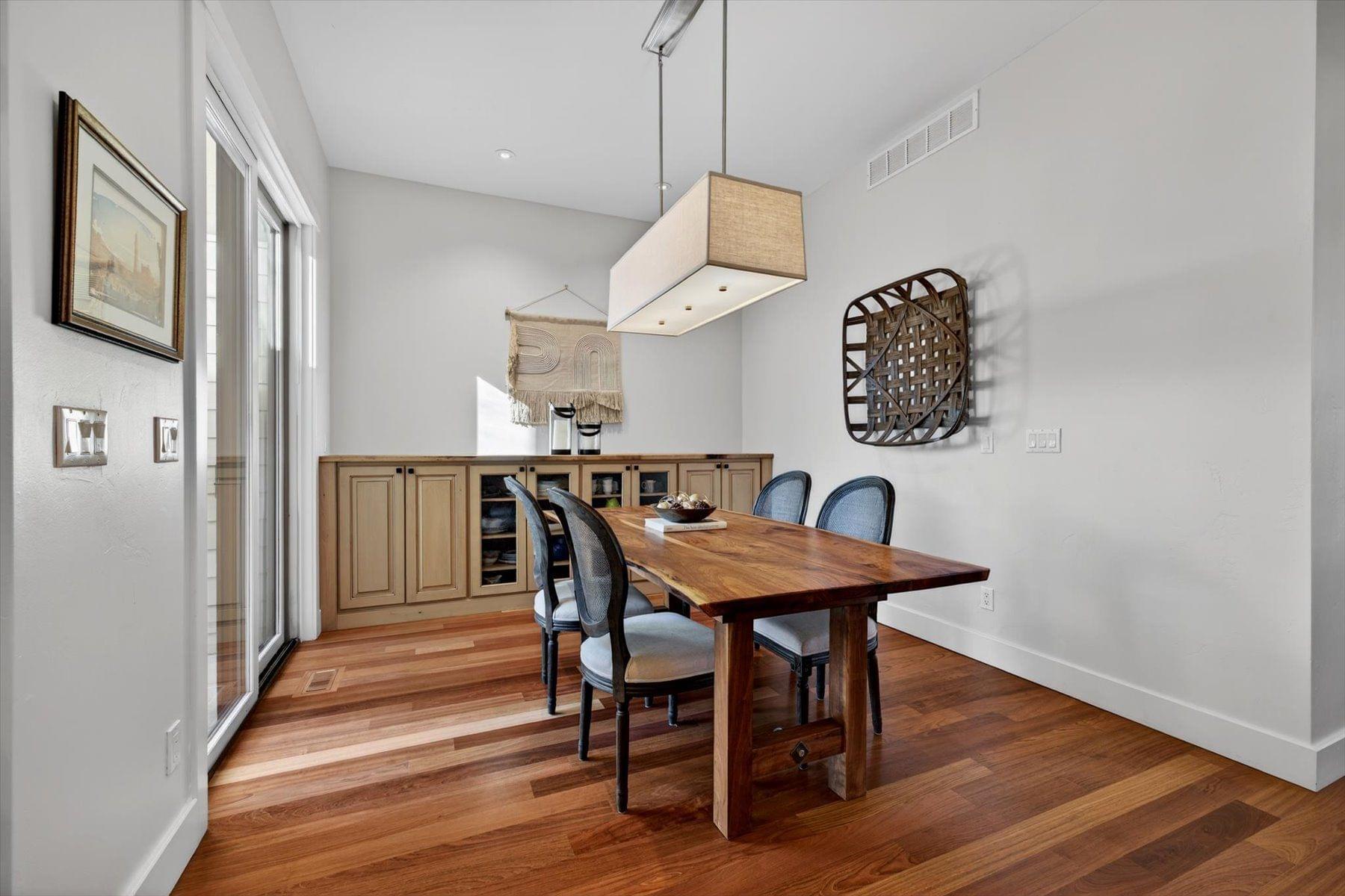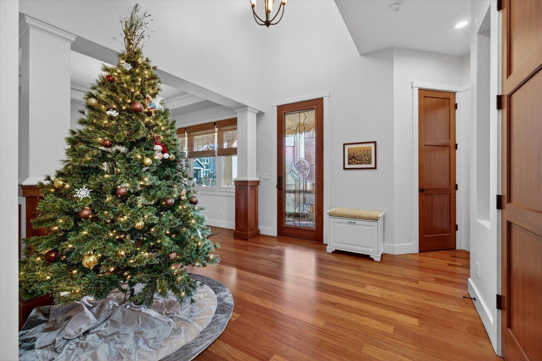 Light-filled interiors are elevated by soaring ceilings, freshly refinished hardwood floors (2024), designer lighting, and crisp baseboard detailing. The heart of the home is a newly remodeled, chef-worthy kitchen featuring custom Shaker cabinetry with crown molding, sleek stainless steel appliances, creamy subway tile backsplash, and a generous quartzite island that anchors the open-concept dining and living spaces.