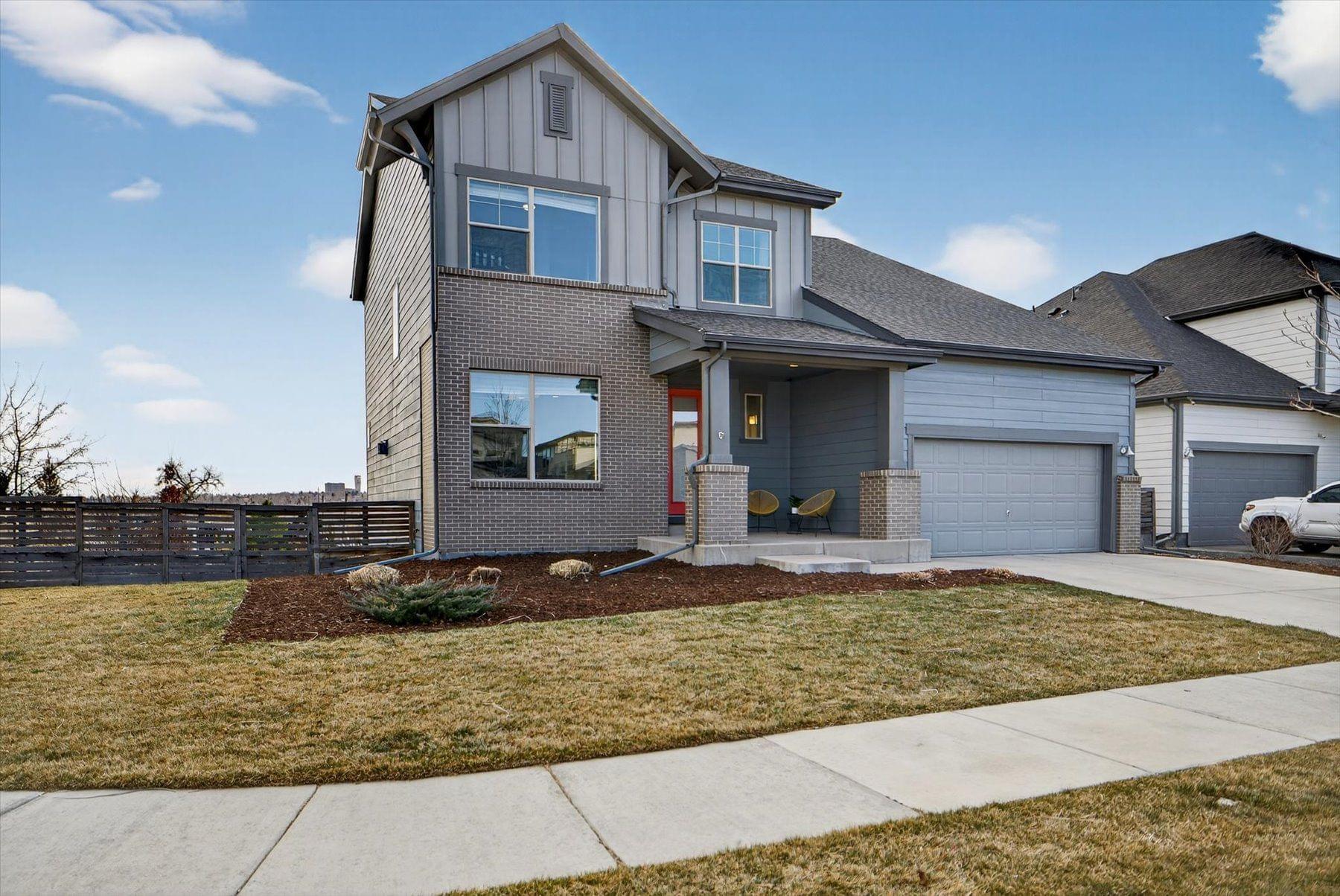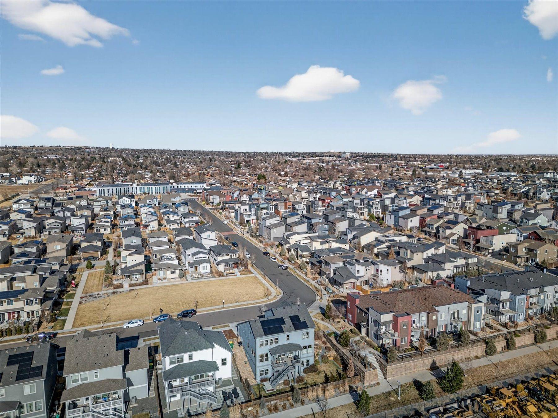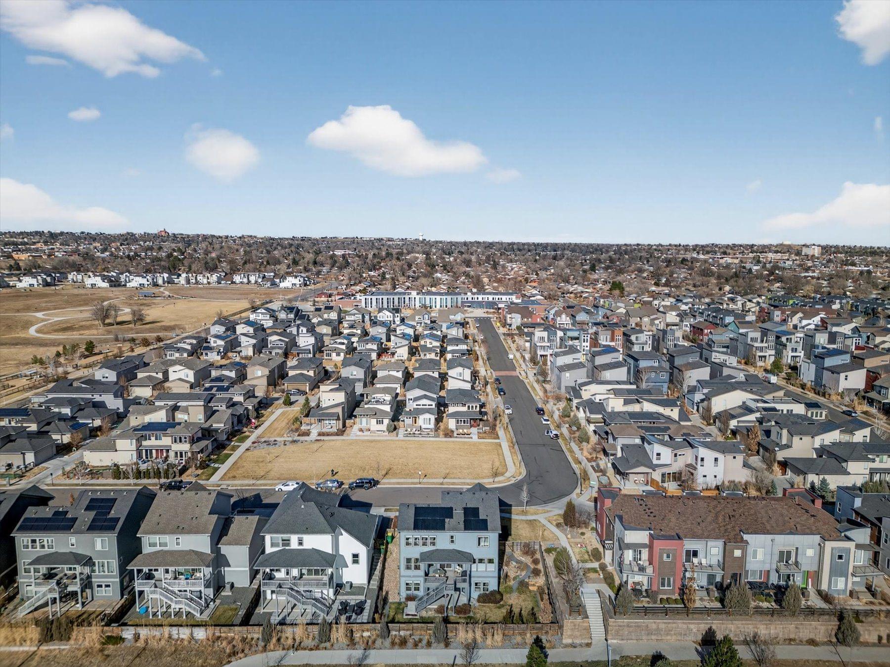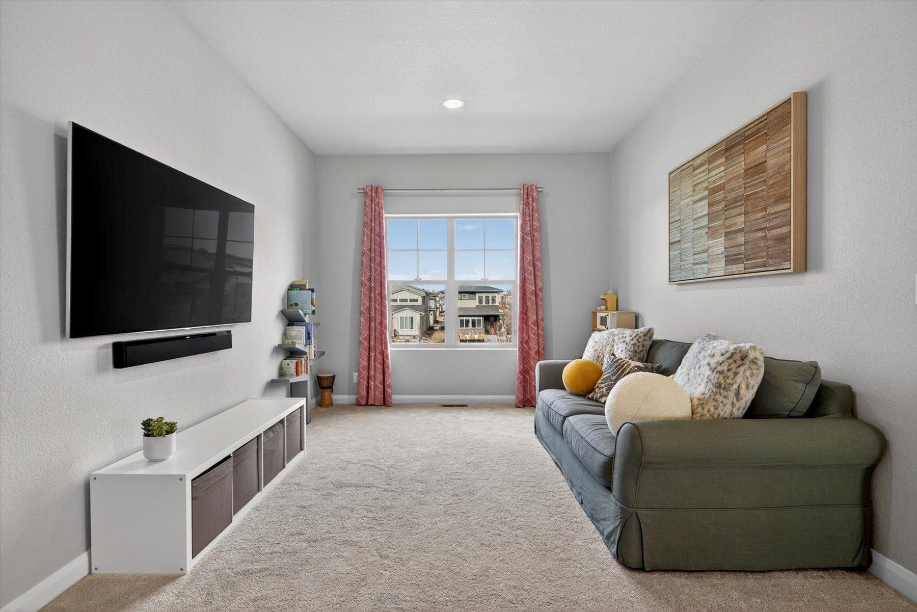 Designed for effortless entertaining, the open-concept main level is anchored by a chef’s kitchen featuring a generous quartz island, stainless steel appliances, gas range, walk-in pantry, custom lighting, and a dedicated wine and coffee bar. Expansive windows and sliding glass doors lead seamlessly to a 15’ x 13’ covered deck, where panoramic views stretch from Downtown Denver to the Front Range, perfect for morning coffee or evening gatherings. Upstairs, the primary suite is a serene retreat with a spa-inspired bath and oversized walk-in closet. A sunlit loft thoughtfully separates the primary bedroom from two additional bedrooms, complemented by an upstairs laundry room with built-in storage for everyday ease.