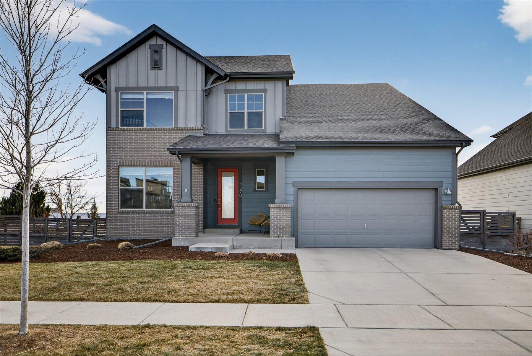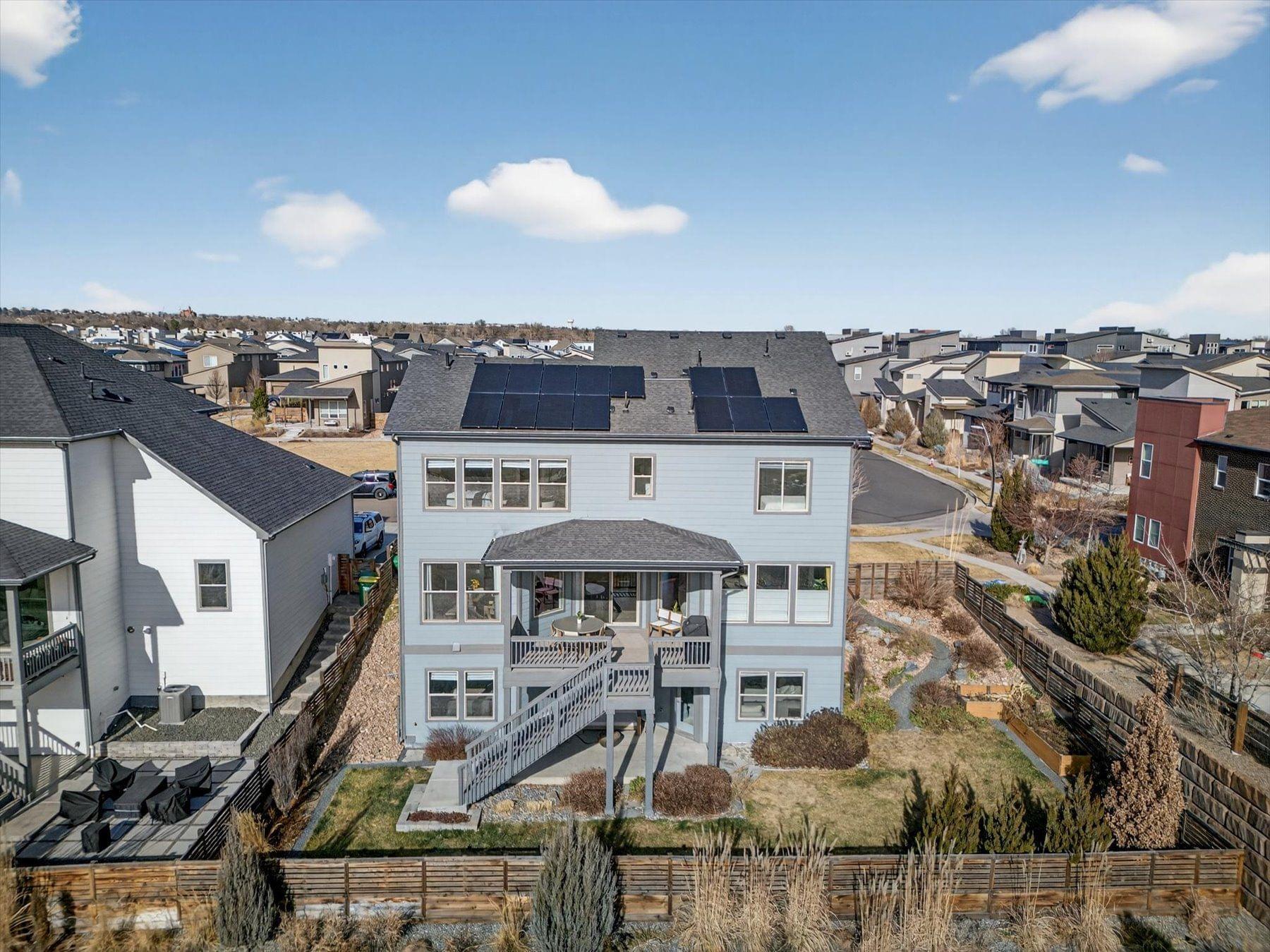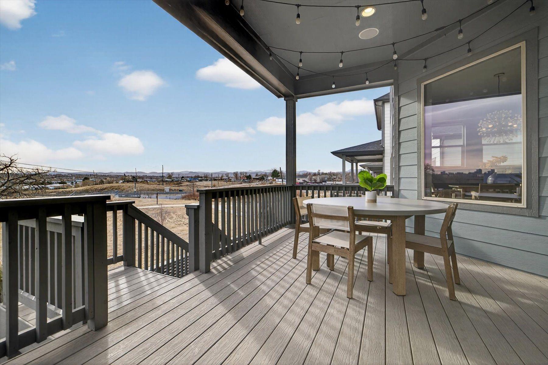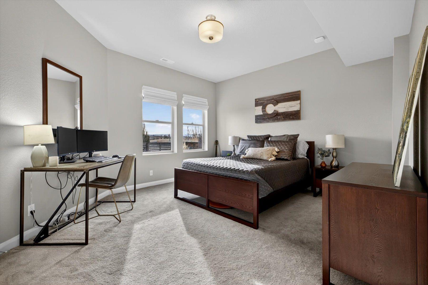 Designed for effortless entertaining, the open-concept main level is anchored by a chef’s kitchen featuring a generous quartz island, stainless steel appliances, gas range, walk-in pantry, custom lighting, and a dedicated wine and coffee bar. Expansive windows and sliding glass doors lead seamlessly to a 15’ x 13’ covered deck, where panoramic views stretch from Downtown Denver to the Front Range, perfect for morning coffee or evening gatherings. Upstairs, the primary suite is a serene retreat with a spa-inspired bath and oversized walk-in closet. A sunlit loft thoughtfully separates the primary bedroom from two additional bedrooms, complemented by an upstairs laundry room with built-in storage for everyday ease.