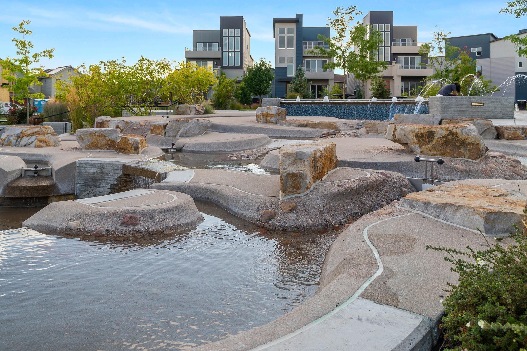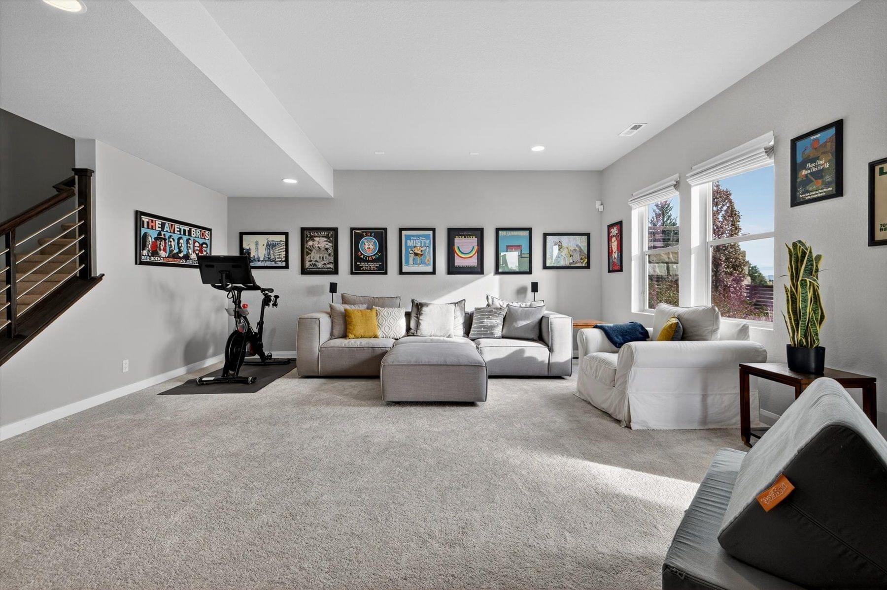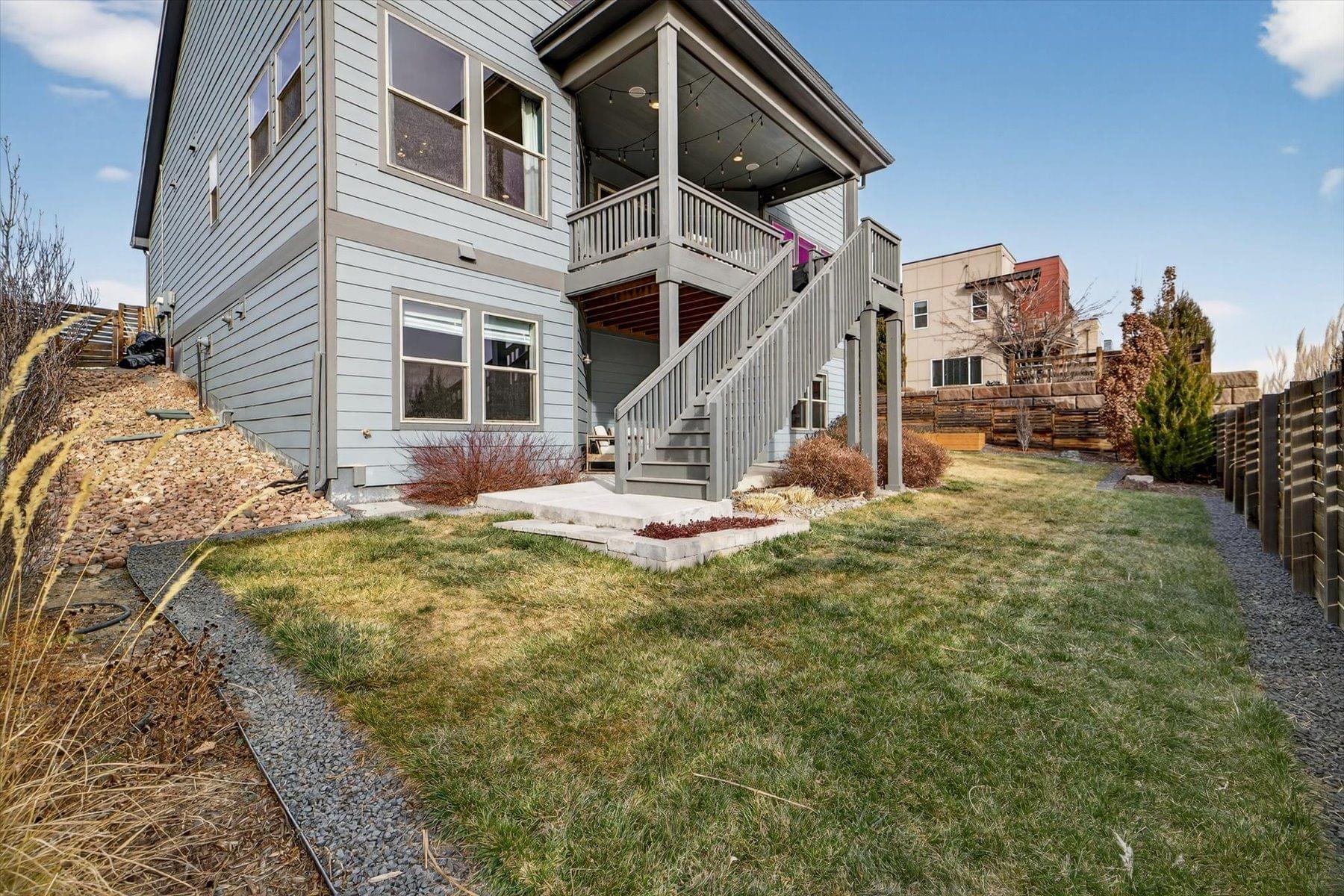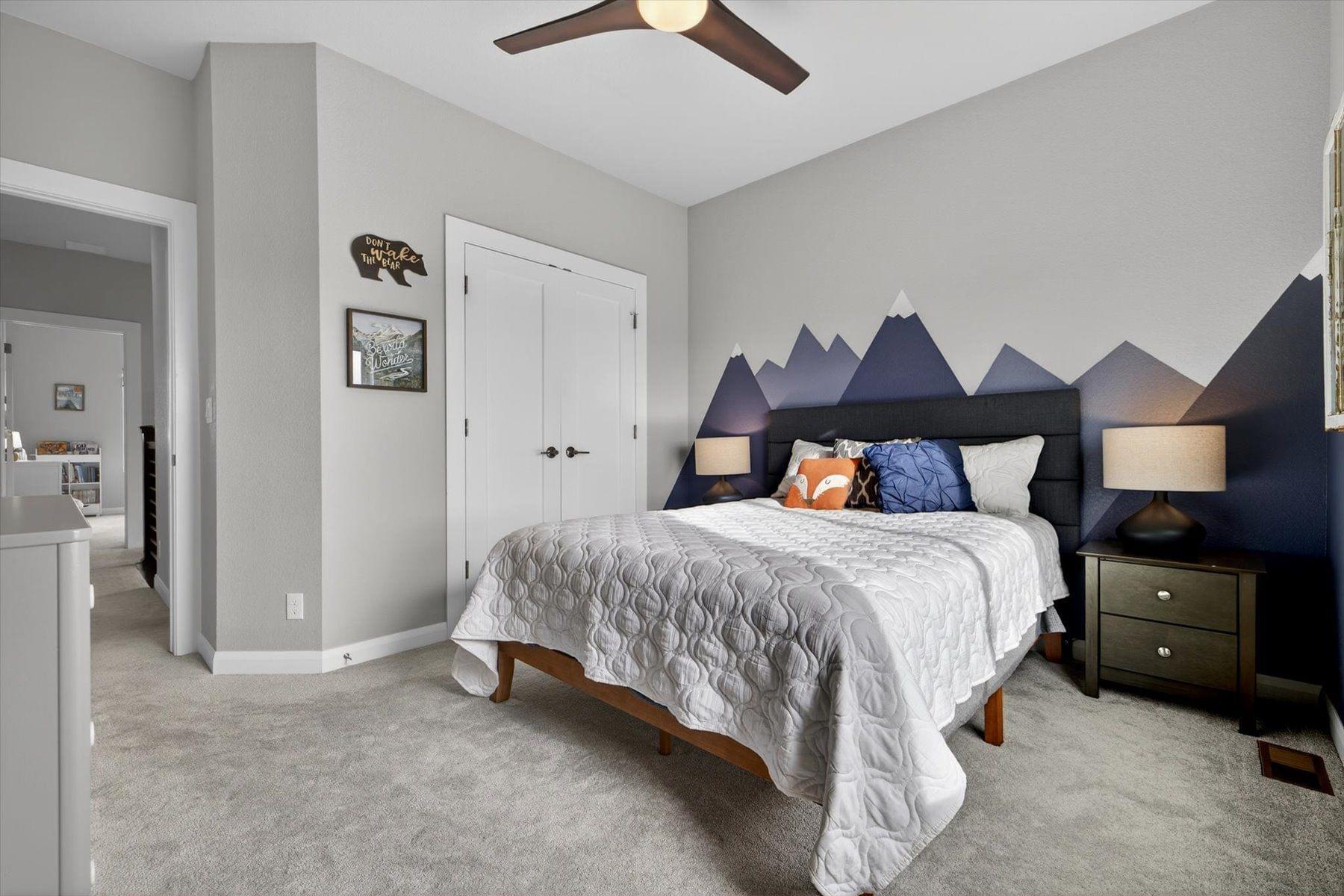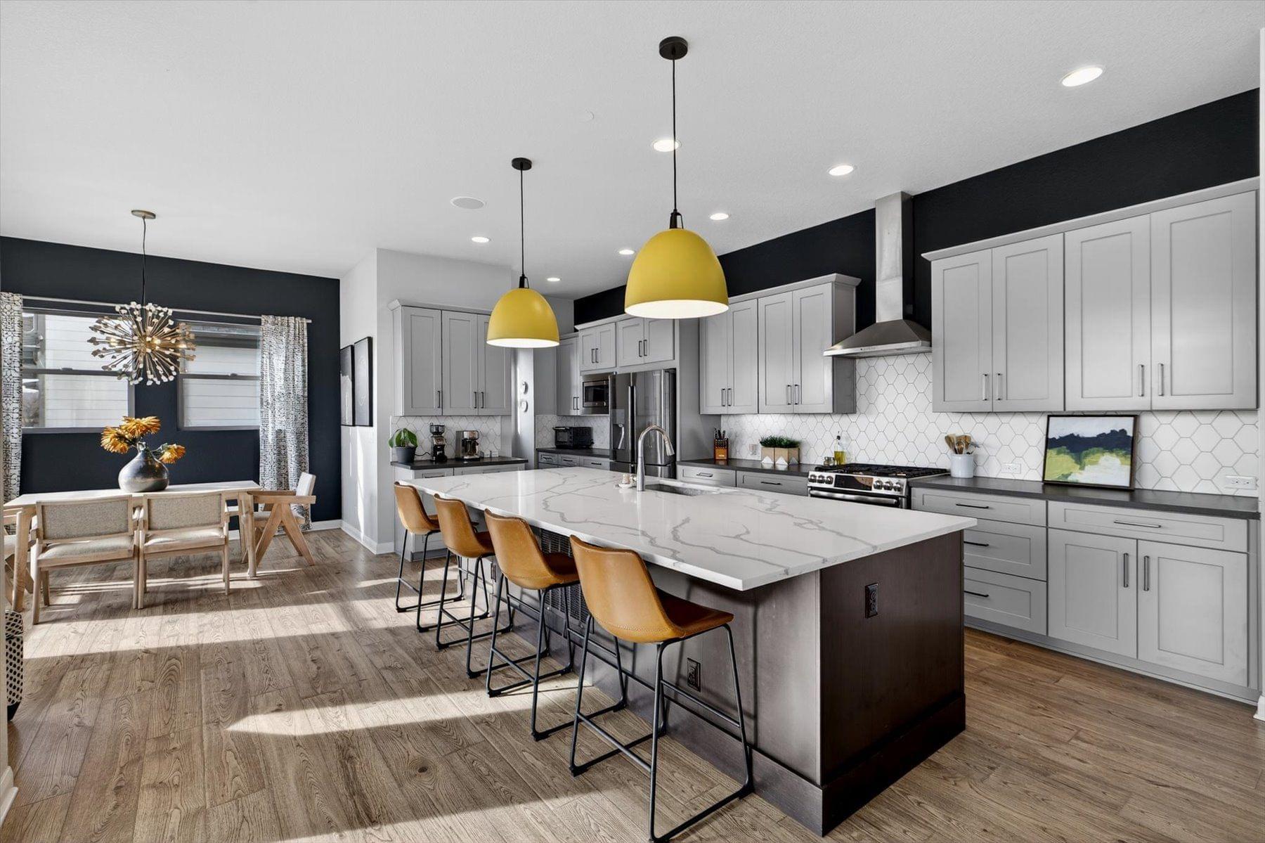Designed for effortless entertaining, the open-concept main level is anchored by a chef’s kitchen featuring a generous quartz island, stainless steel appliances, gas range, walk-in pantry, custom lighting, and a dedicated wine and coffee bar. Expansive windows and sliding glass doors lead seamlessly to a 15’ x 13’ covered deck, where panoramic views stretch from Downtown Denver to the Front Range, perfect for morning coffee or evening gatherings. Upstairs, the primary suite is a serene retreat with a spa-inspired bath and oversized walk-in closet. A sunlit loft thoughtfully separates the primary bedroom from two additional bedrooms, complemented by an upstairs laundry room with built-in storage for everyday ease.
