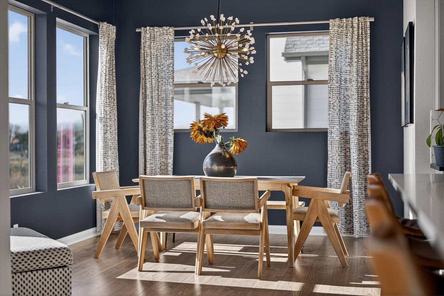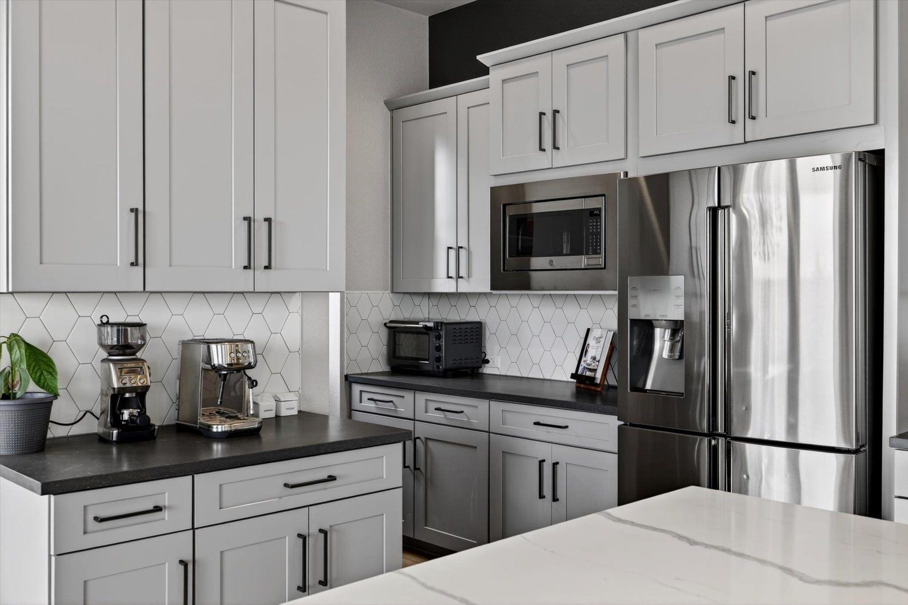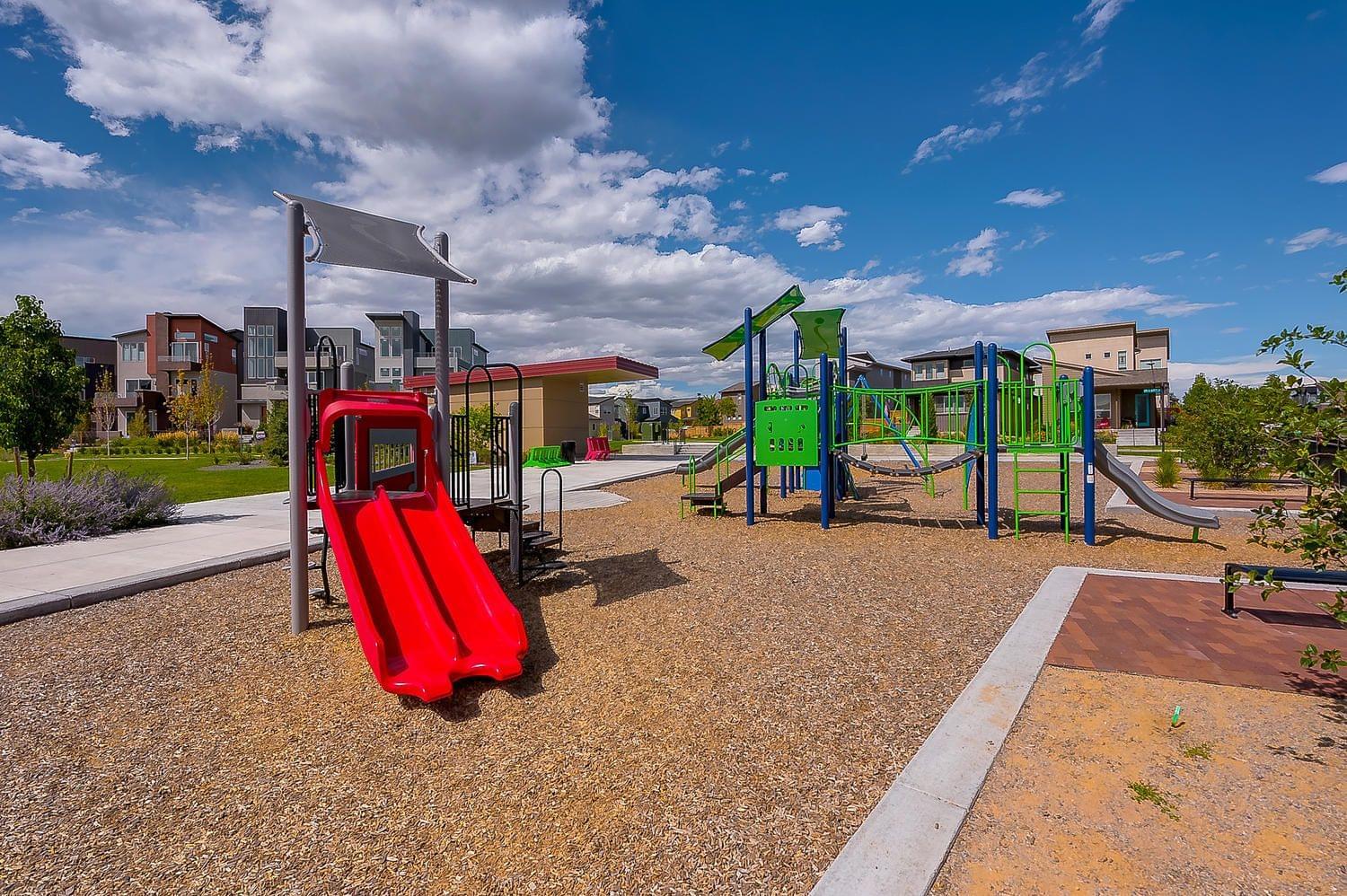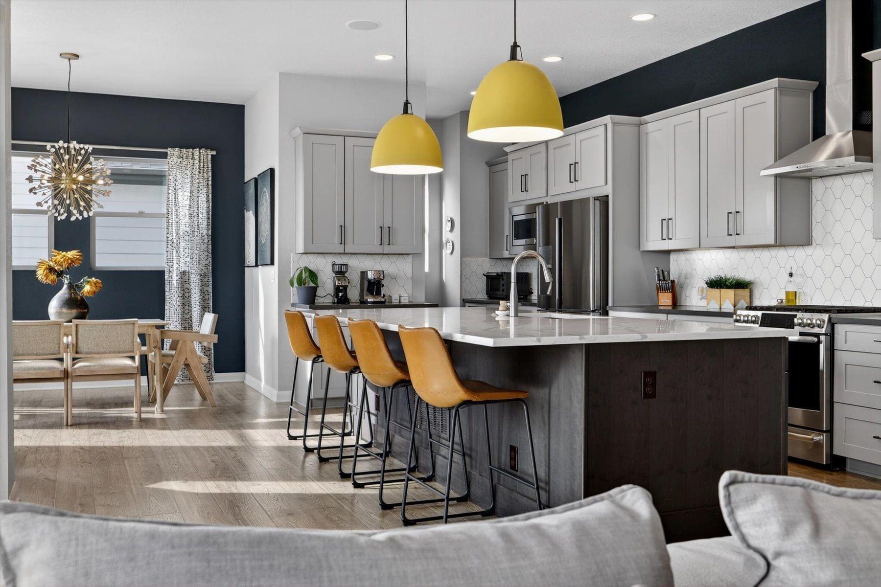Designed for effortless entertaining, the open-concept main level is anchored by a chef’s kitchen featuring a generous quartz island, stainless steel appliances, gas range, walk-in pantry, custom lighting, and a dedicated wine and coffee bar. Expansive windows and sliding glass doors lead seamlessly to a 15’ x 13’ covered deck, where panoramic views stretch from Downtown Denver to the Front Range, perfect for morning coffee or evening gatherings. Upstairs, the primary suite is a serene retreat with a spa-inspired bath and oversized walk-in closet. A sunlit loft thoughtfully separates the primary bedroom from two additional bedrooms, complemented by an upstairs laundry room with built-in storage for everyday ease.