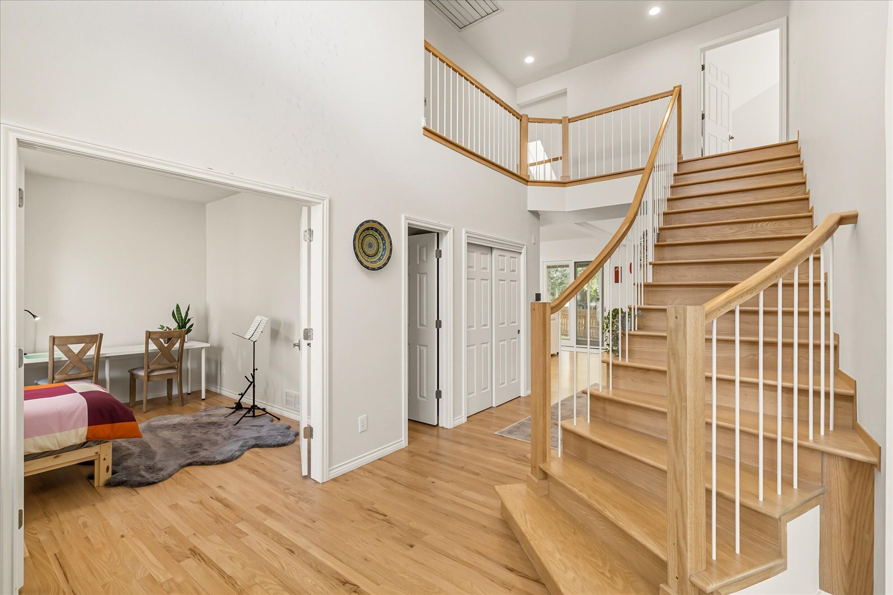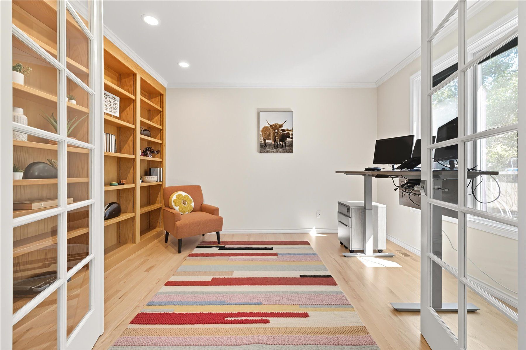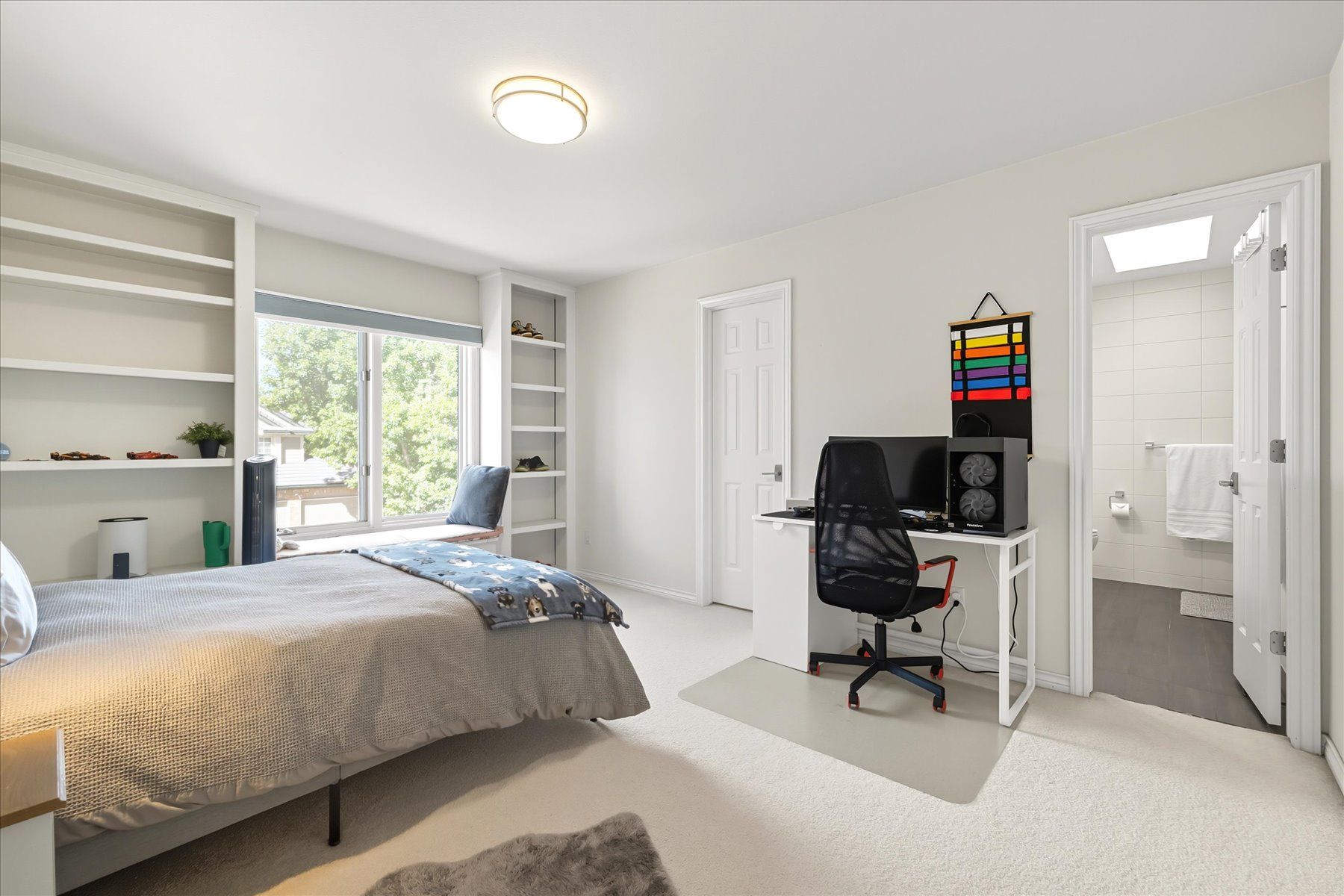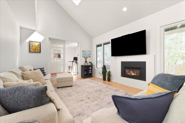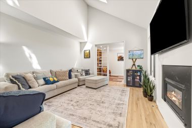 On the main level, updated Pella windows, vaulted ceilings, and skylights bathe oversized living areas in natural light. Daily life flows from the eat-in kitchen to the main living room with a thermostat-controlled gas fireplace, a dedicated home office, and formal living and dining rooms. A versatile main-level bedroom serves beautifully as guest quarters, a second office, or playroom.