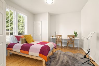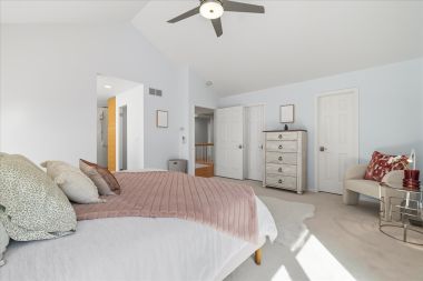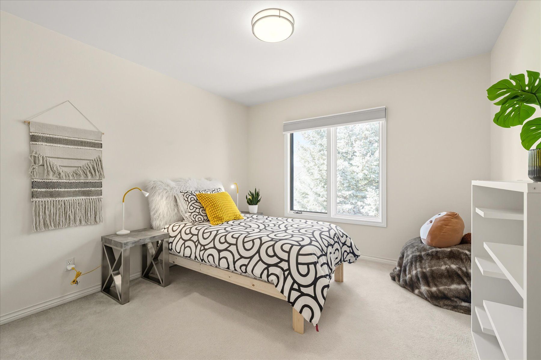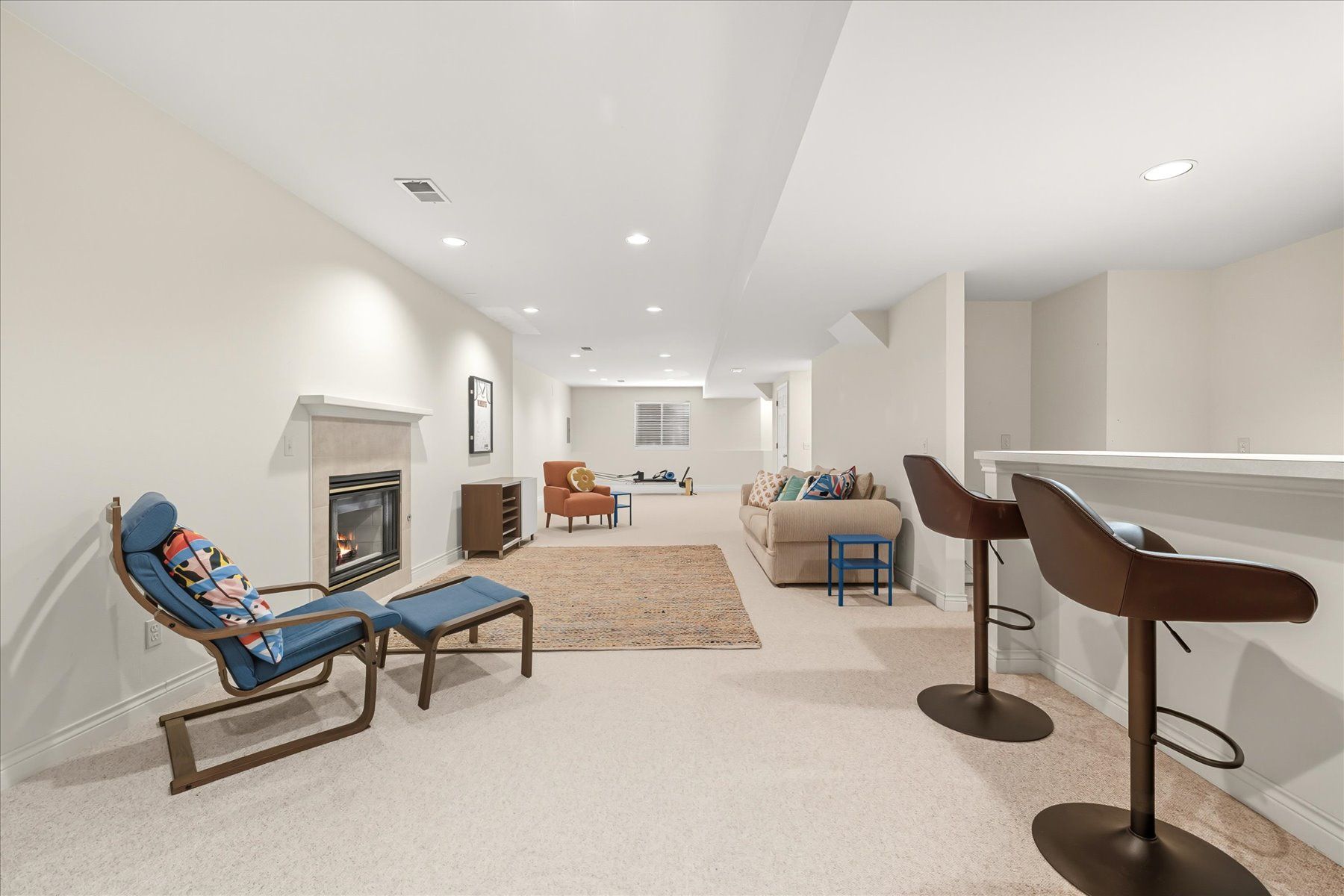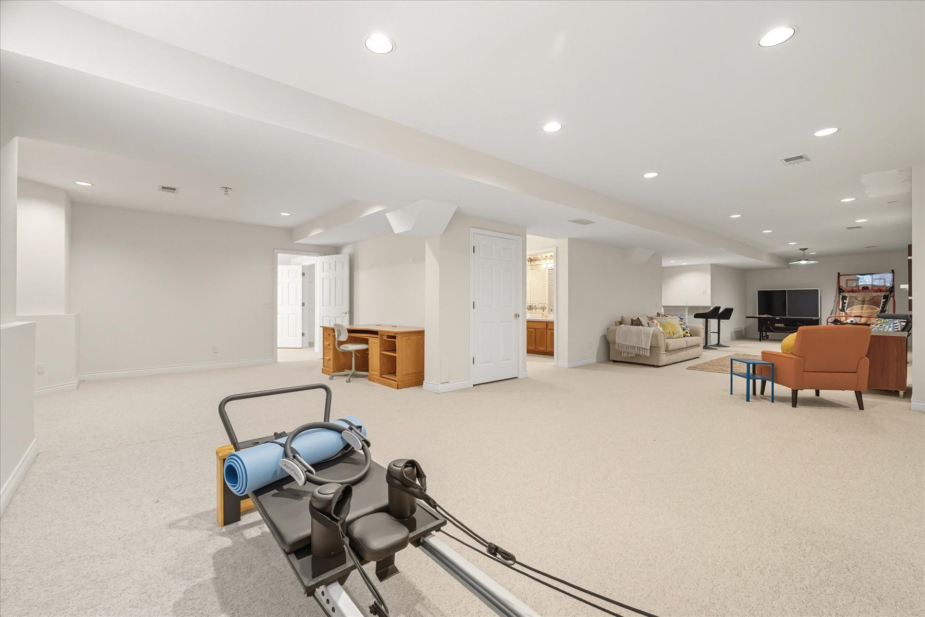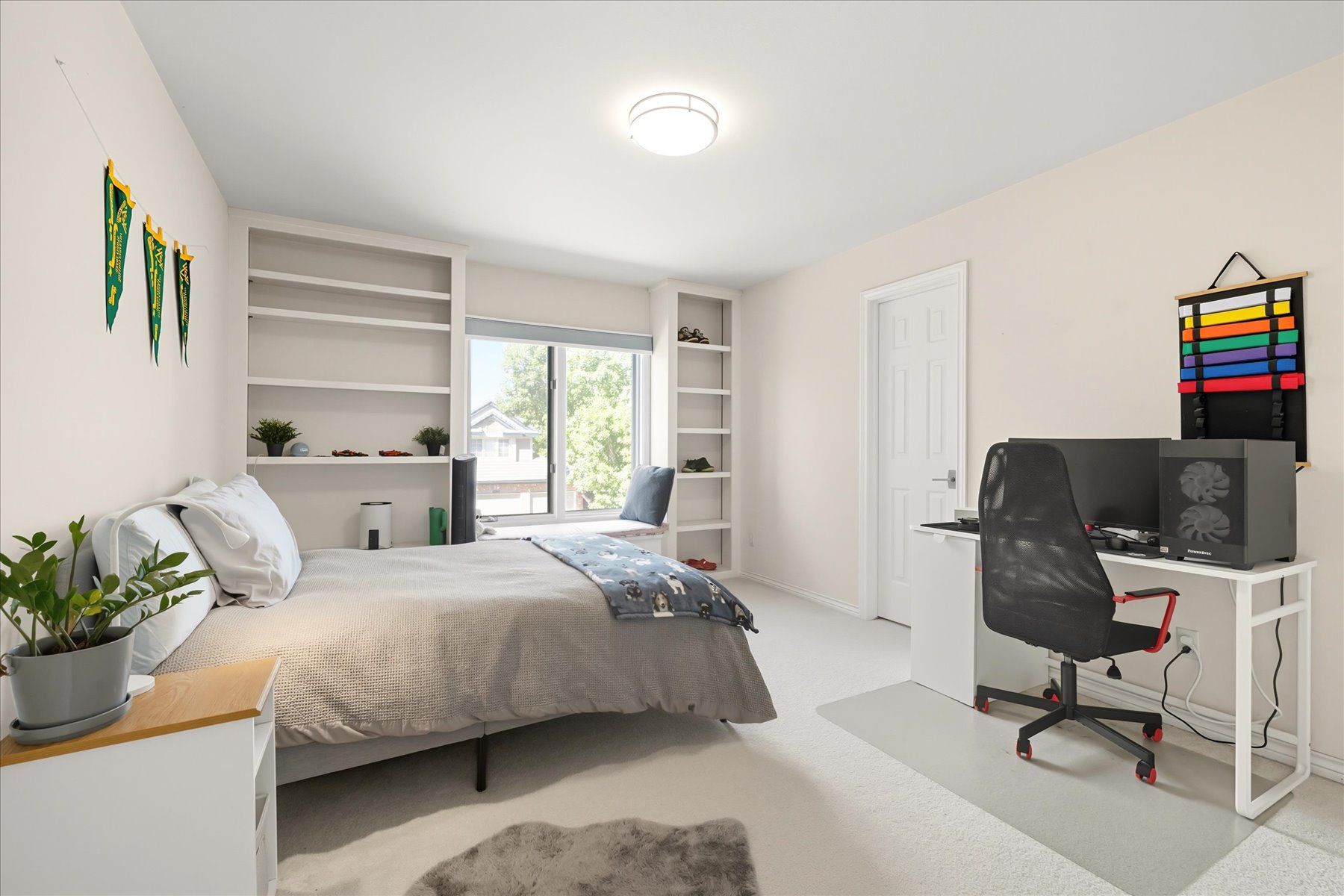 On the main level, updated Pella windows, vaulted ceilings, and skylights bathe oversized living areas in natural light. Daily life flows from the eat-in kitchen to the main living room with a thermostat-controlled gas fireplace, a dedicated home office, and formal living and dining rooms. A versatile main-level bedroom serves beautifully as guest quarters, a second office, or playroom.