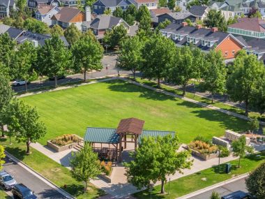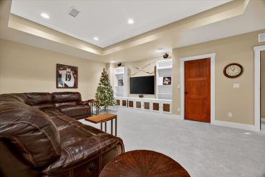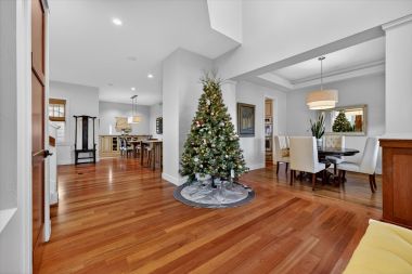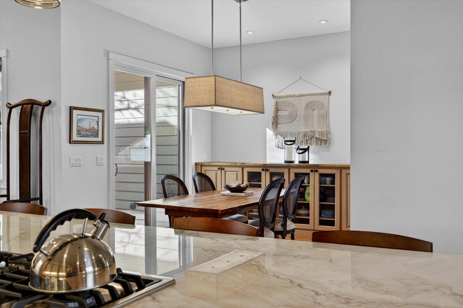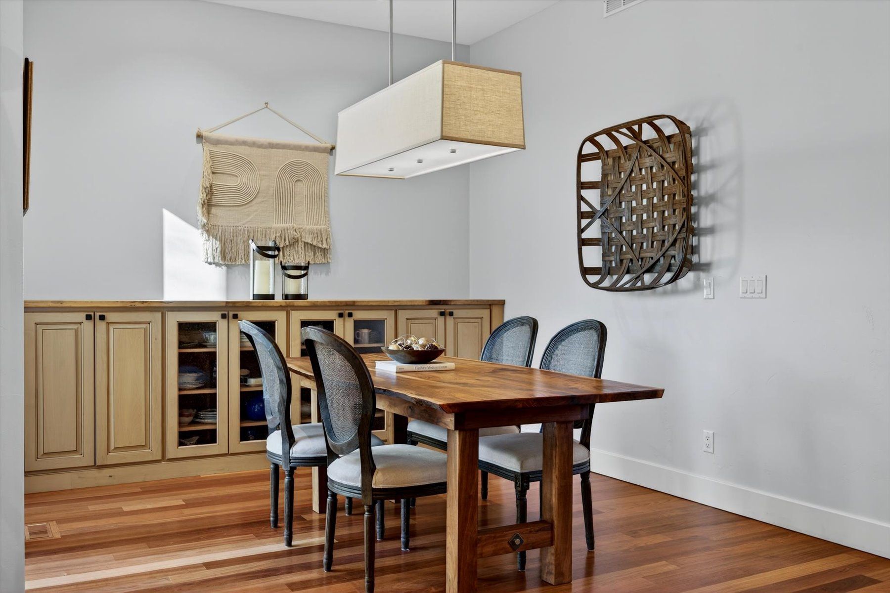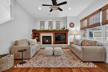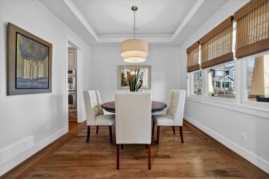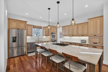 Light-filled interiors are elevated by soaring ceilings, freshly refinished hardwood floors (2024), designer lighting, and crisp baseboard detailing. The heart of the home is a newly remodeled, chef-worthy kitchen featuring custom Shaker cabinetry with crown molding, sleek stainless steel appliances, creamy subway tile backsplash, and a generous quartzite island that anchors the open-concept dining and living spaces.