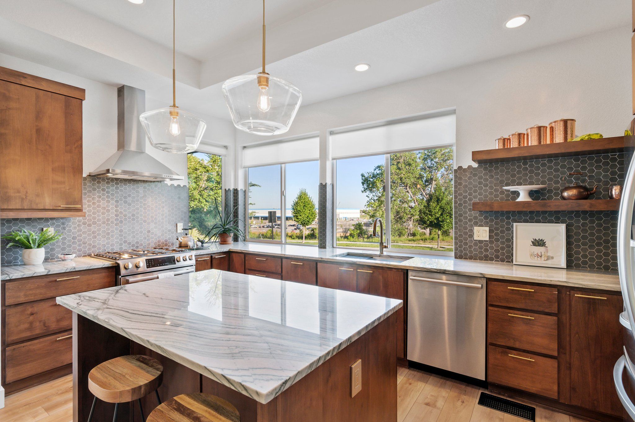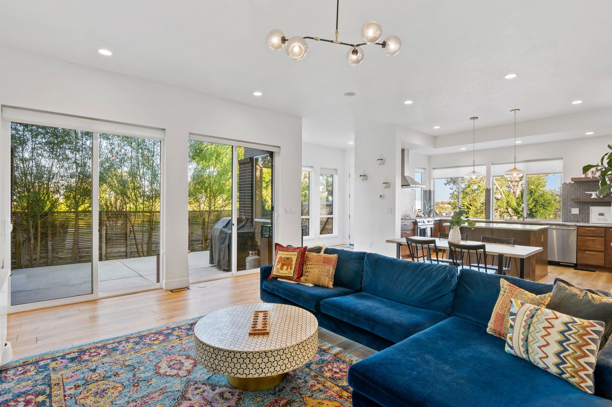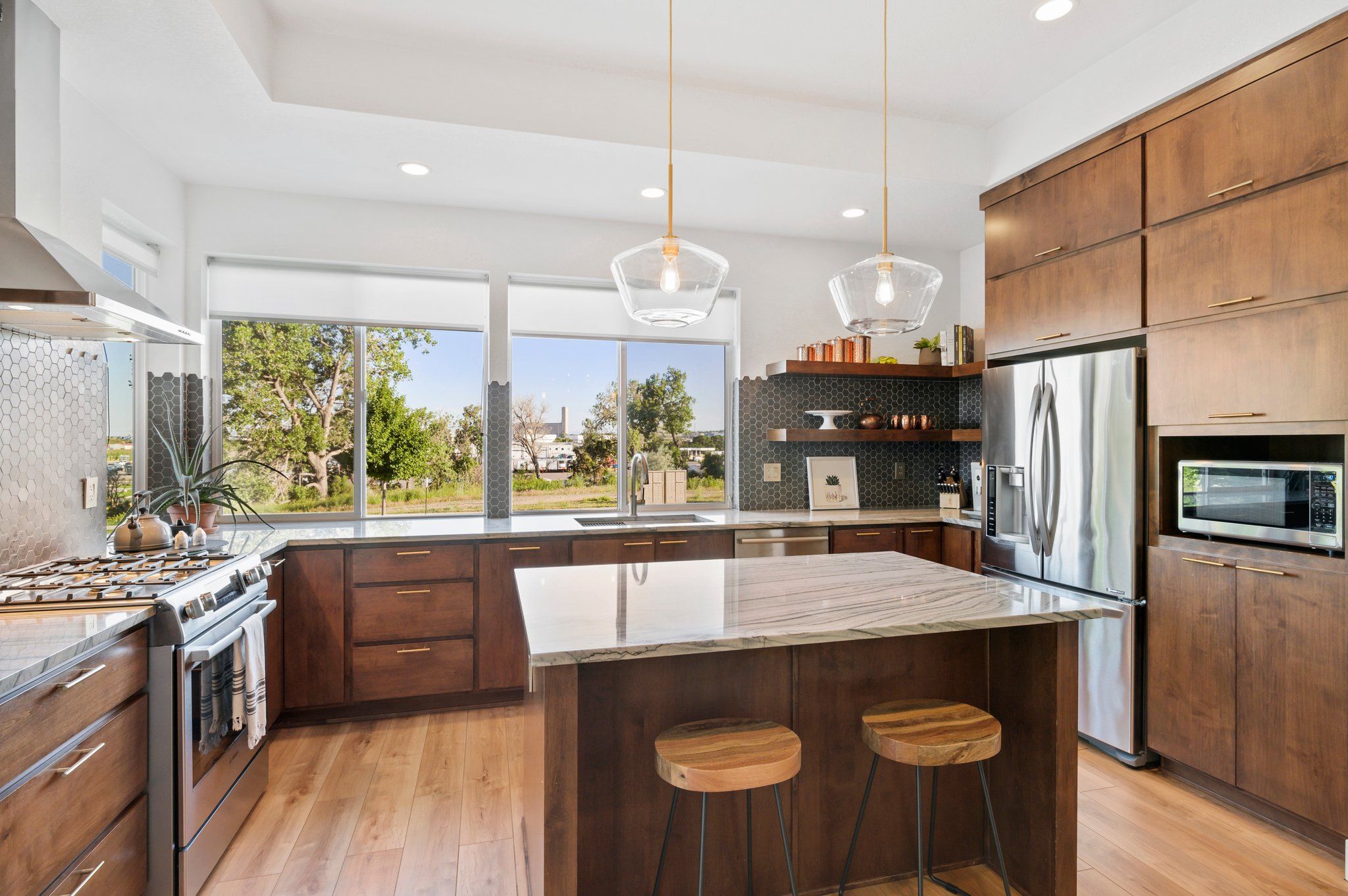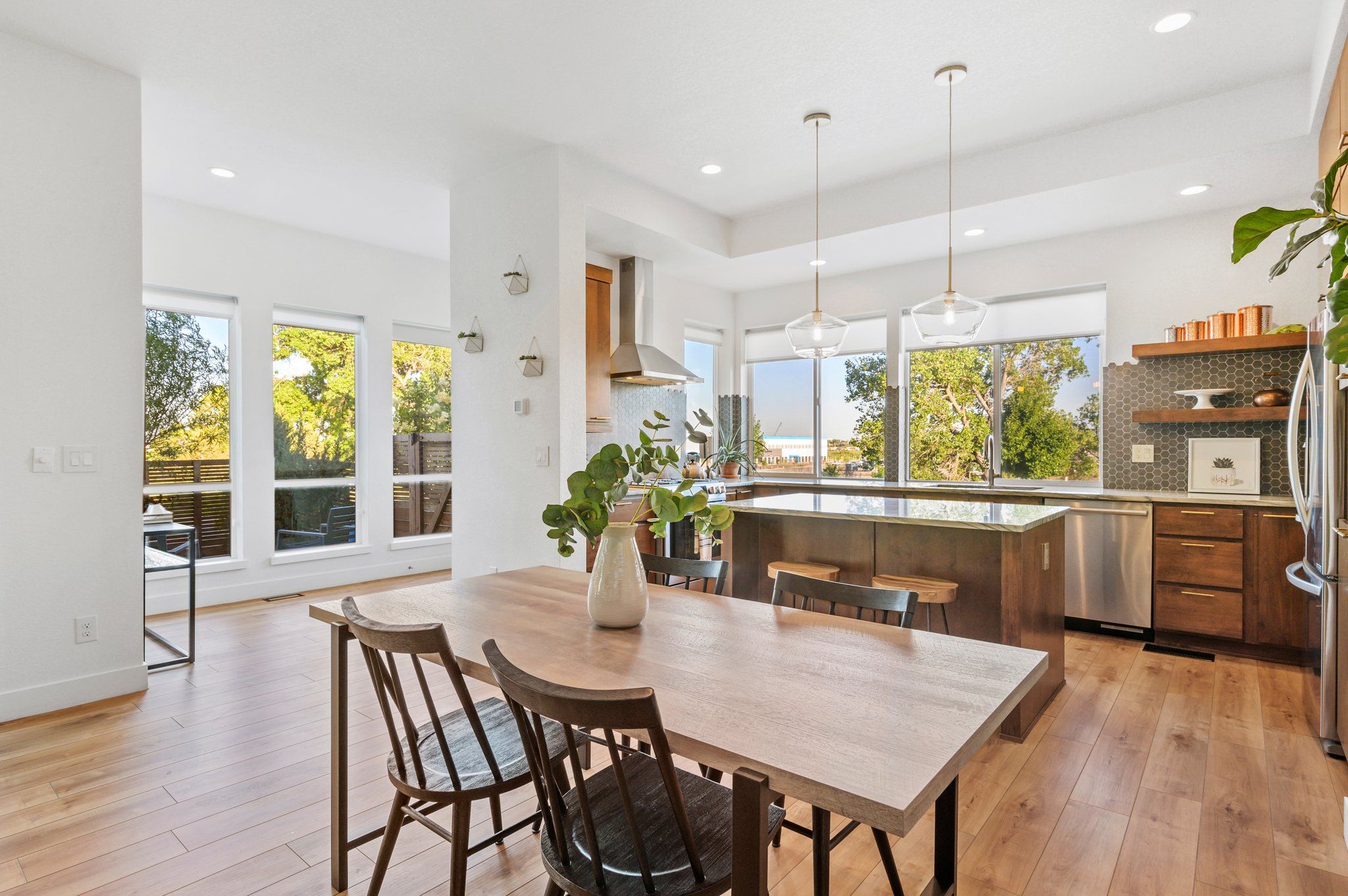 On a secluded southern facing corner fronting to open space and the mountain fed, Clear Creek stream, sits a modern Bohemian masterpiece. Step inside and away from the ordinary. The open, award-winning floor plan beckons with natural light streaming through a myriad of windows, and luxe wood flooring underfoot. Enjoy an impeccable level of finish with new paint, and custom trim, moulding, lighting, and wall tile throughout.