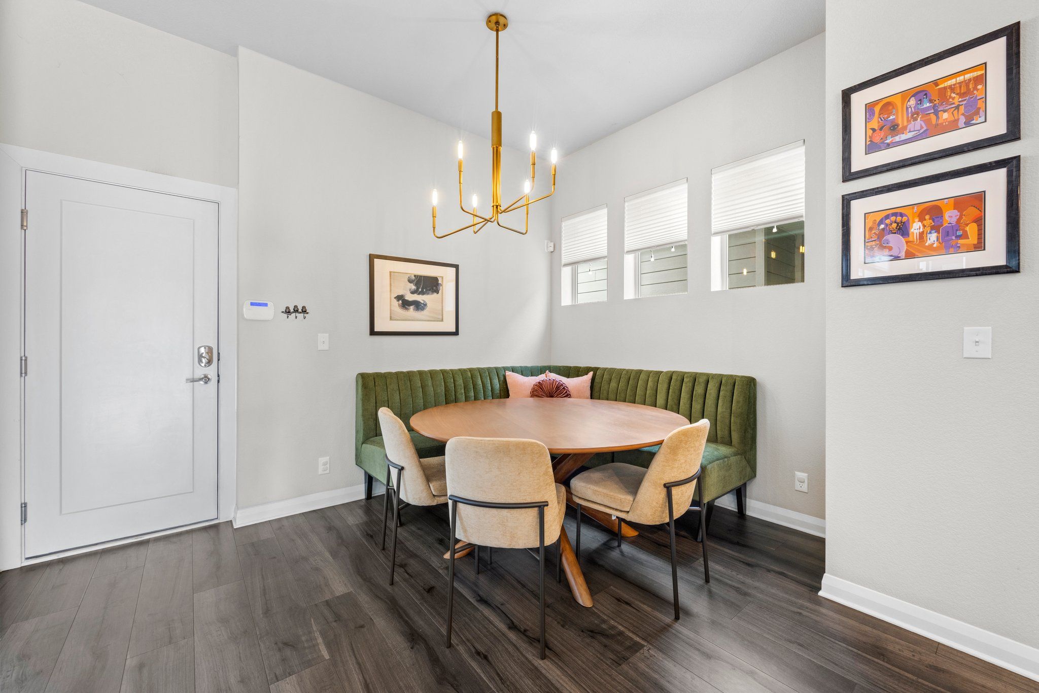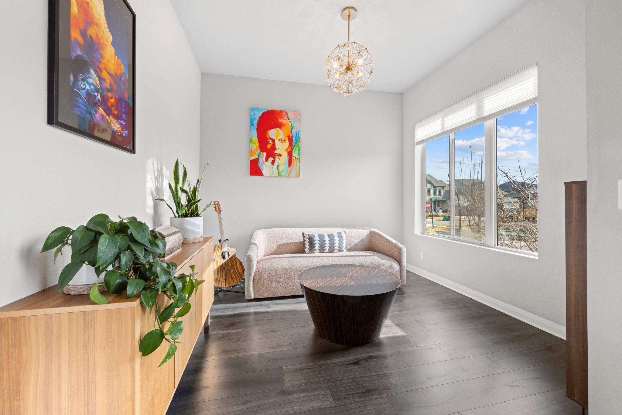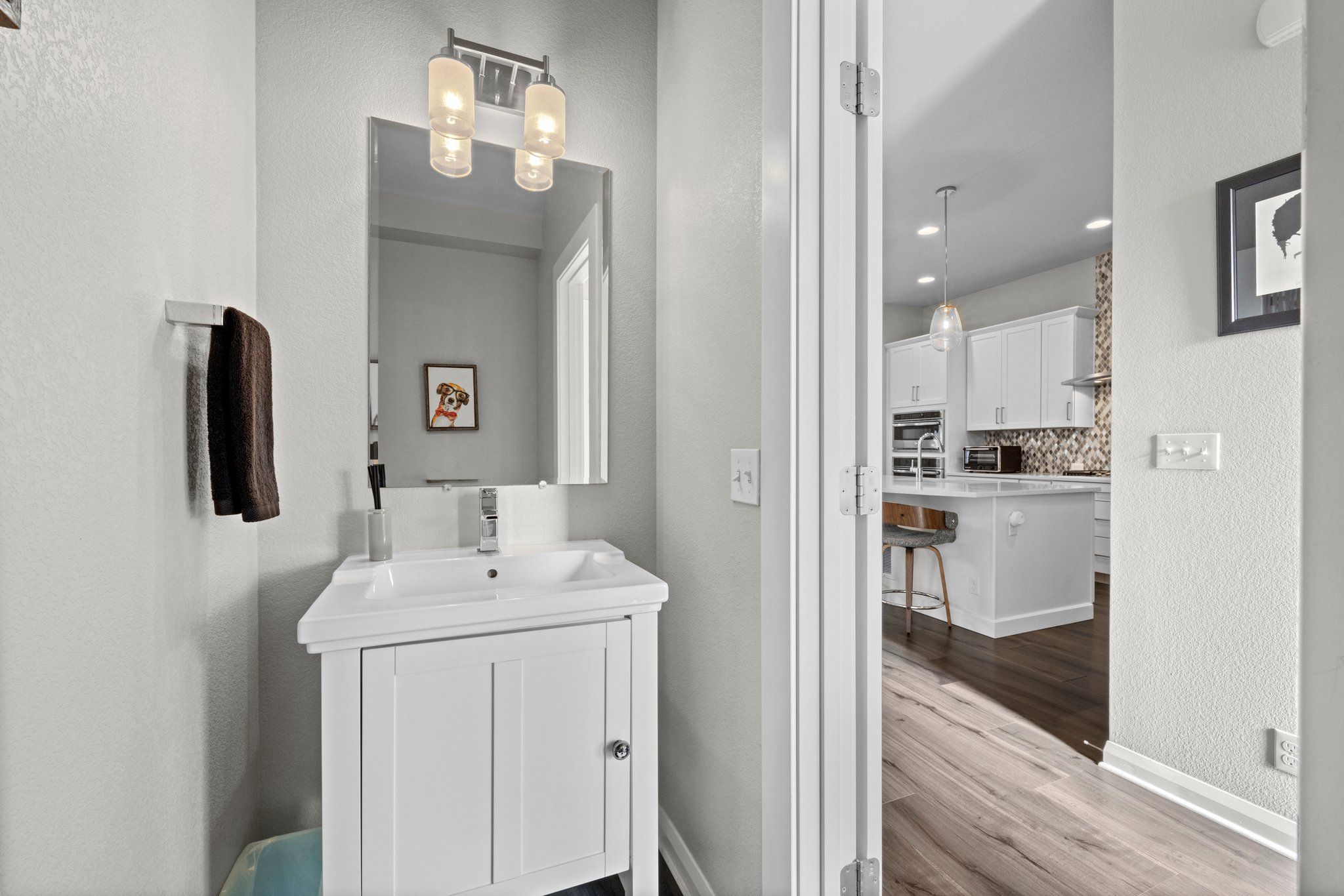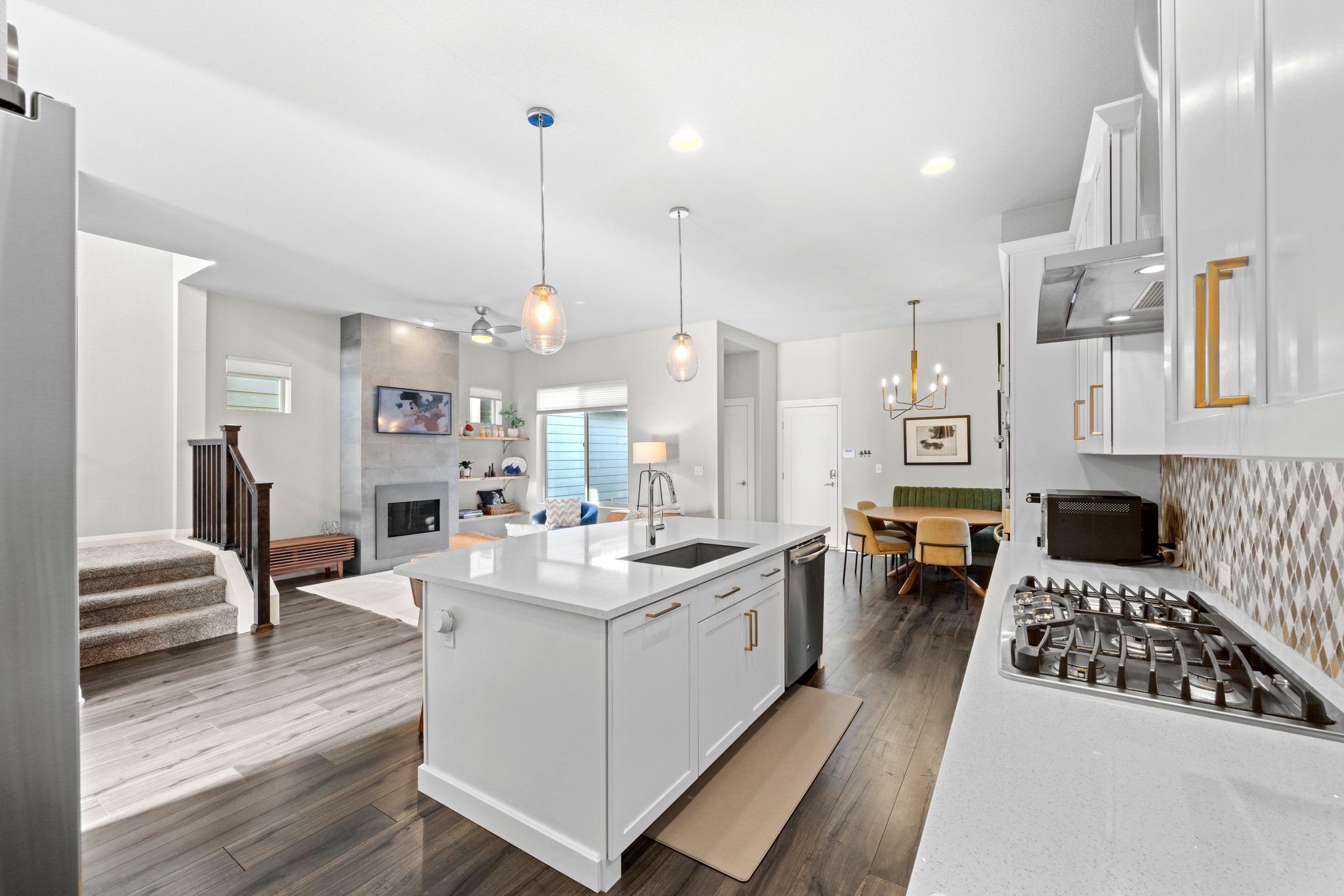 Upon entering, you are greeted with a sense of lively calm. The main floor features soft mixed metal and pearlescent surfaces grounded by beautiful wide plank vinyl flooring. The bright lounge space is an enchanting work from home location. 10 ft’ ceilings create an expansive atmosphere. The focal point of the living room is a magnificent gas fireplace framed by built-in shelving, its warm glow casting a cozy ambiance.