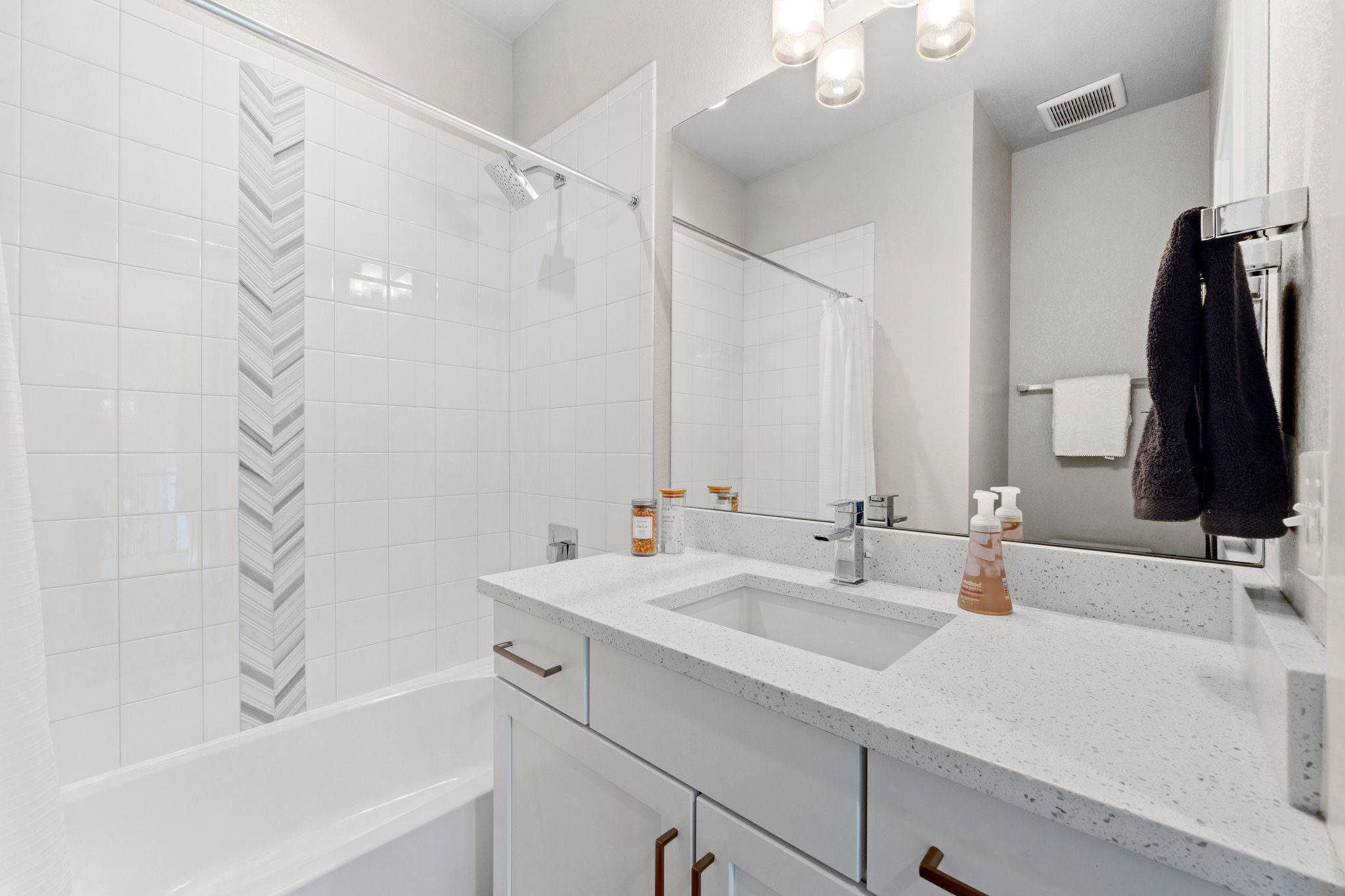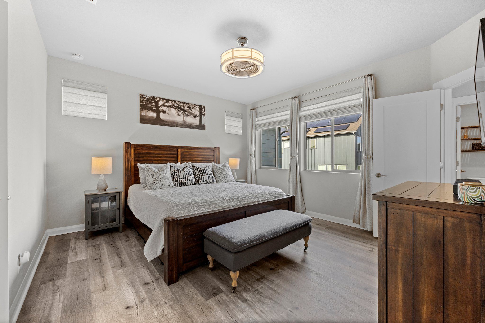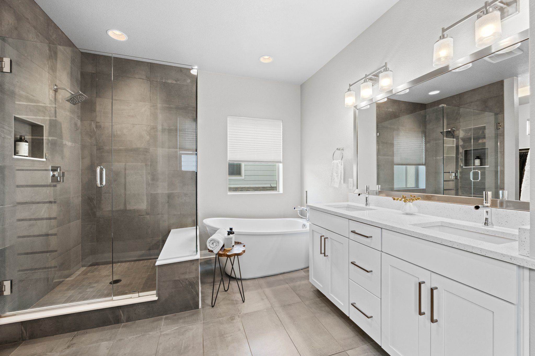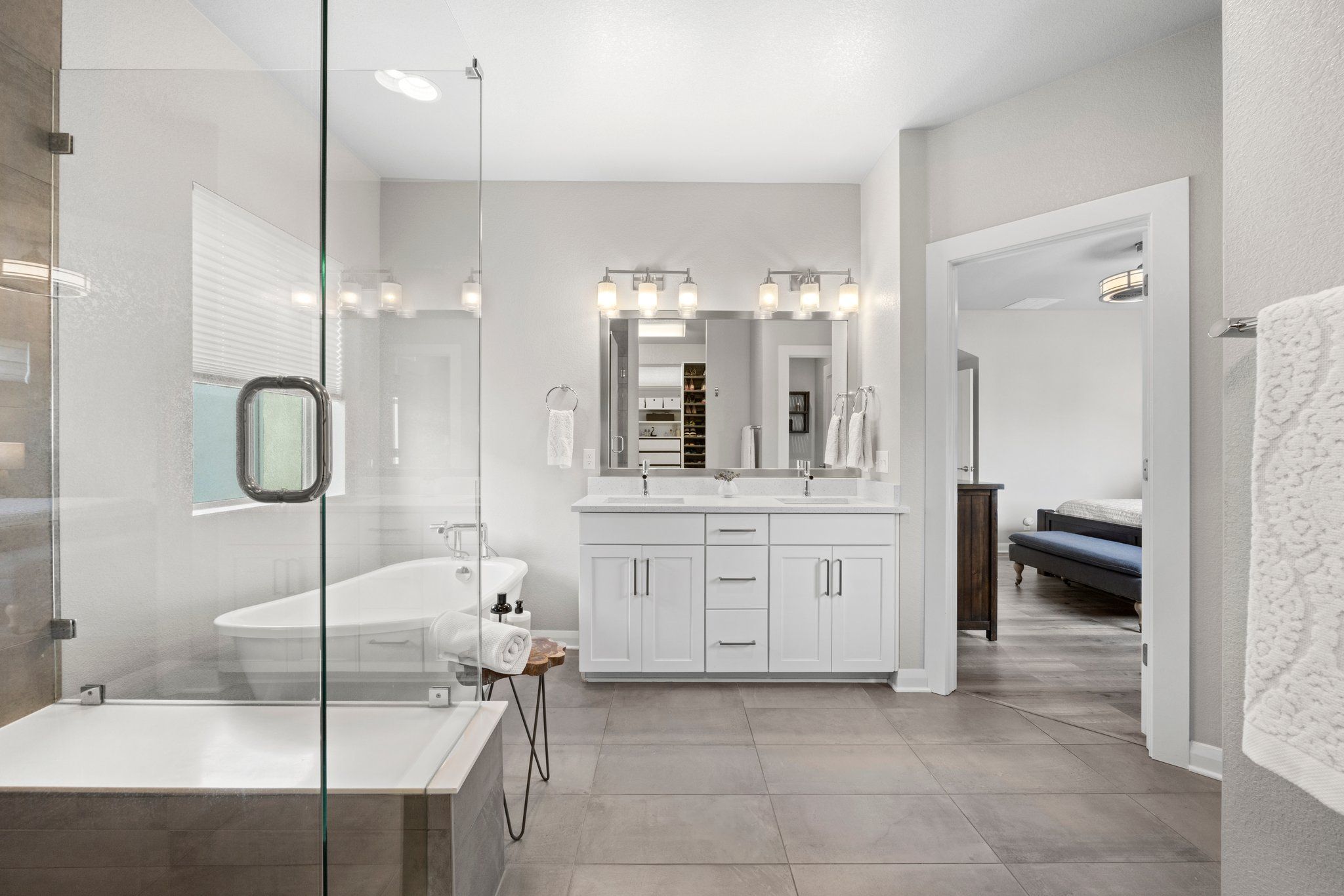 The spa-like ensuite bathroom features a luxurious soaking tub and a sleek glass-enclosed shower, quartz double vanity and walk-in closet. It's the perfect place to unwind after a long day.