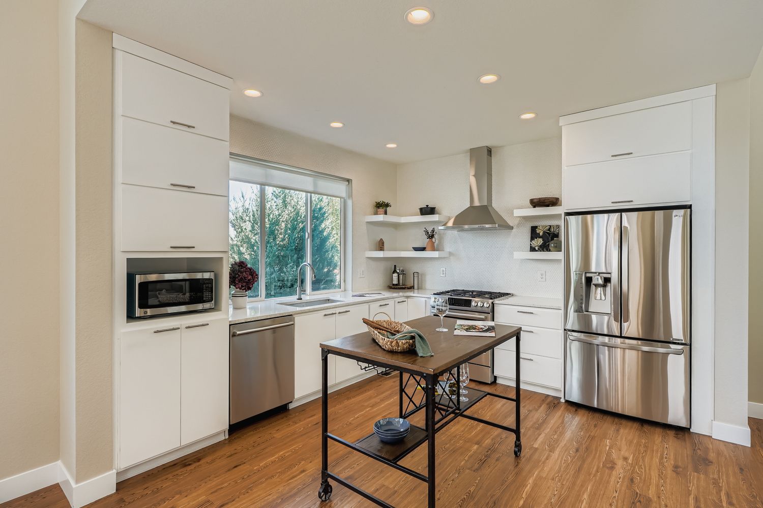 Step inside to find soaring vaulted ceilings, expansive windows, and brand-new interior paint and trim throughout that enhance the home’s fresh, airy aesthetic. A wall of double sliding glass doors opens to a private patio, creating an effortless flow for entertaining or quiet relaxation.