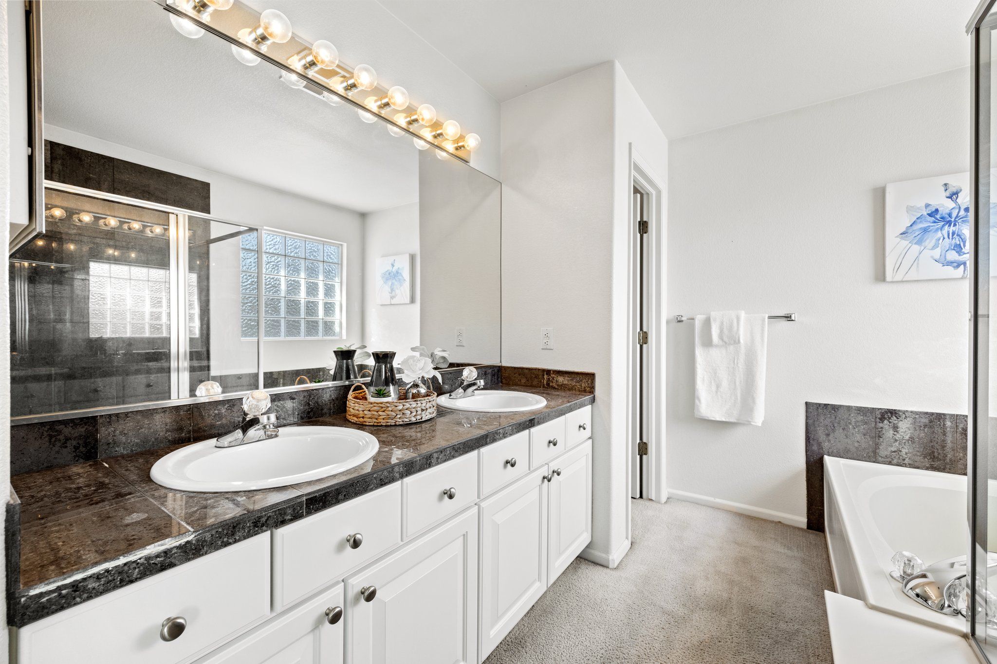 The upper level is highlighted by a spacious primary bedroom with vaulted ceilings, an ensuite bath, and a walk-in closet. The primary suite's bathroom includes a double vanity sink, a soaking bathtub, and a shower with a tile surround. In addition, an oversized bedroom, bathroom, bonus space/loft, and laundry complete the upper level.