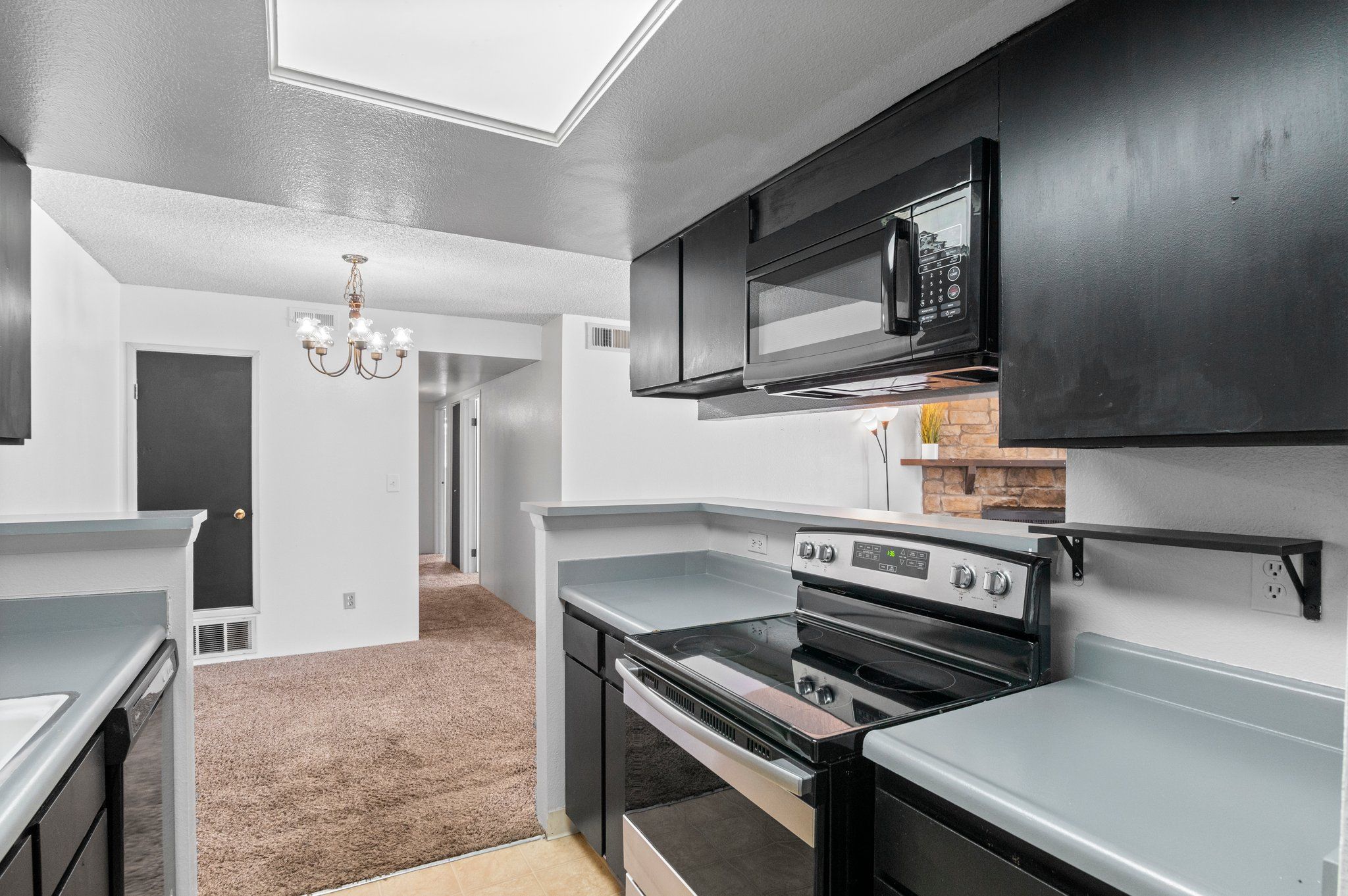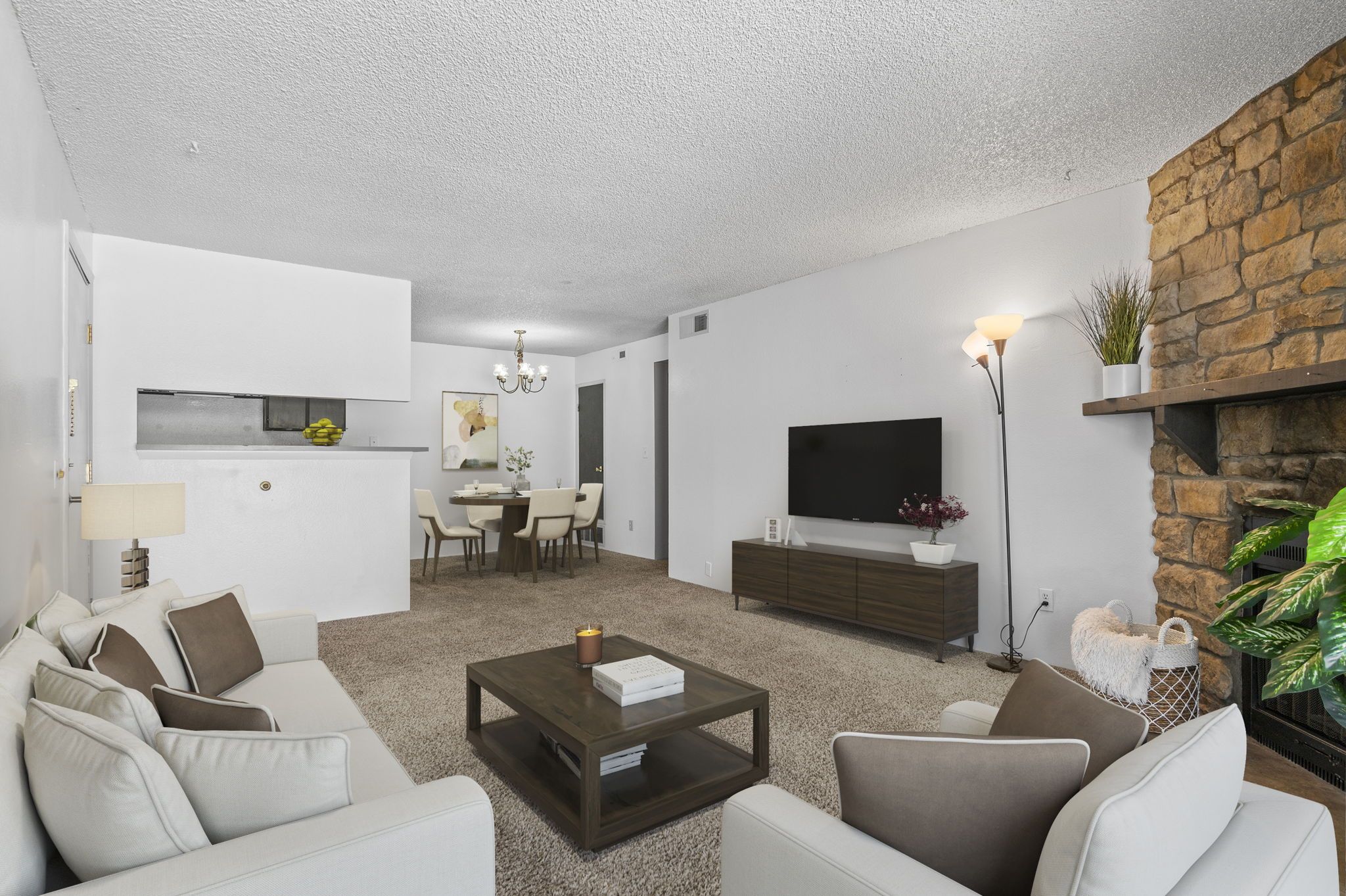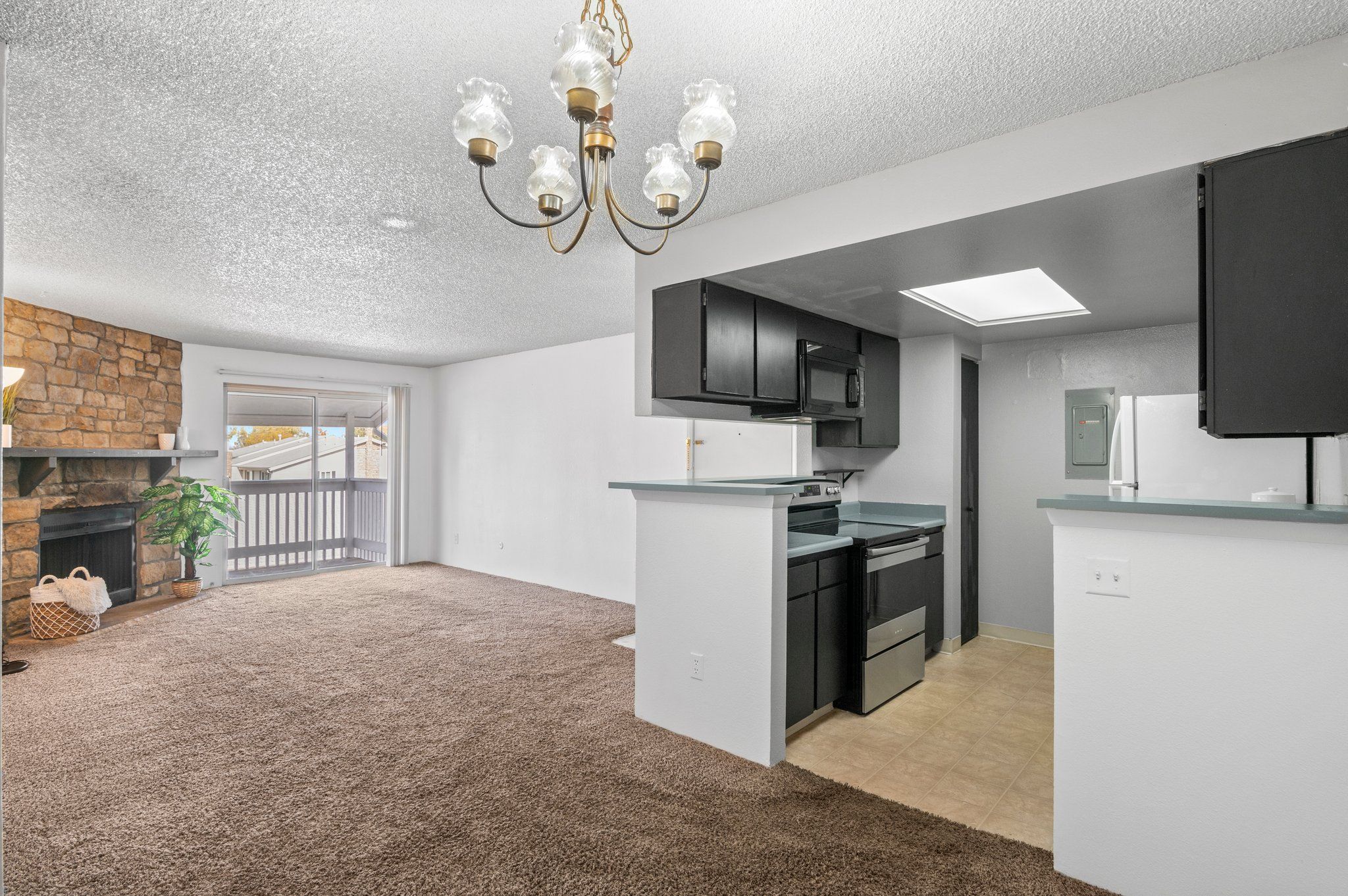 Step into an open and inviting floor plan that seamlessly connects the living, dining, and kitchen areas, creating an ideal space for entertaining with a floorplan that flows. The bright living room features a cozy wood-burning fireplace and sliding glass doors that open onto a private balcony, the perfect spot to relax and unwind.