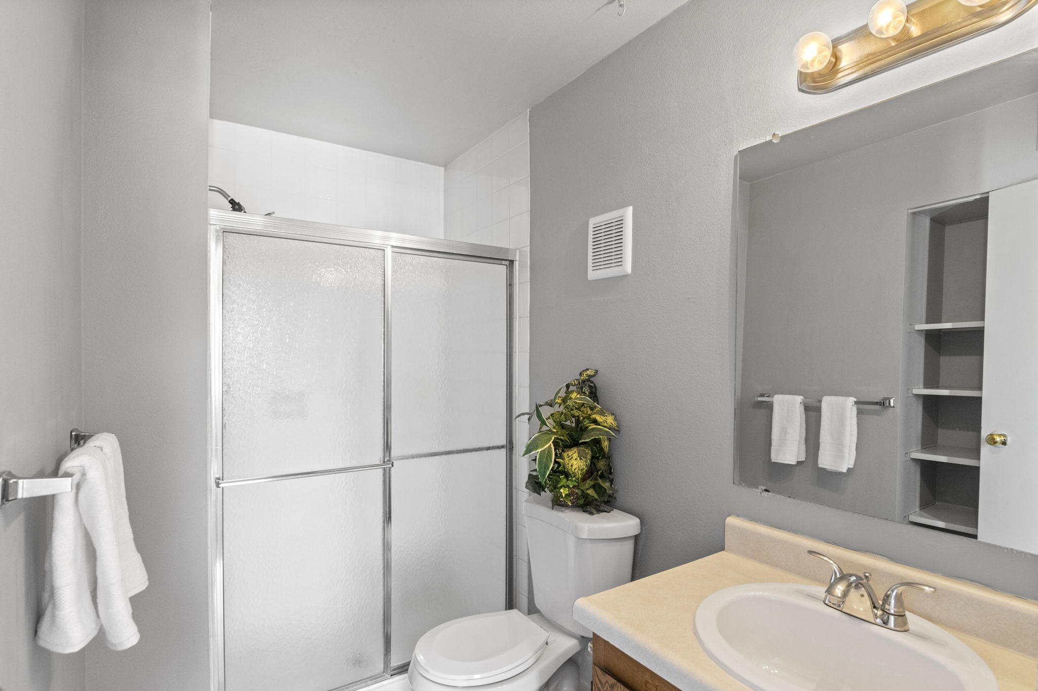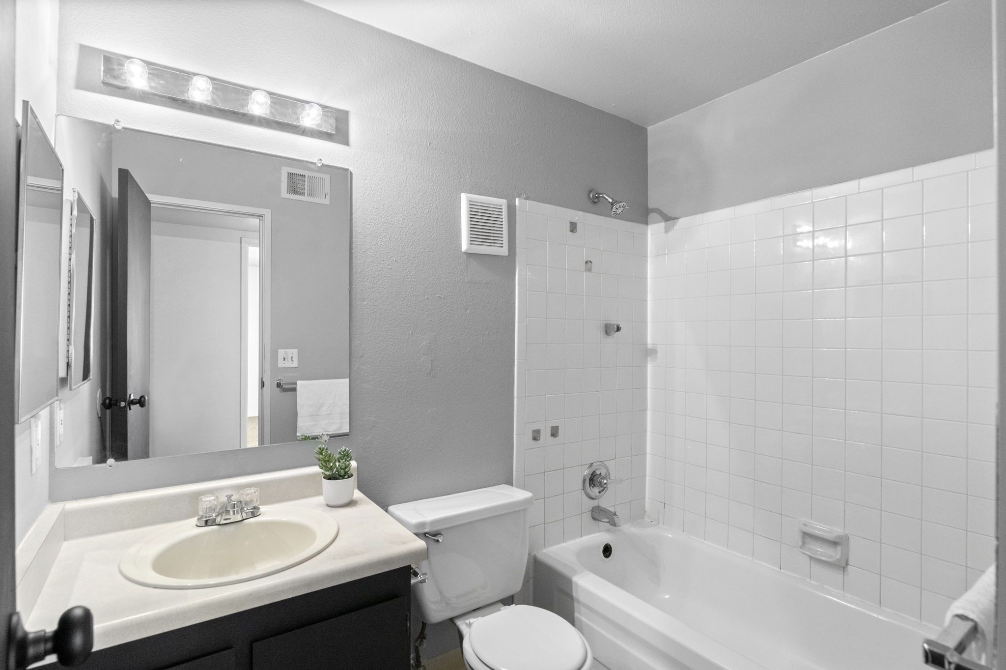The spacious primary bedroom includes two large closets, an ensuite bath with a tiled shower and glass sliding door adding ease to your daily routine. A second large bedroom, ideal for guests or a home office, is conveniently located near the hallway bath, complete with a tub and tile surround.