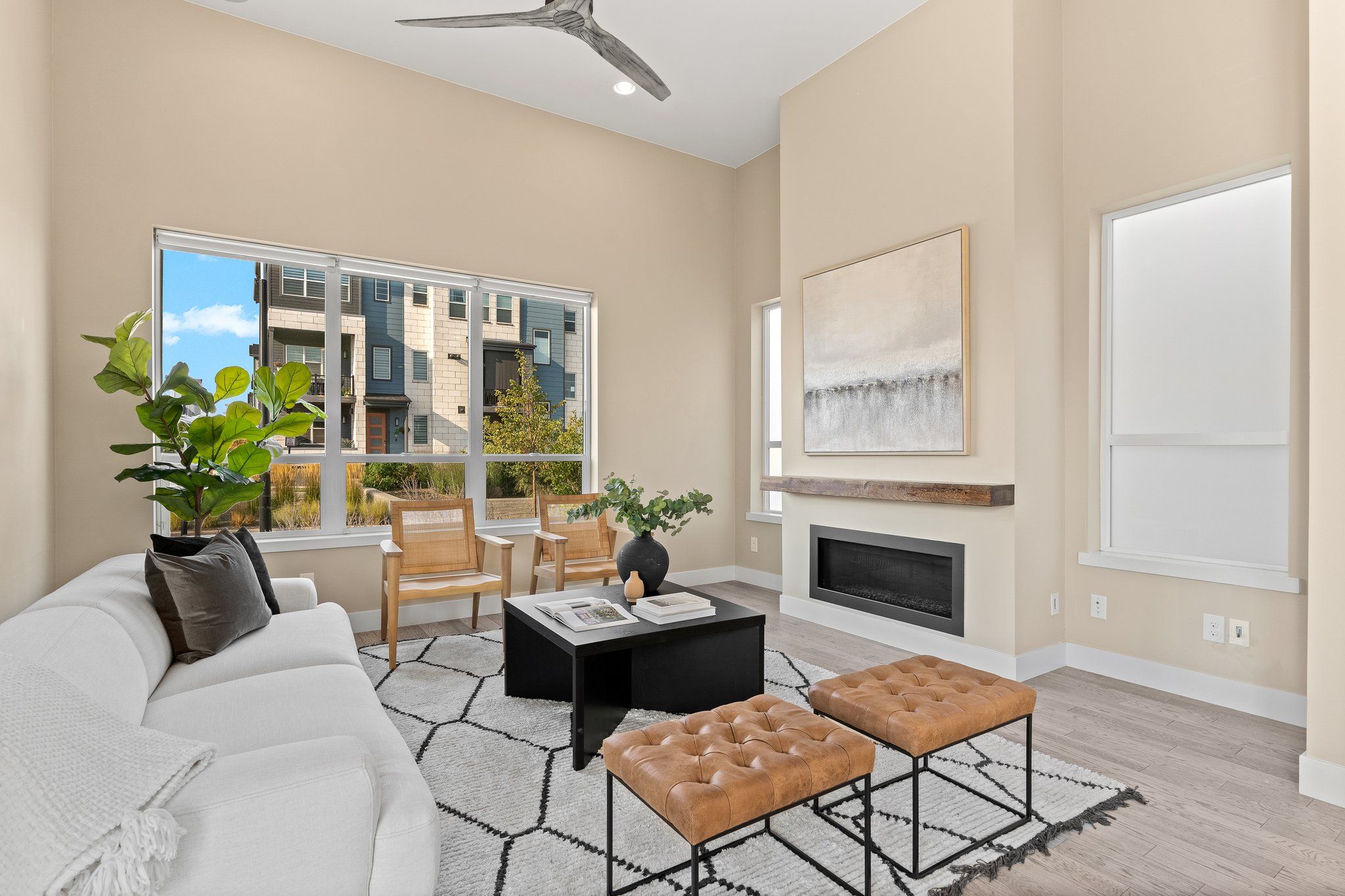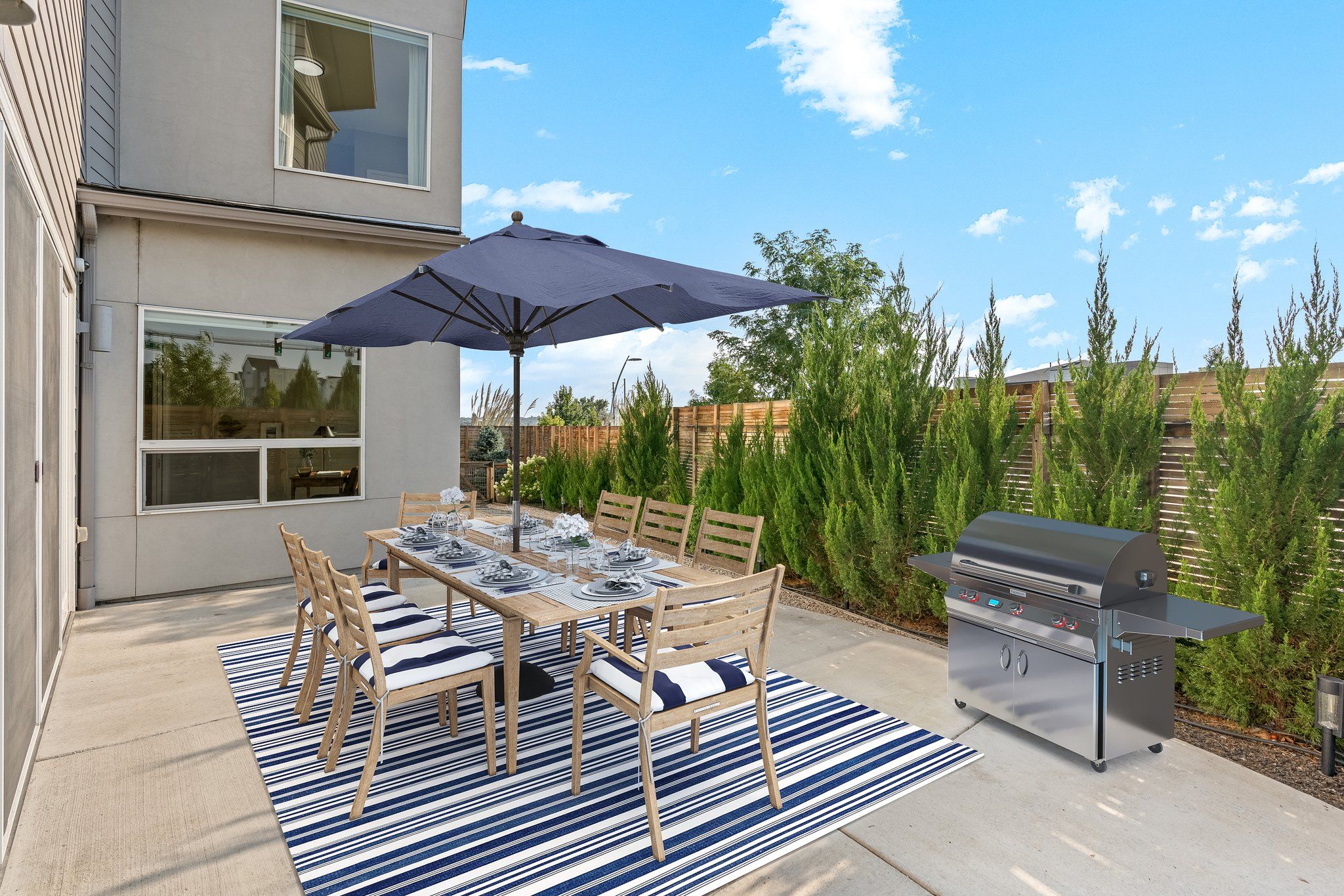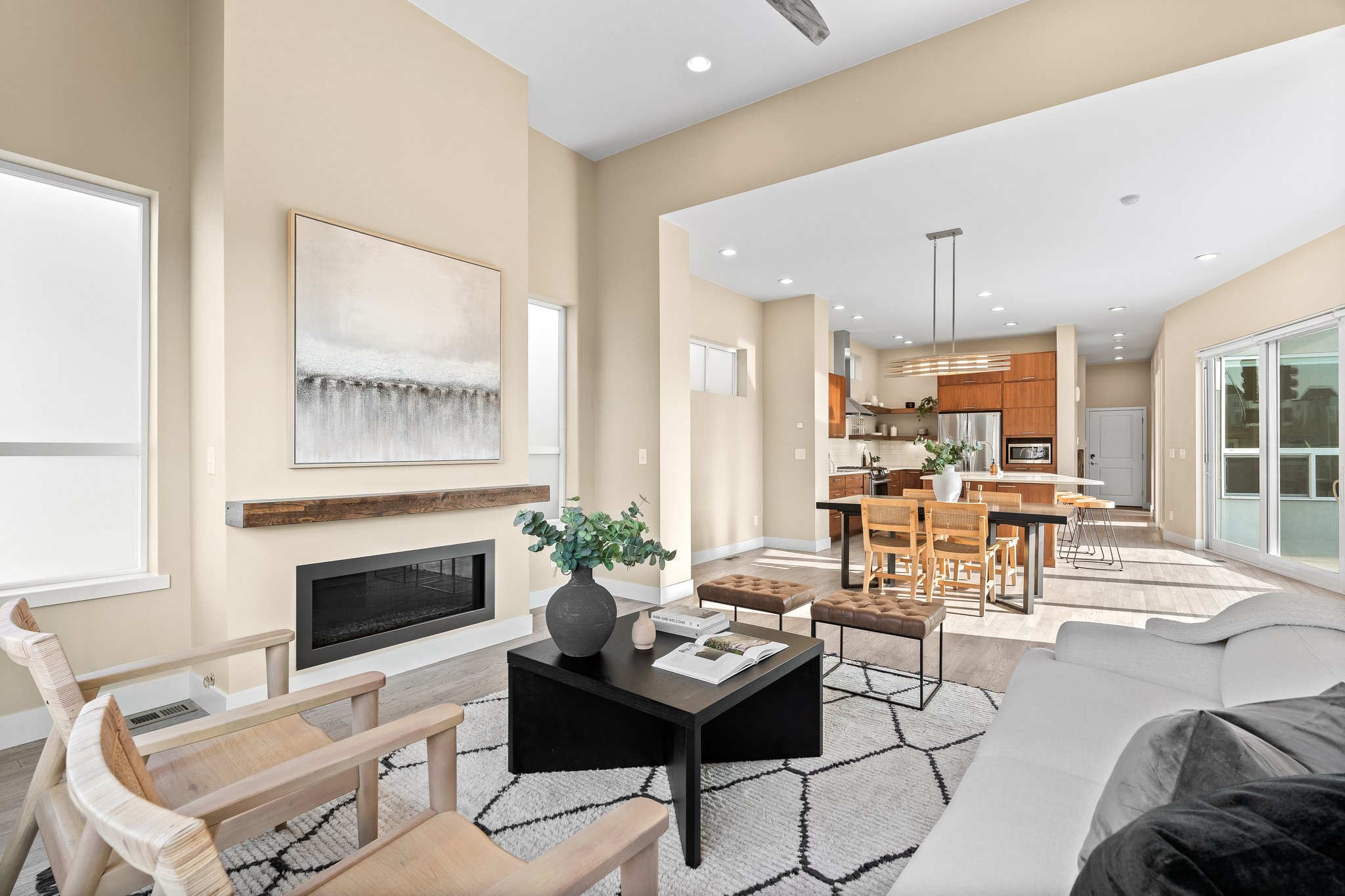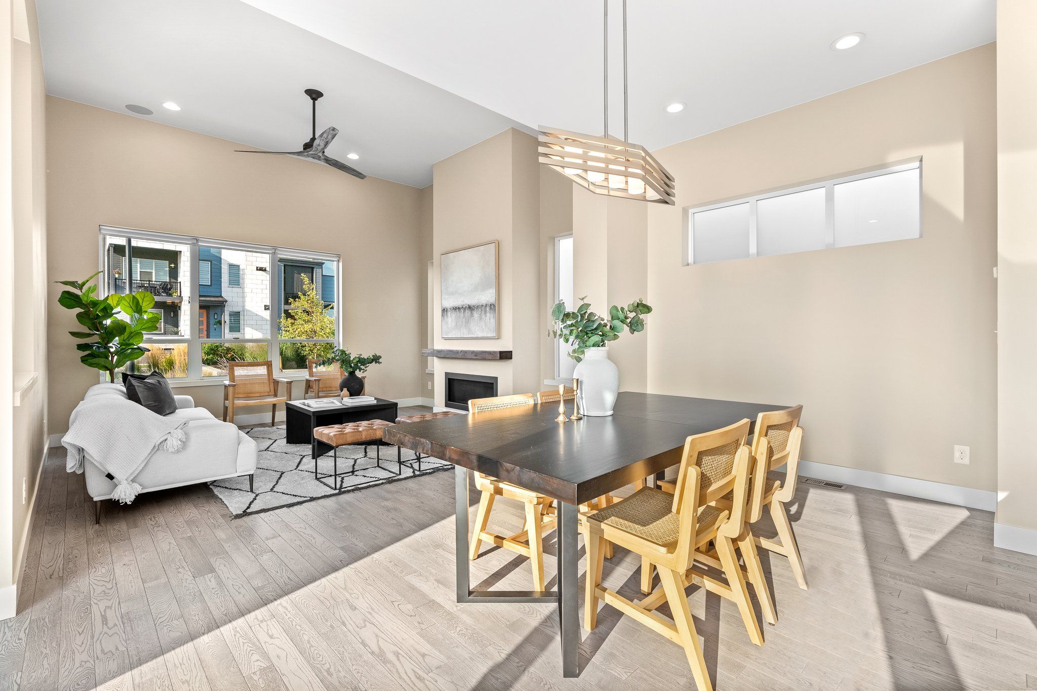 Step into a bright entry way to be welcomed with wall of glass doors to back patio and a cozy fireplace. This open concept floor plan begs to host holidays and is meant for entertaining! The kitchen is appointed with luxury detailing throughout, including Bosch appliances, large quartz island, custom tile backsplash and showcase shelving.