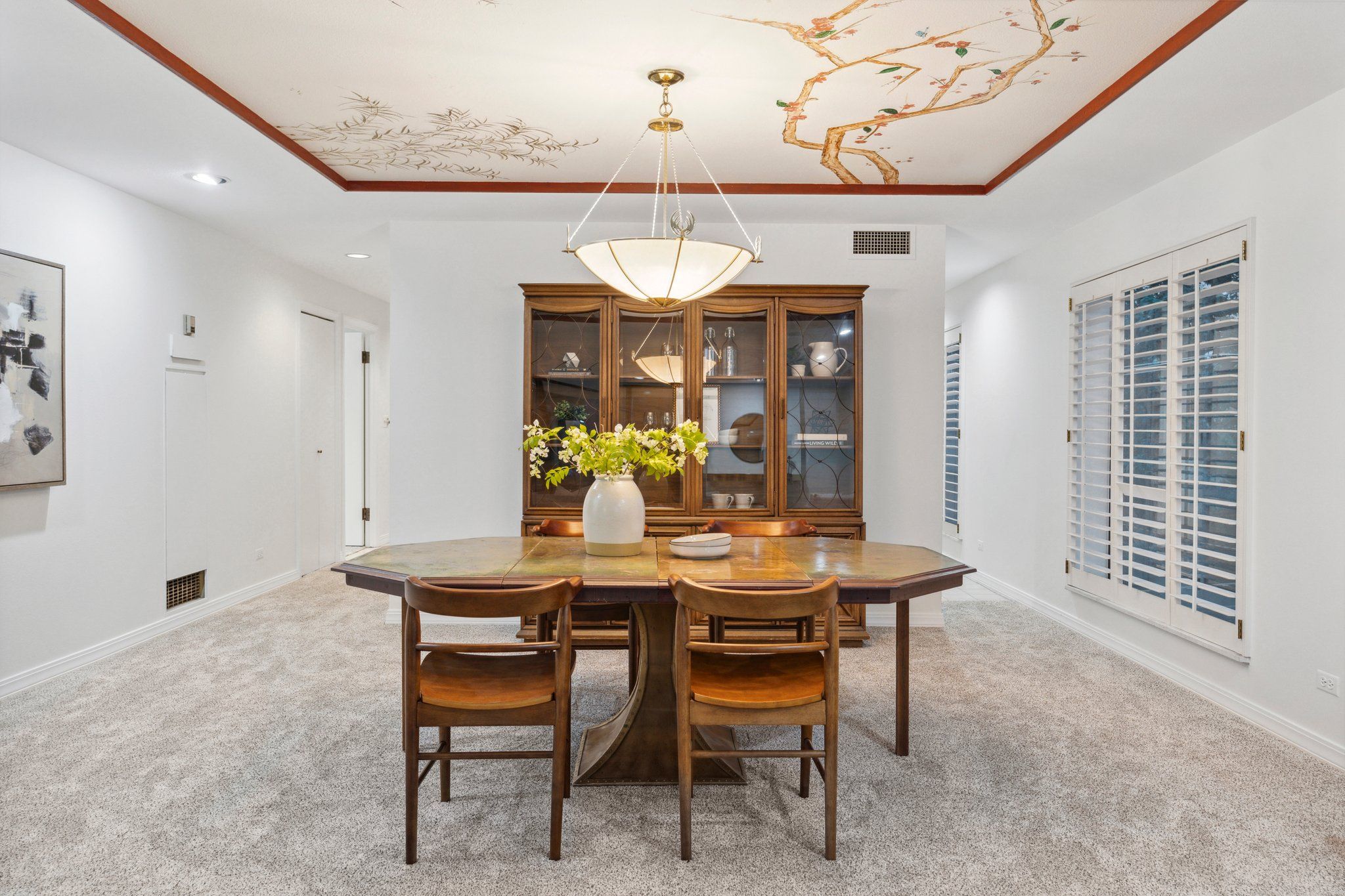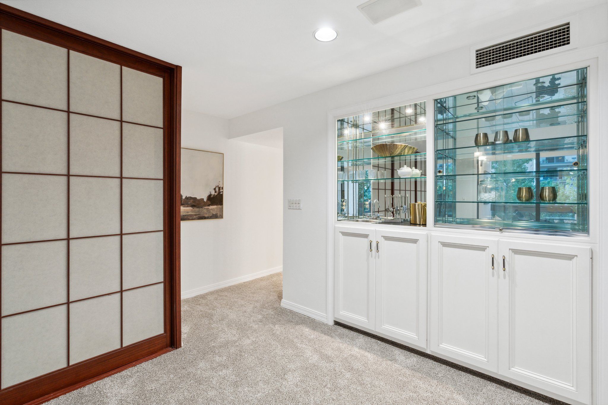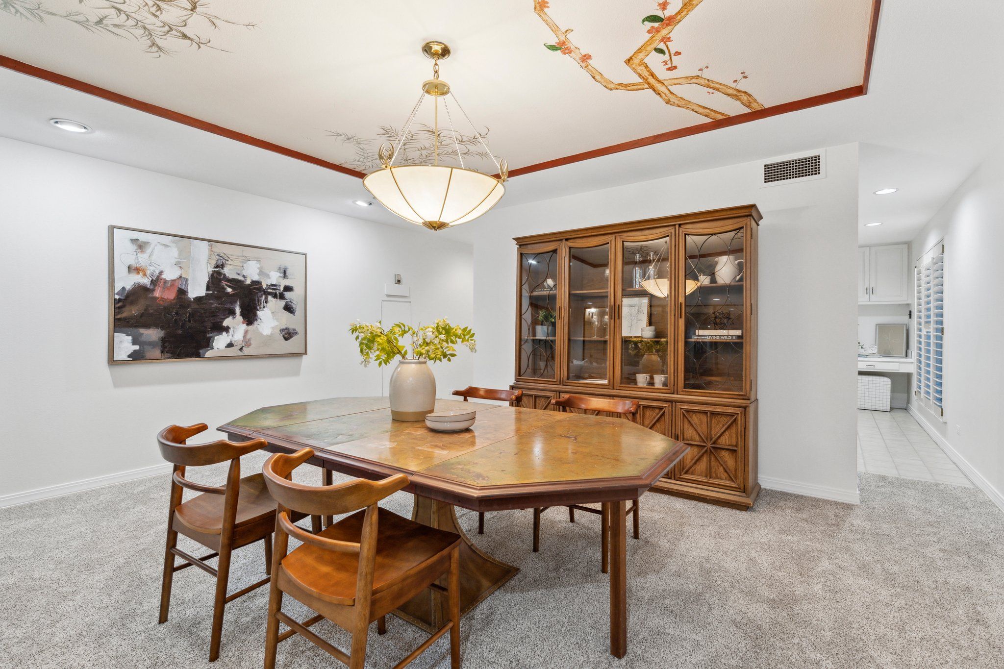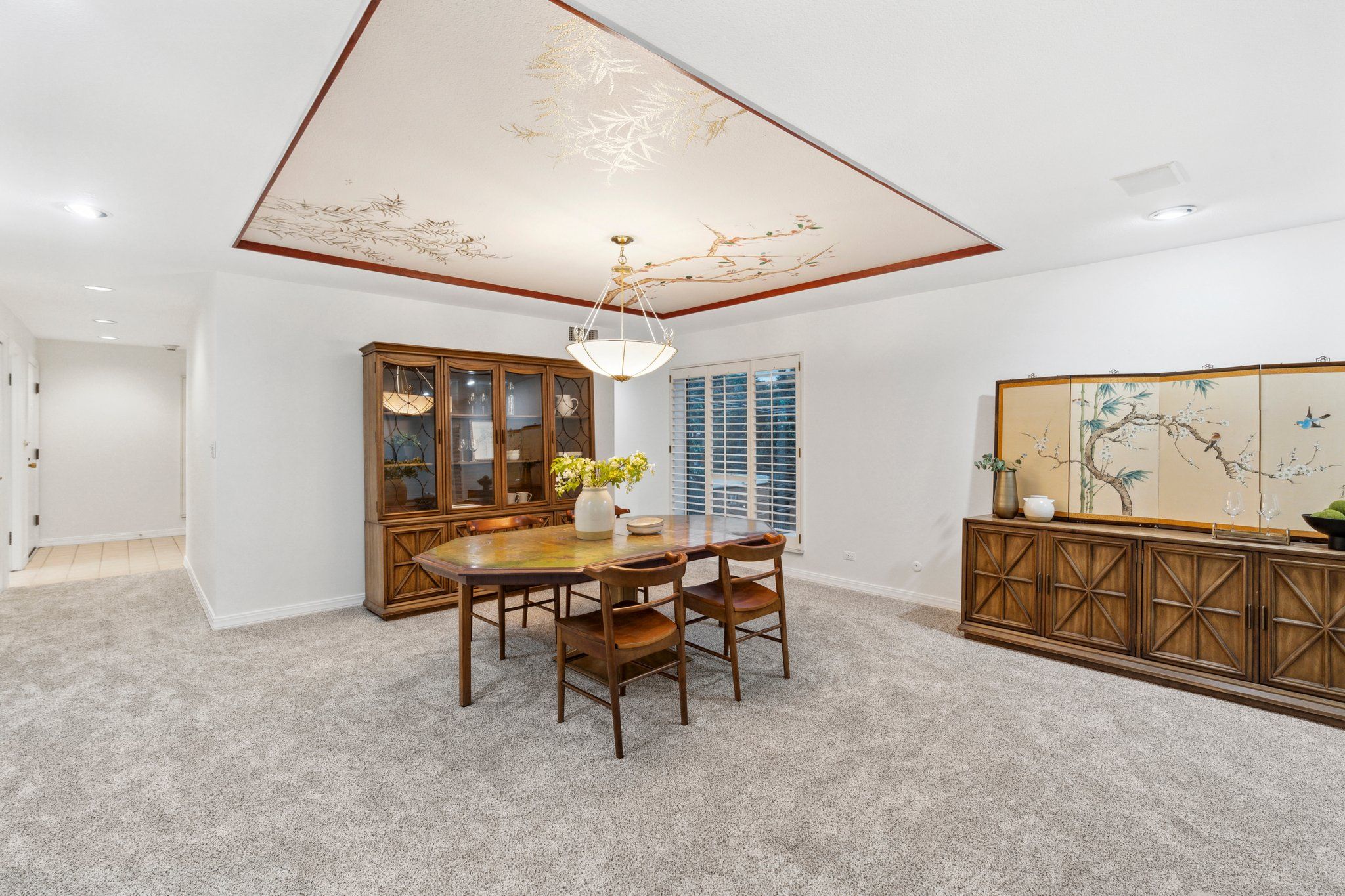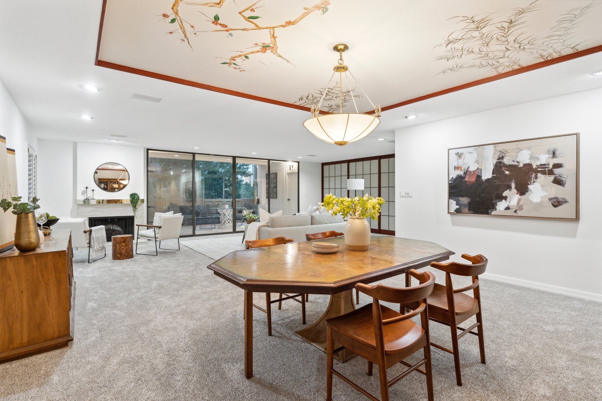 This newly remodeled corner unit boasts an open and sunlit floor plan with new carpet, new carpet pad, new tile, and new paint throughout for a plush and inviting atmosphere. Design aficionados will appreciate the functional artistry of the Japanese influenced shoji screen elegantly concealing impressive built-in storage along with the custom ceiling mural in the dining room.