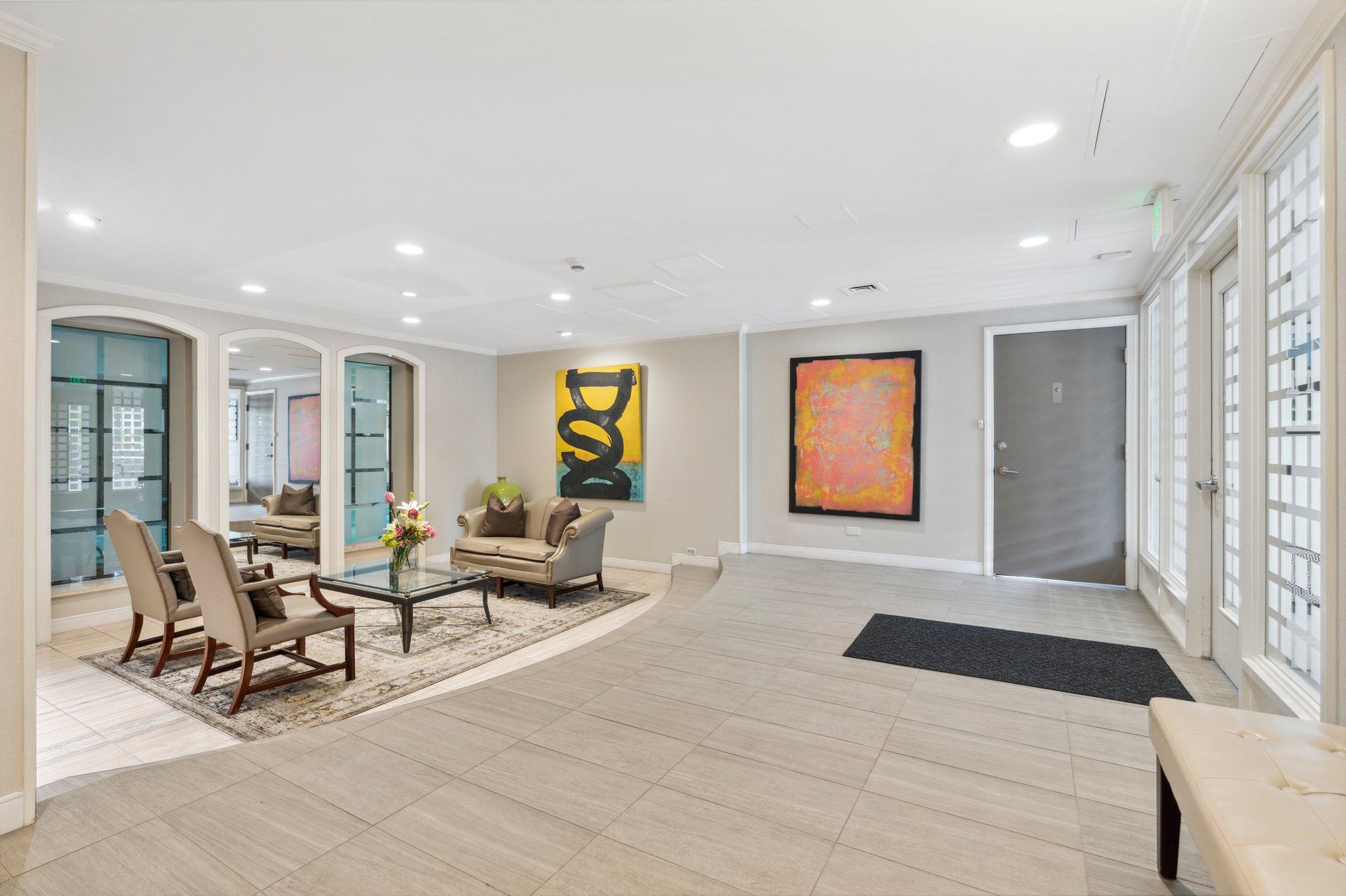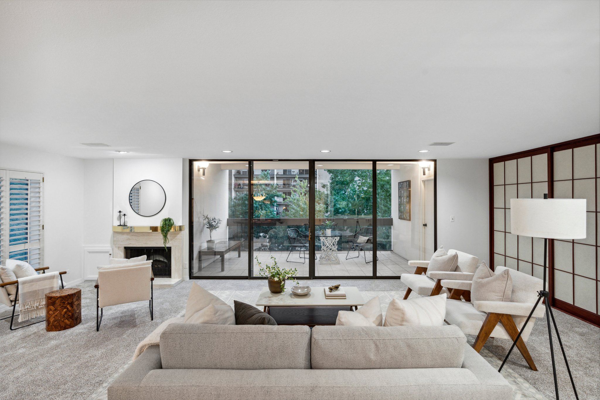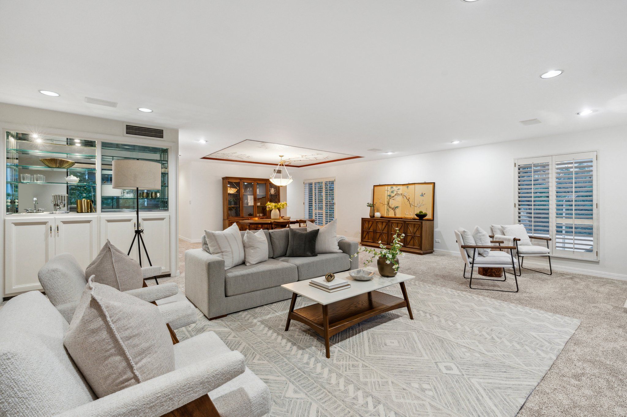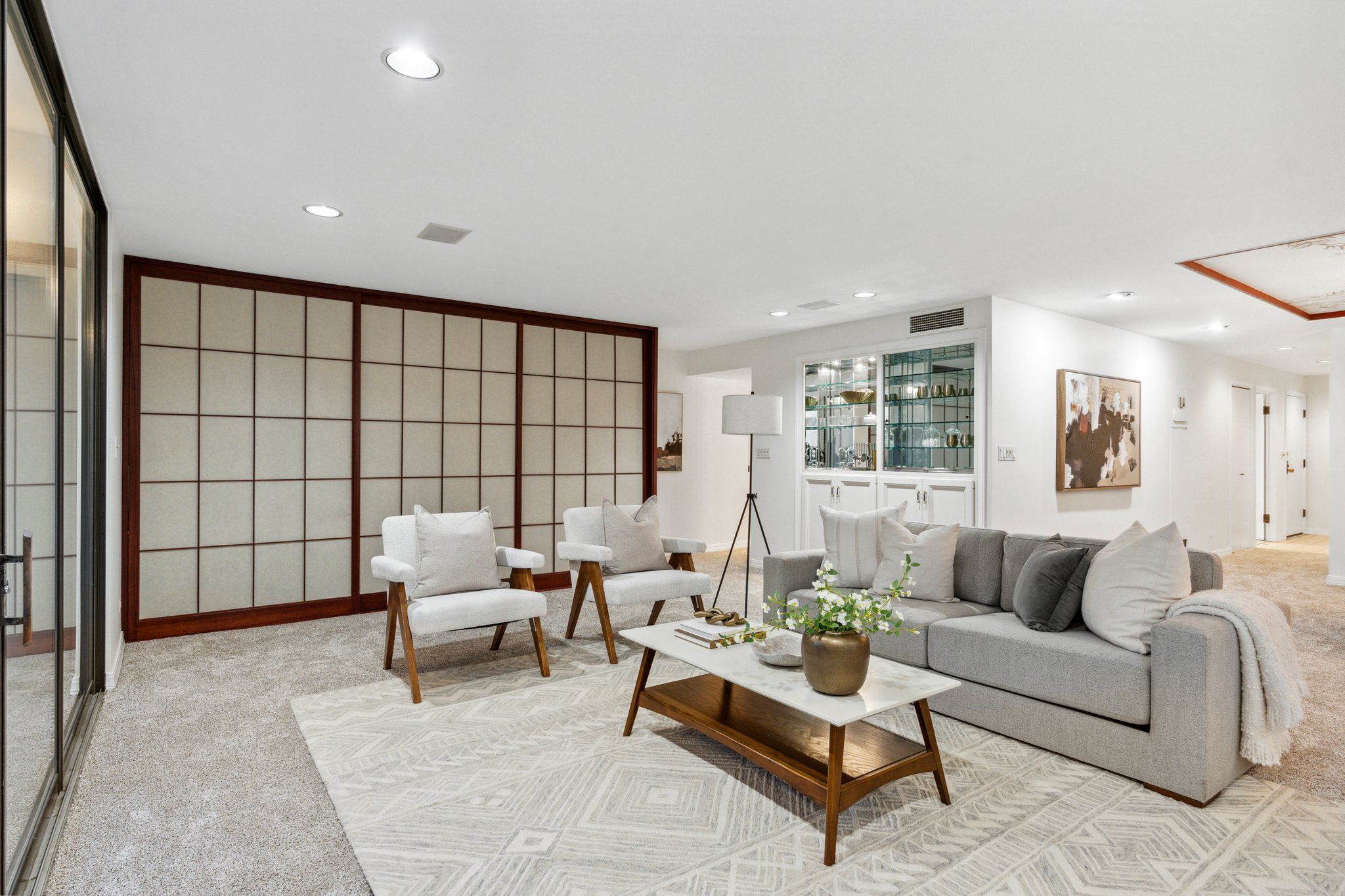 This newly remodeled corner unit boasts an open and sunlit floor plan with new carpet, new carpet pad, new tile, and new paint throughout for a plush and inviting atmosphere. Design aficionados will appreciate the functional artistry of the Japanese influenced shoji screen elegantly concealing impressive built-in storage along with the custom ceiling mural in the dining room.