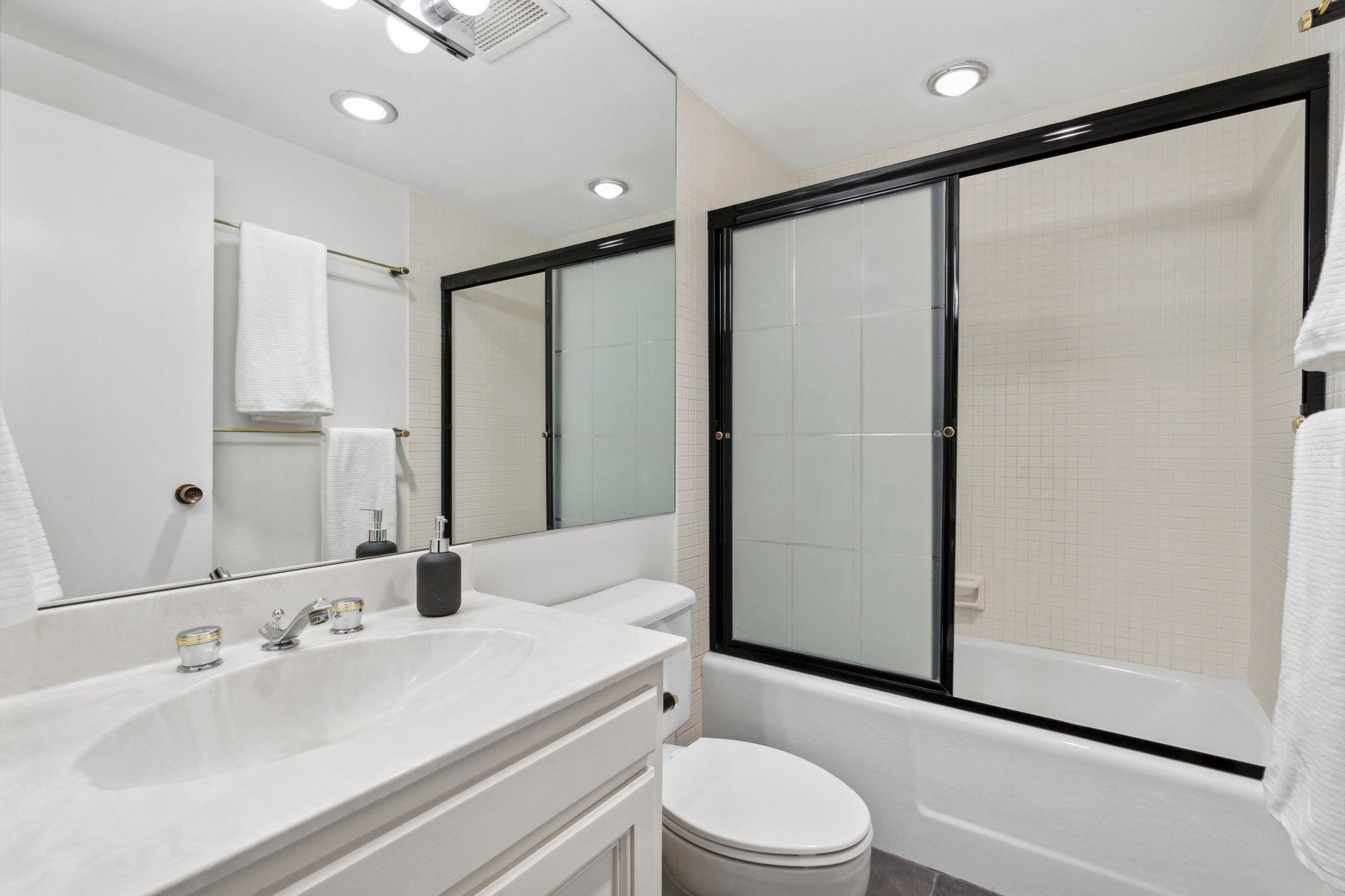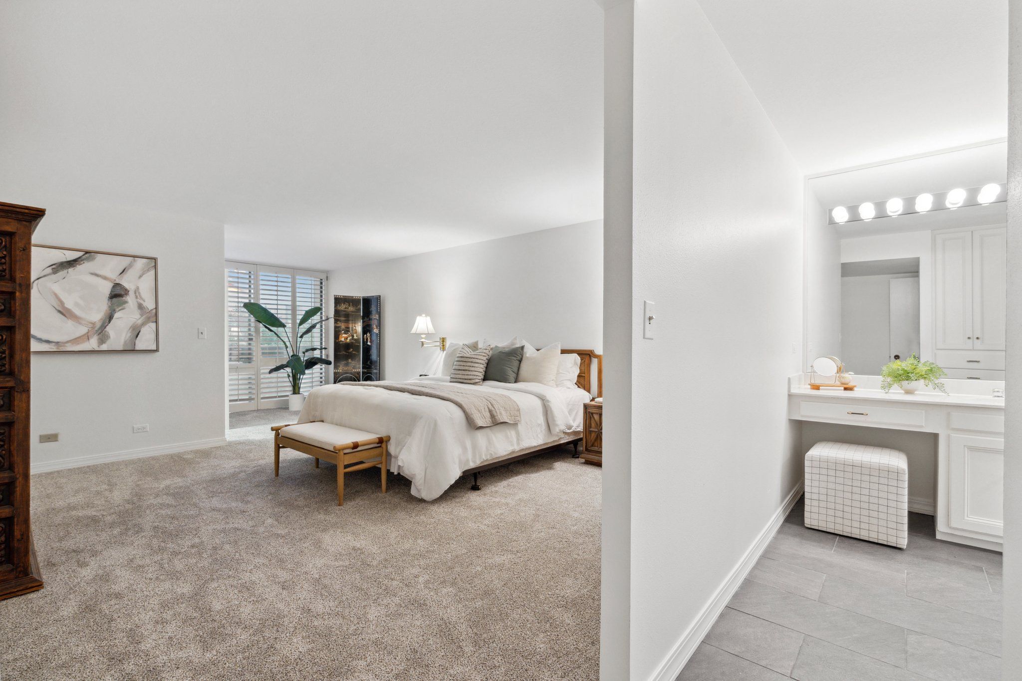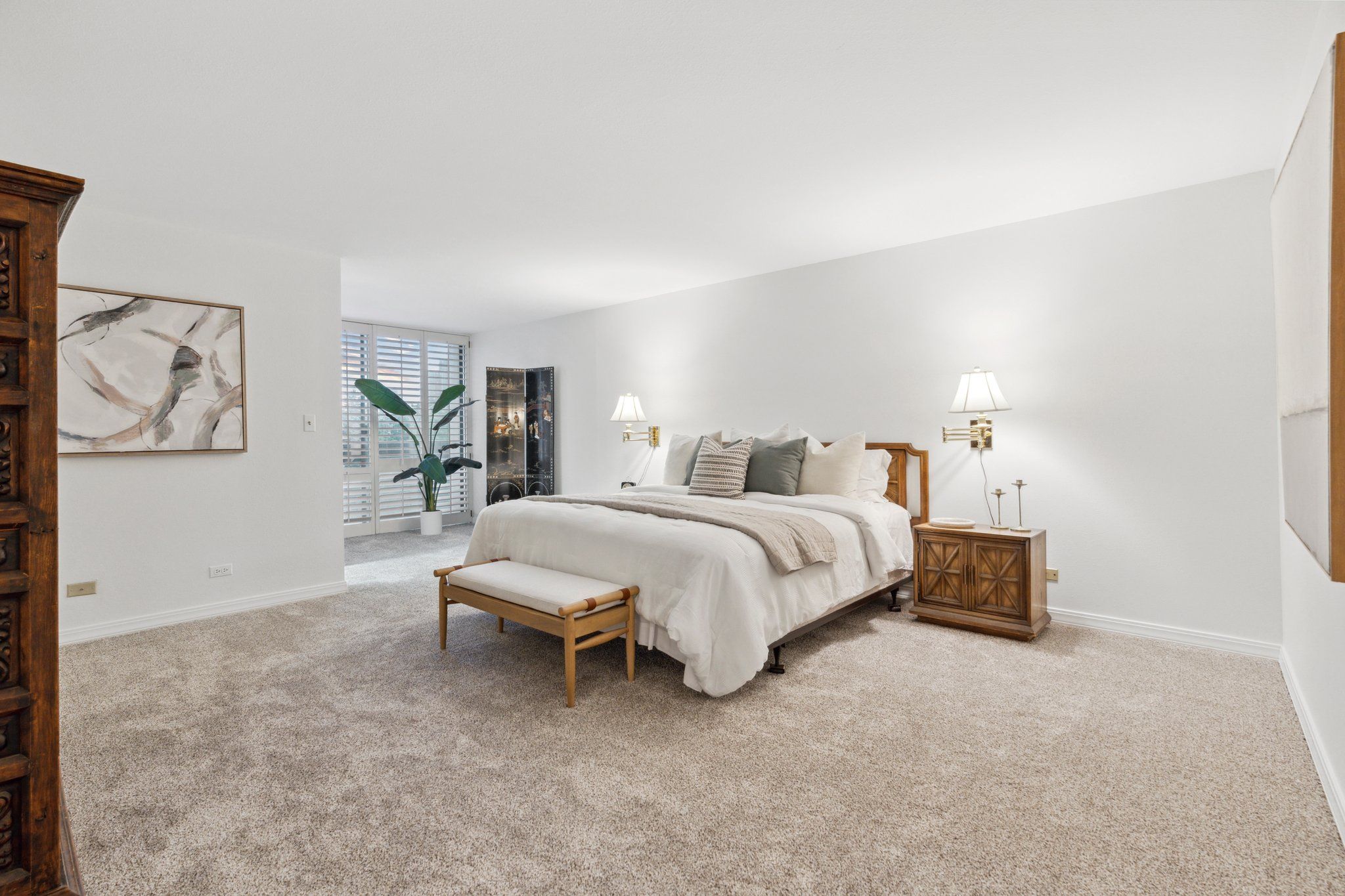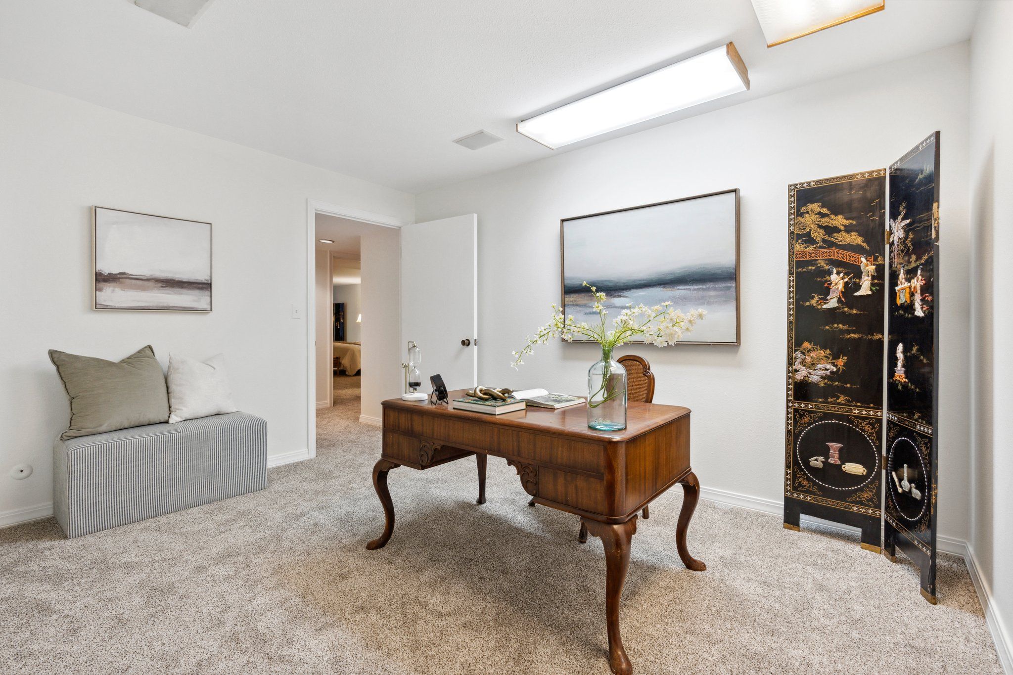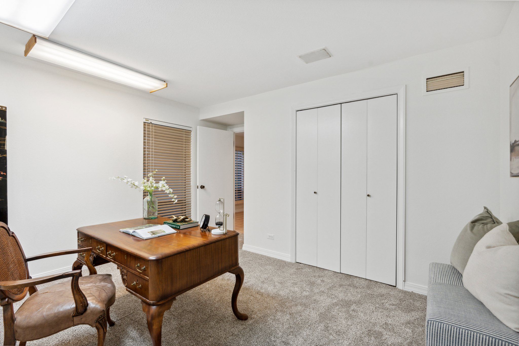 This newly remodeled corner unit boasts an open and sunlit floor plan with new carpet, new carpet pad, new tile, and new paint throughout for a plush and inviting atmosphere. Design aficionados will appreciate the functional artistry of the Japanese influenced shoji screen elegantly concealing impressive built-in storage along with the custom ceiling mural in the dining room.