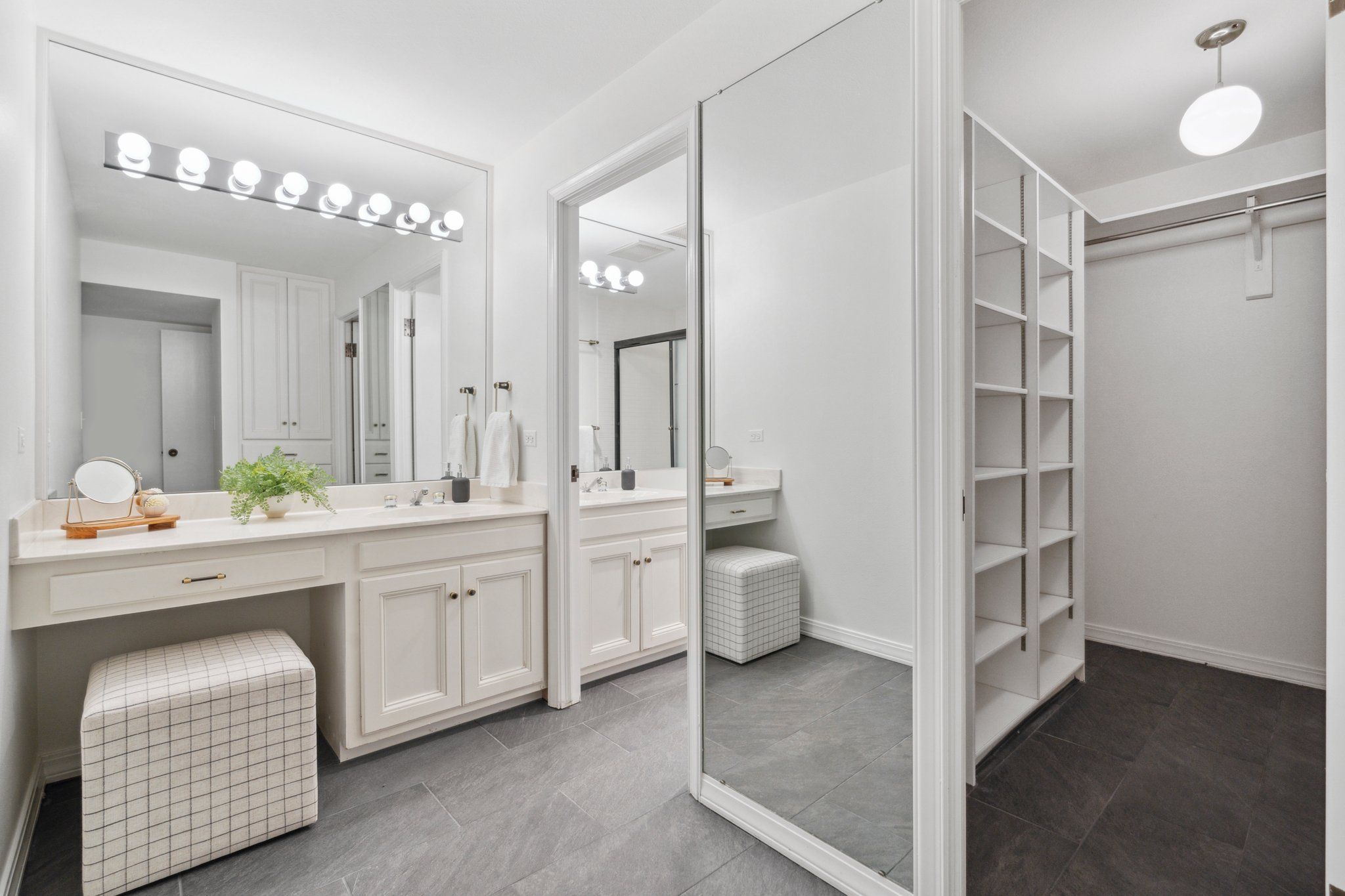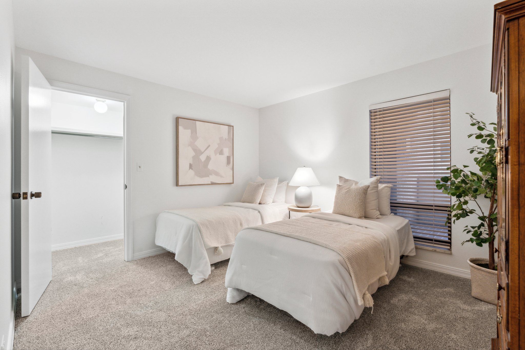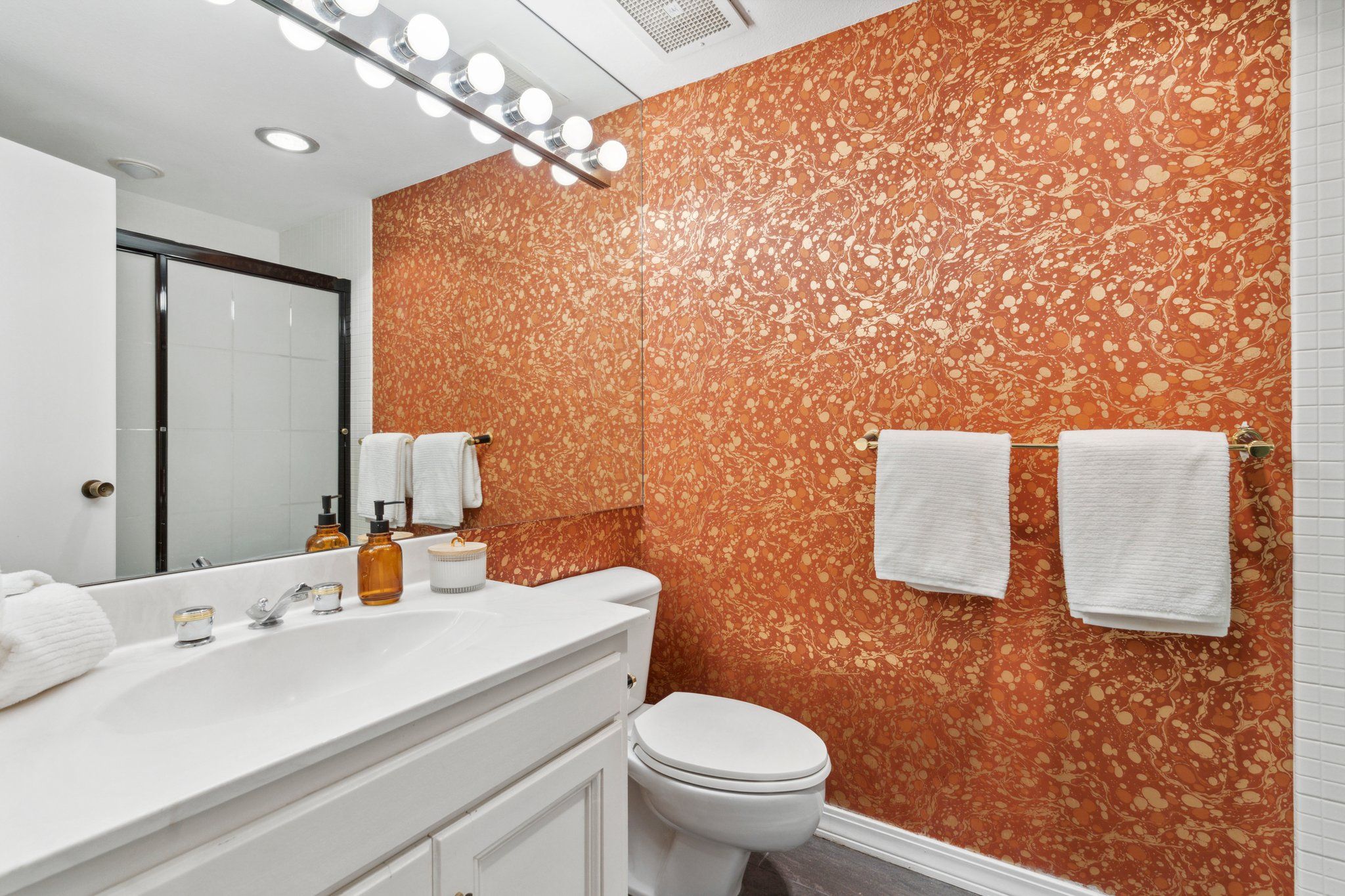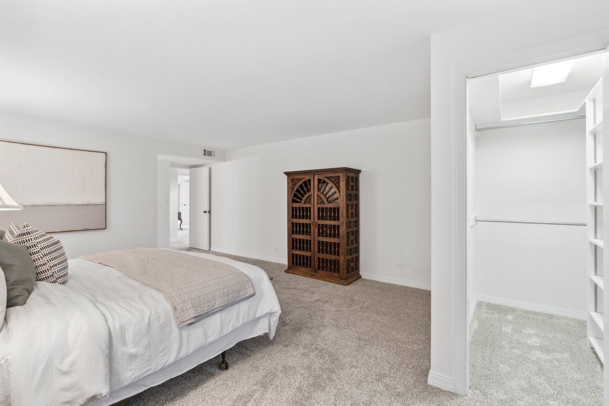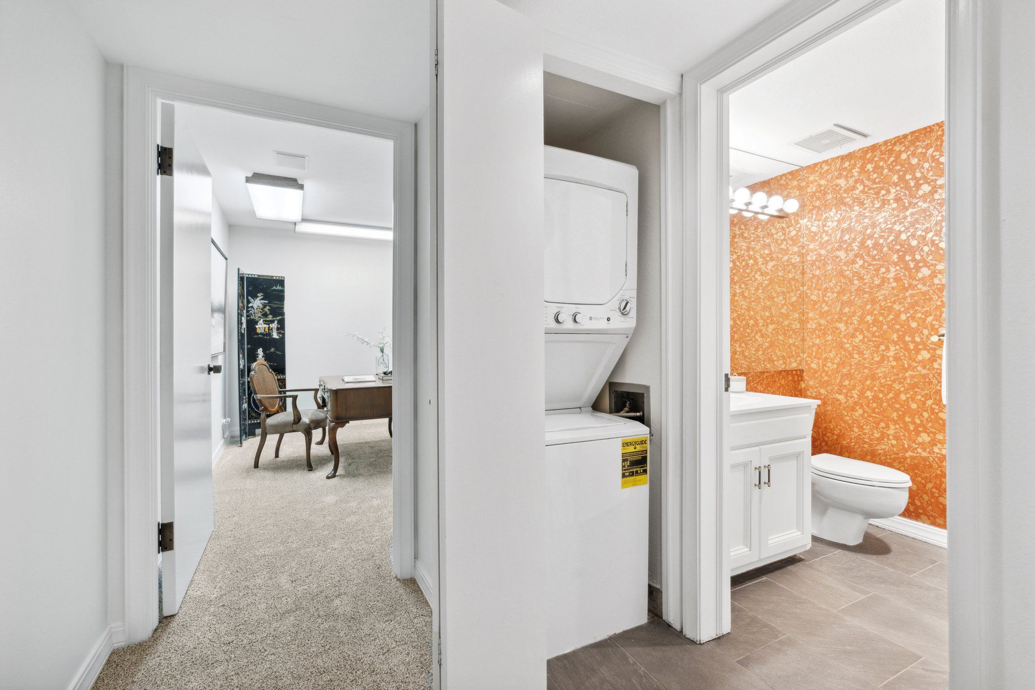 This newly remodeled corner unit boasts an open and sunlit floor plan with new carpet, new carpet pad, new tile, and new paint throughout for a plush and inviting atmosphere. Design aficionados will appreciate the functional artistry of the Japanese influenced shoji screen elegantly concealing impressive built-in storage along with the custom ceiling mural in the dining room.