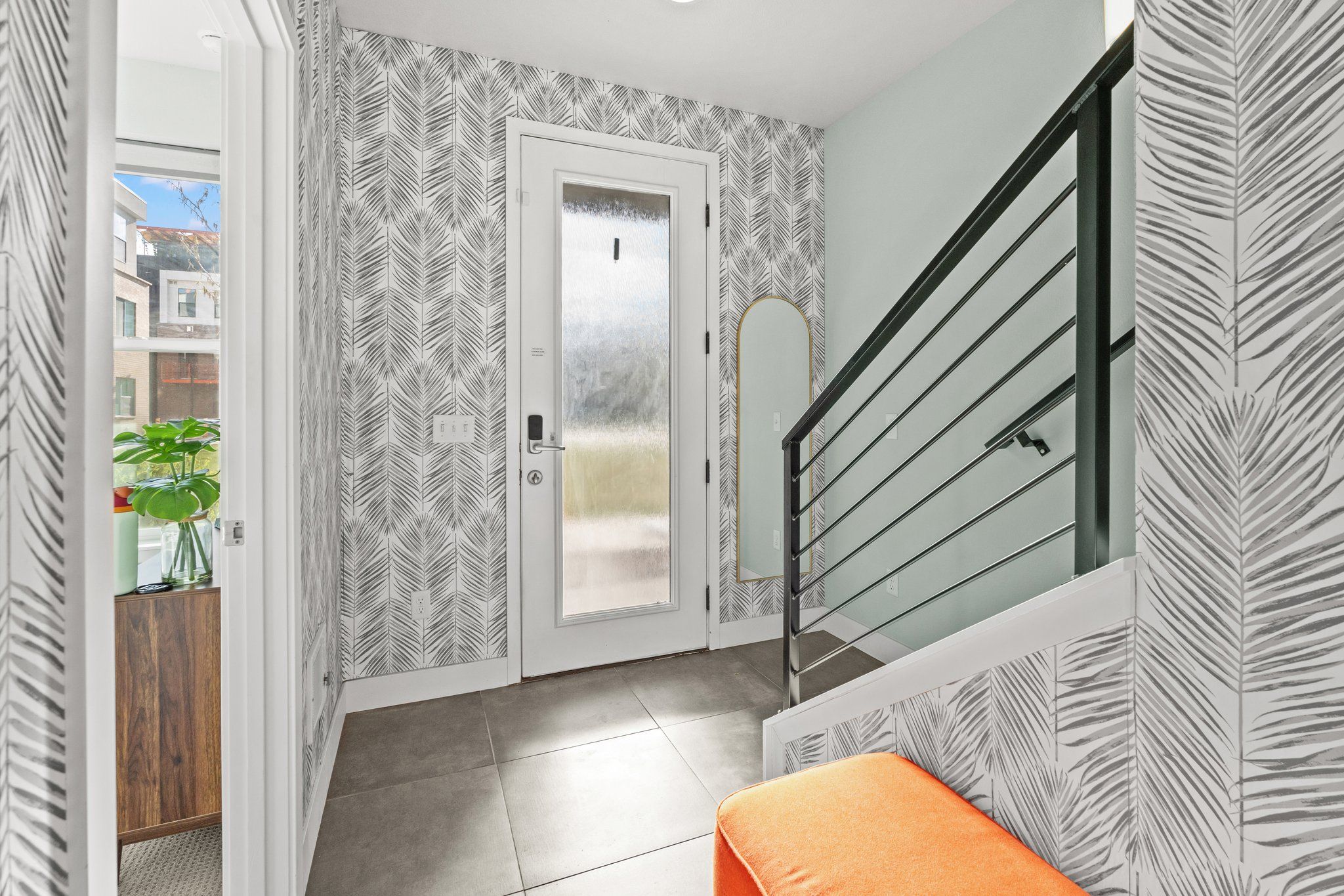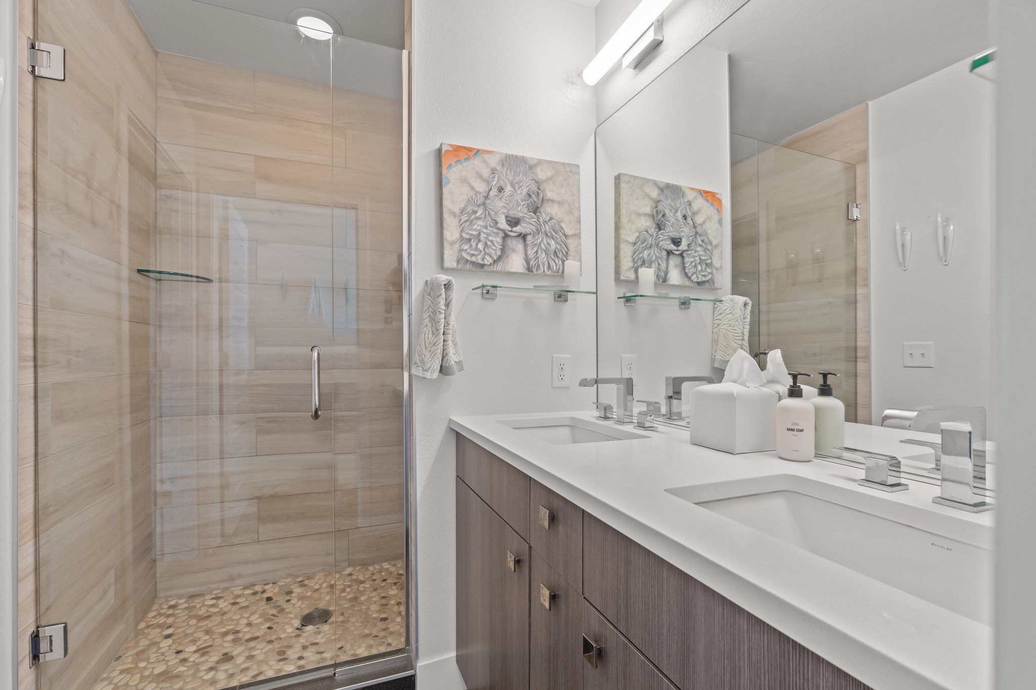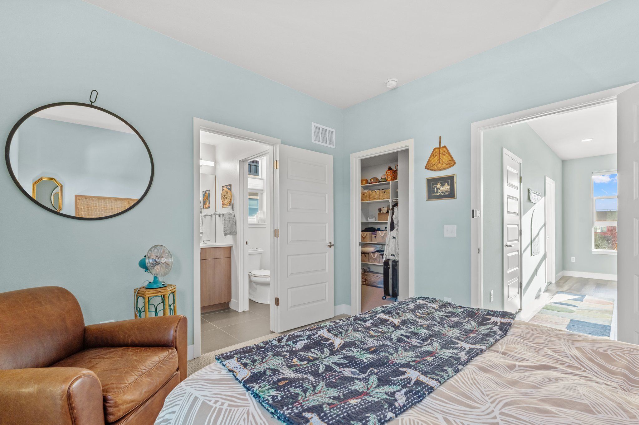 The open floor plan kitchen is an entertainer’s dream. It features quartz countertops, a gas stove, and stainless steel appliances. It seamlessly connects to the dining and living areas, offering a perfect space for entertaining with views of the west-facing courtyard. The third level is a refined retreat, boasting a primary suite with an en suite bathroom, dual vanity sinks, and a spa-like shower.