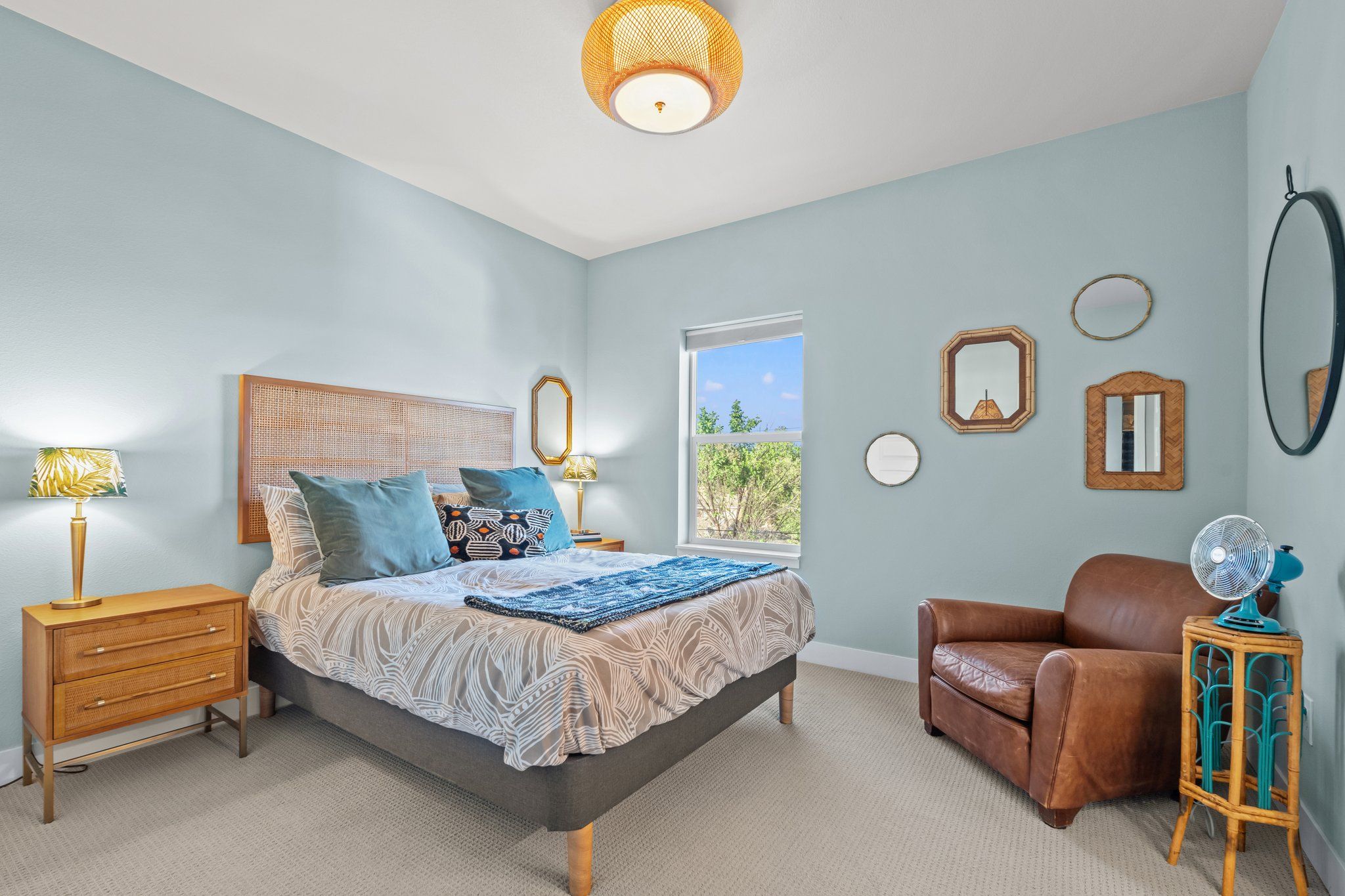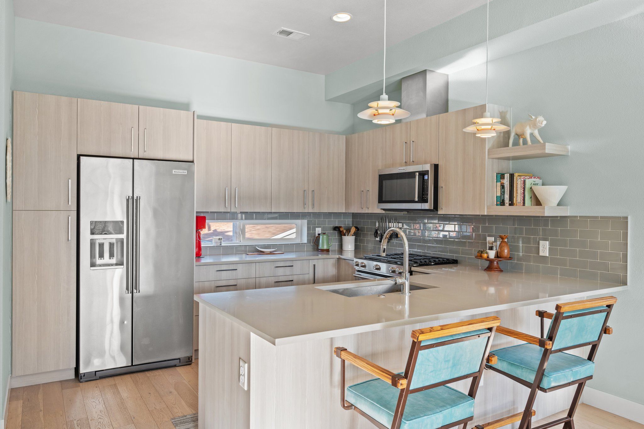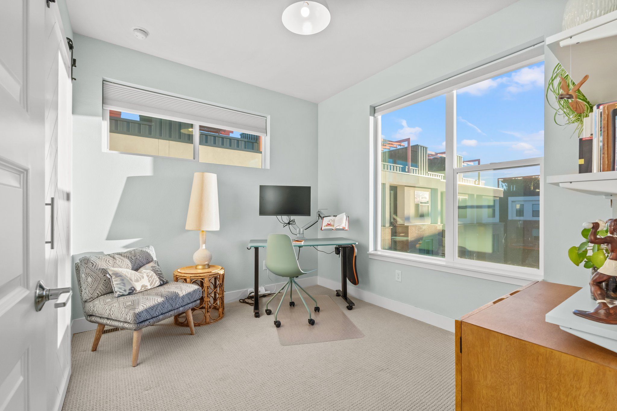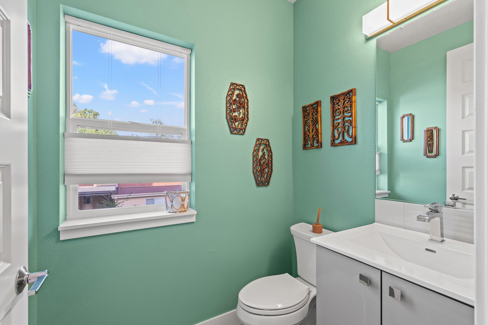 The open floor plan kitchen is an entertainer’s dream. It features quartz countertops, a gas stove, and stainless steel appliances. It seamlessly connects to the dining and living areas, offering a perfect space for entertaining with views of the west-facing courtyard. The third level is a refined retreat, boasting a primary suite with an en suite bathroom, dual vanity sinks, and a spa-like shower.