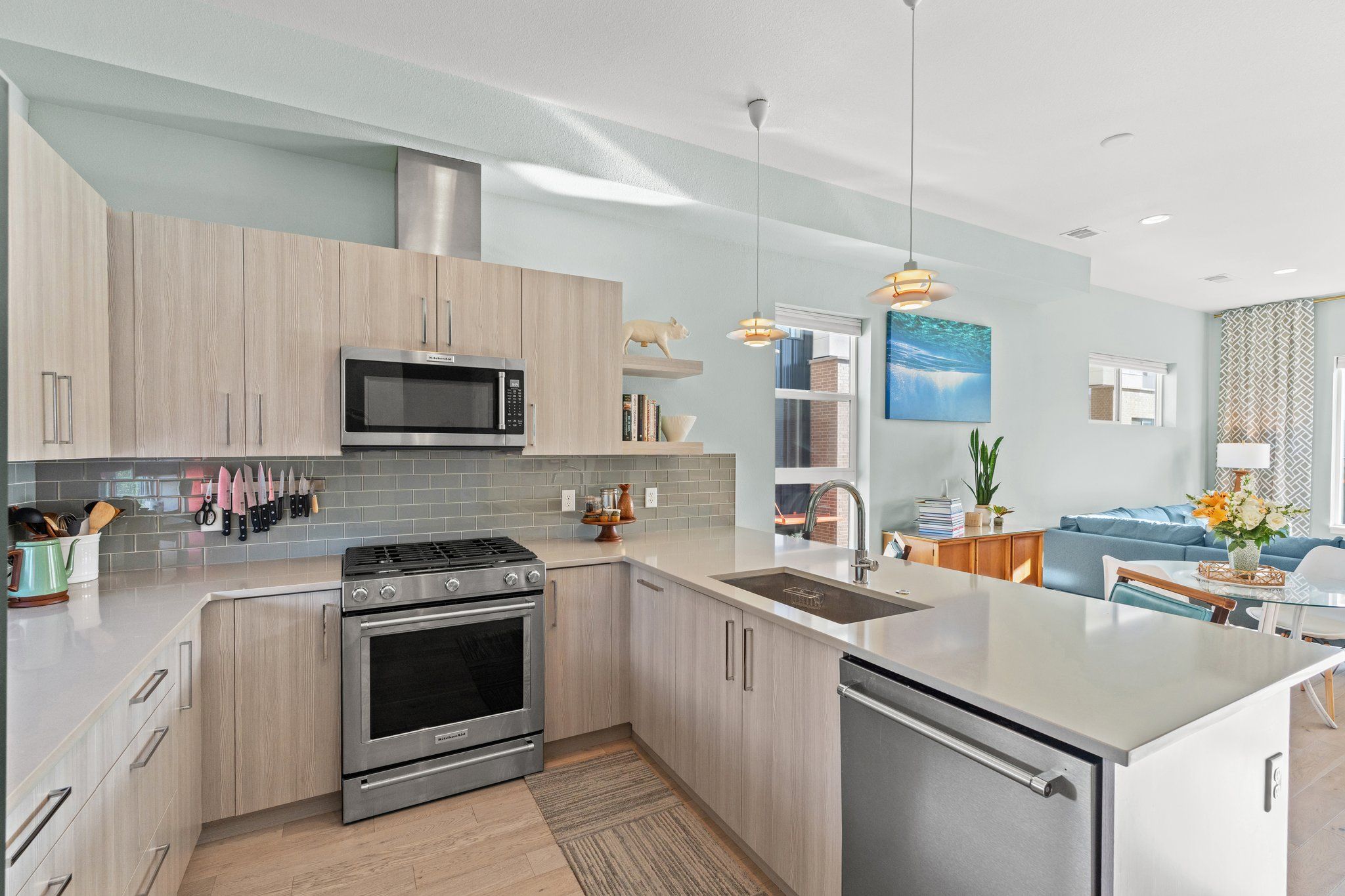 | The open floor plan kitchen is an entertainer’s dream. It features quartz countertops, a gas stove, and stainless steel KitchenAid appliances. It seamlessly connects to the dining and living areas, offering a perfect space for entertaining with views of the west-facing community courtyard. |