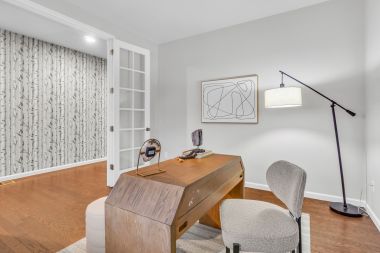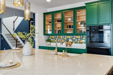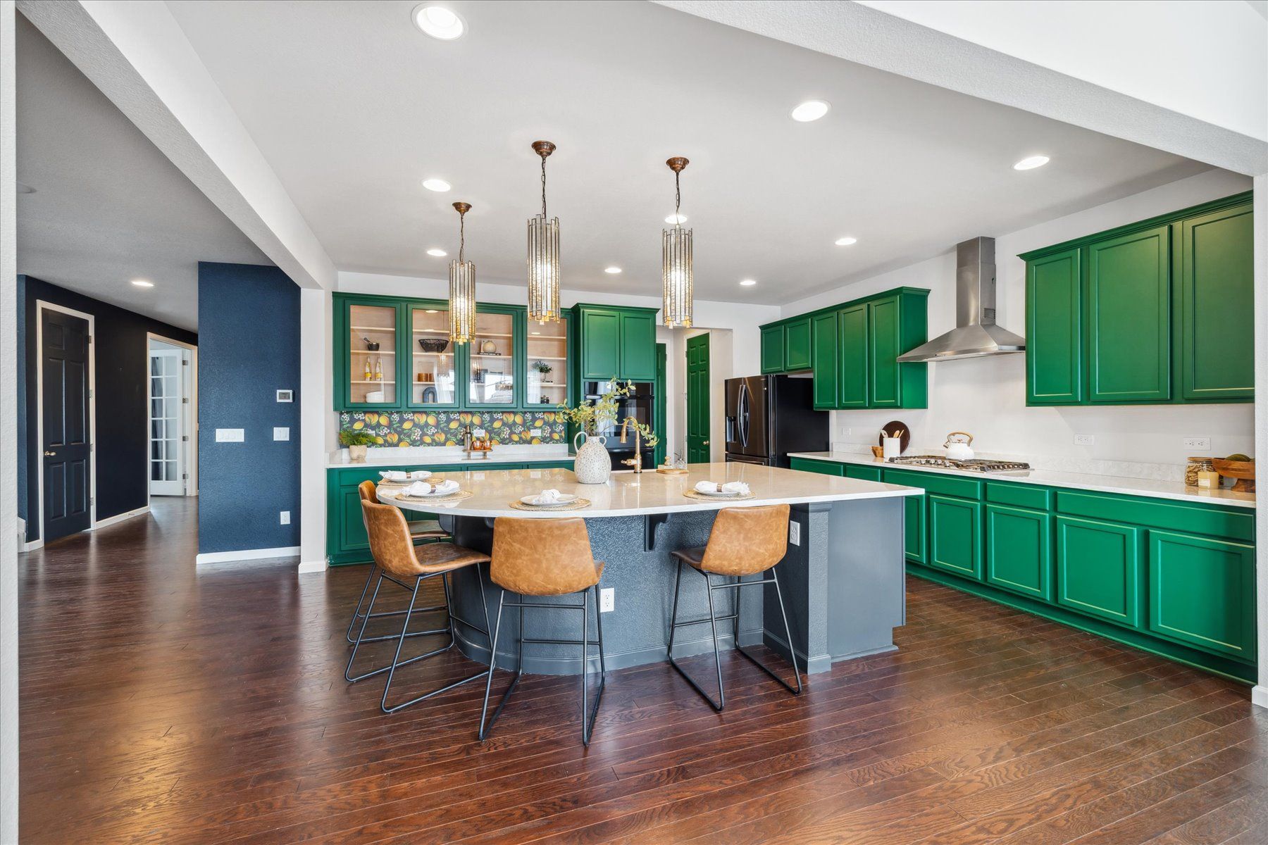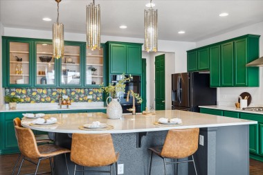 The gourmet kitchen boasts a generous quartz island, porcelain farm sink, sumptuous green cabinetry (add your choice of gold hardware, and Voilà! Architectural Digest will be at your door for an interview), gas range, a walk-in pantry, and custom lighting throughout. The adjacent dining and living rooms seamlessly connect indoor and outdoor spaces with vaulted ceilings, giant picture windows, and sliding doors leading to the covered back deck.