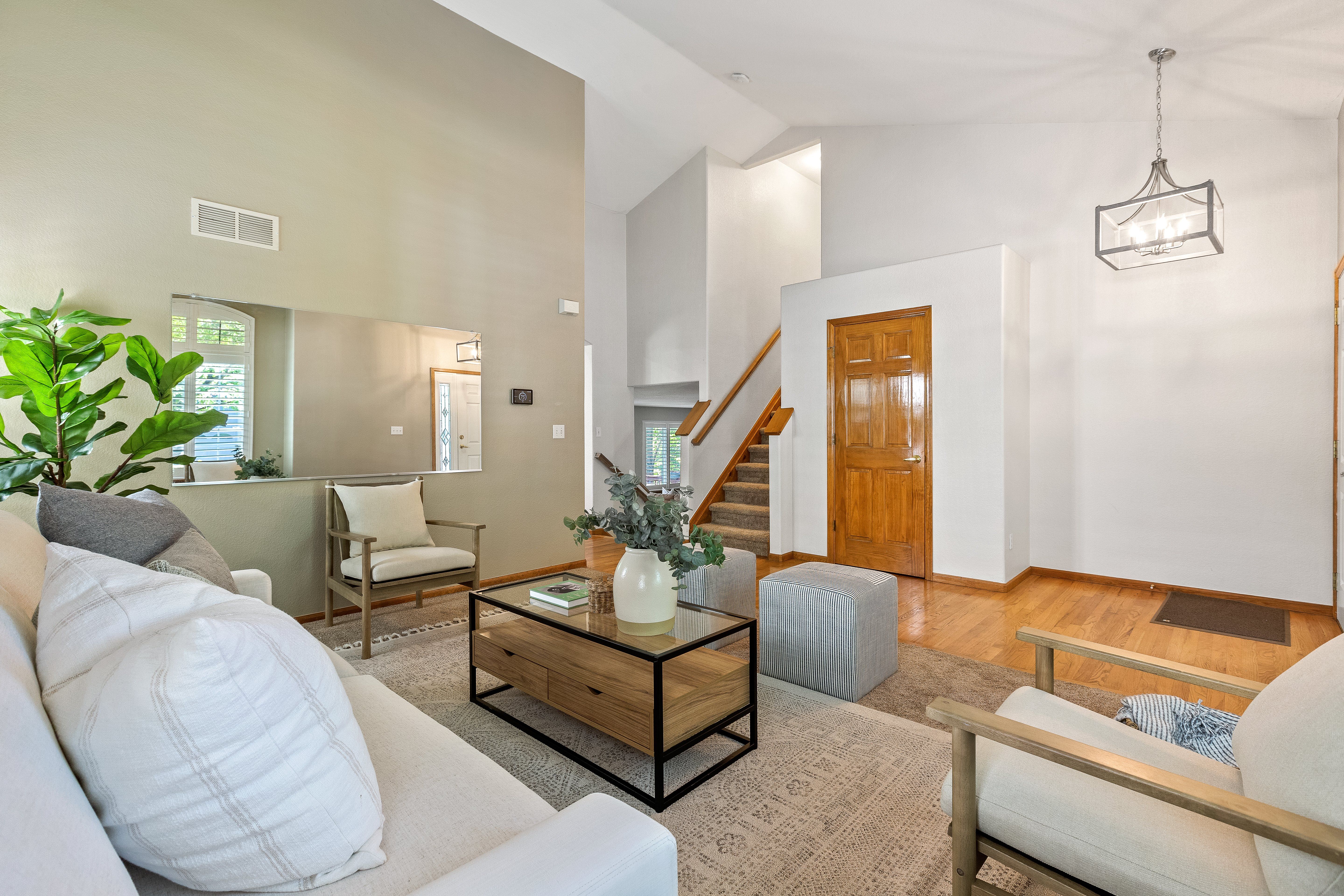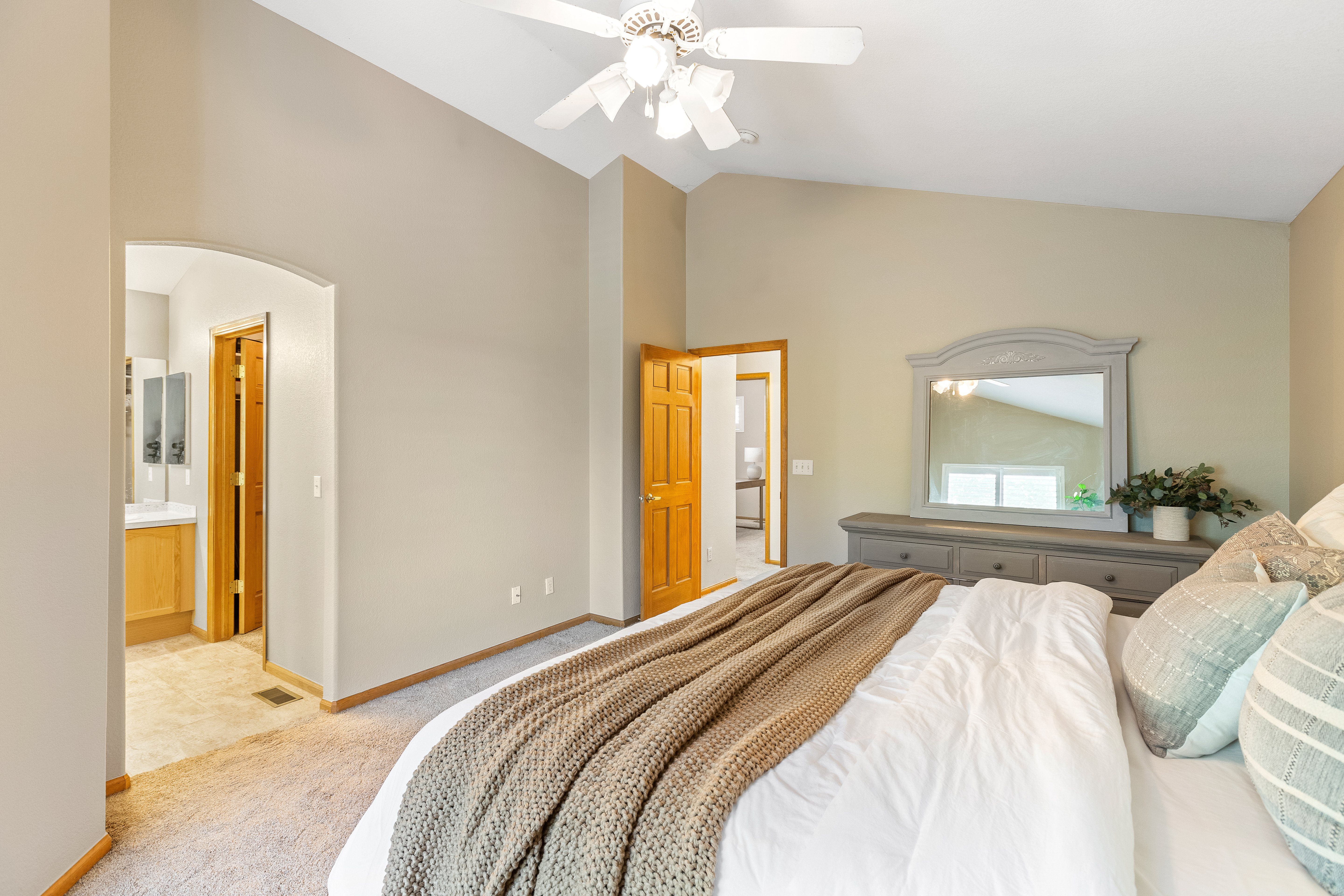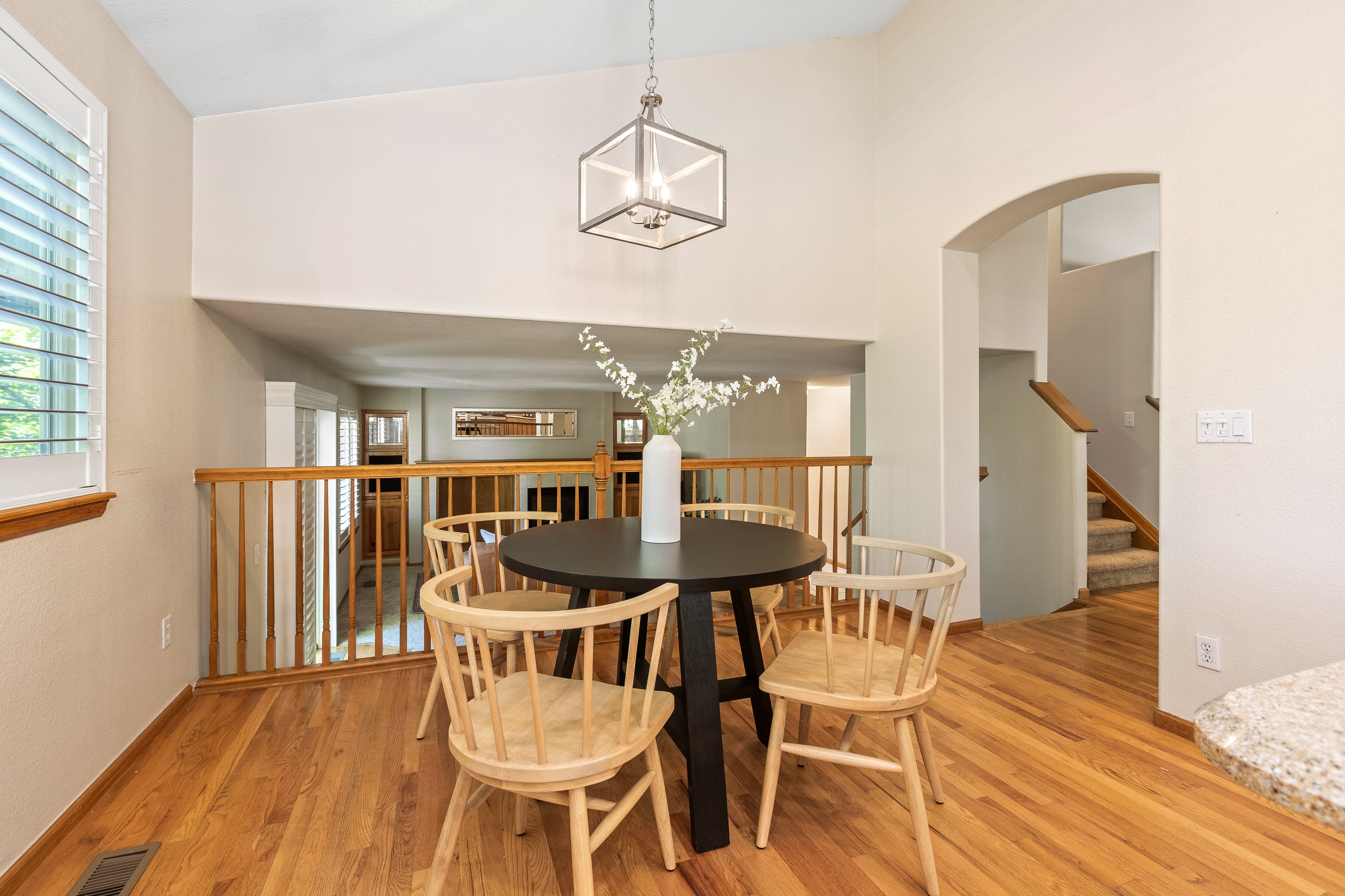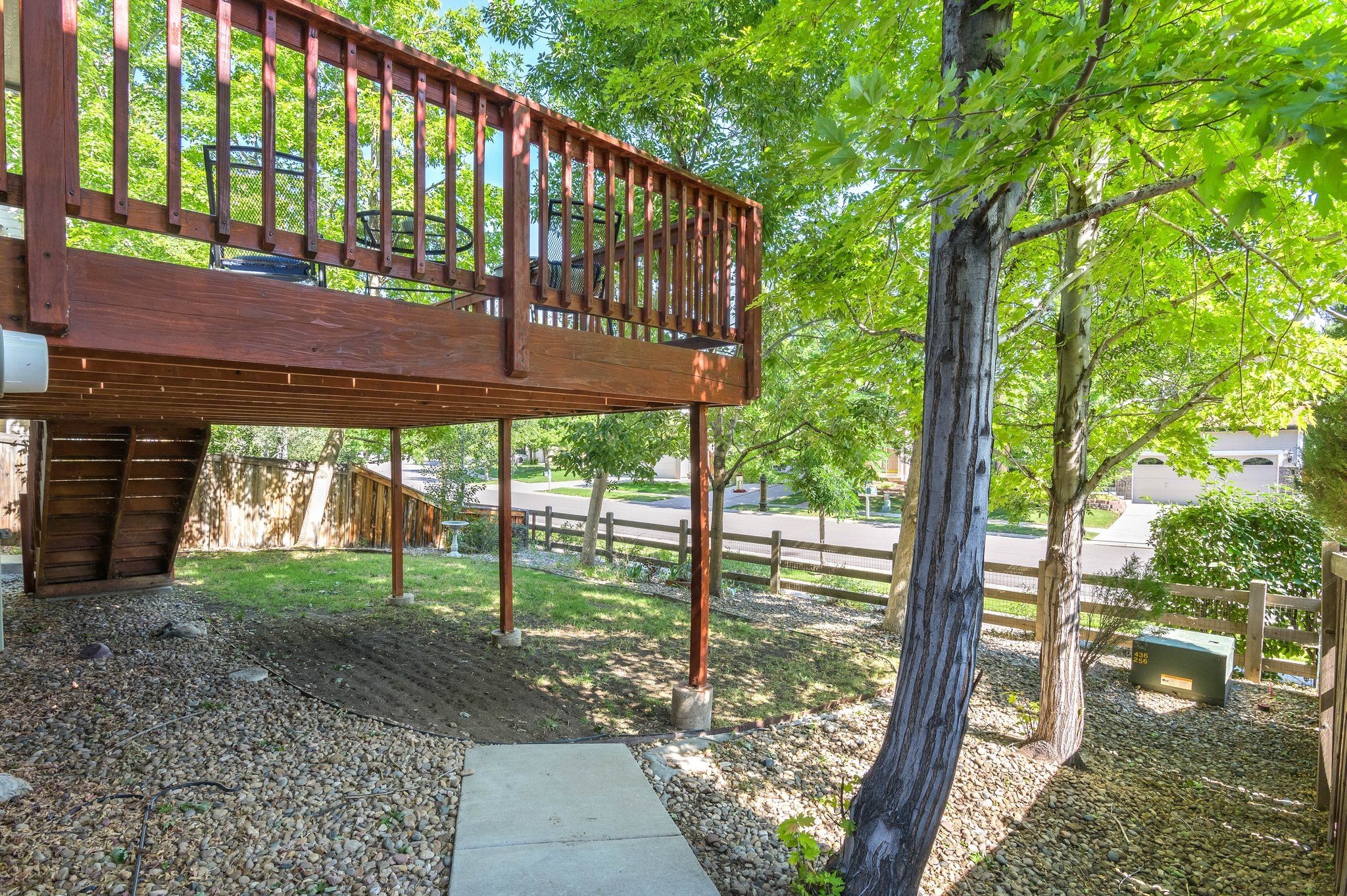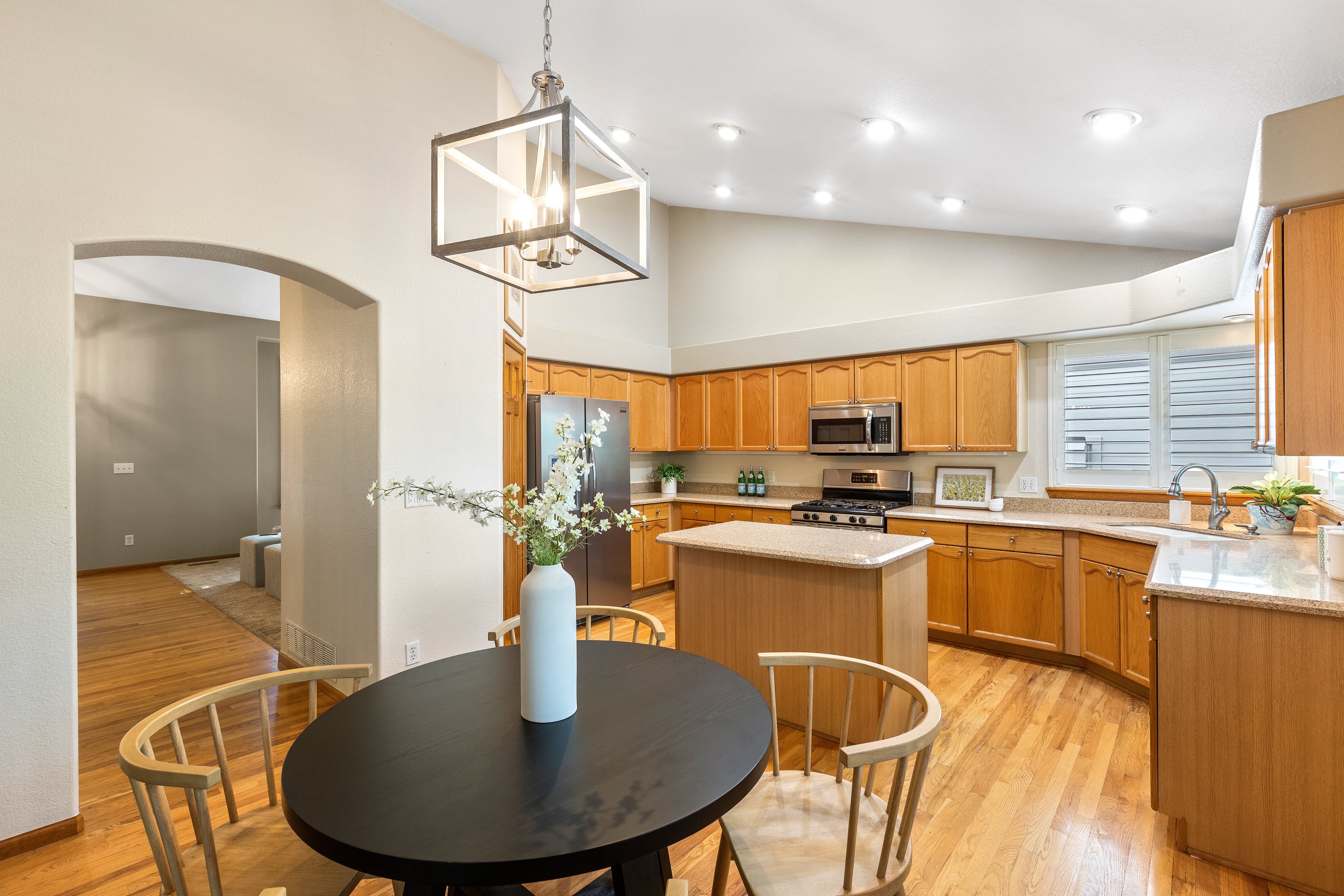 If you are looking for the Colorado lifestyle, look no further! Walk on the trails, paddleboard at the lake, swim at the pool and more at the community of Grant Ranch. A welcoming entryway transitions to the front living room feature vaulted ceilings and custom plantation shutters. The open concept kitchen and dining space boast stainless steel appliances, quartz countertops and a brand new chandelier. The kitchen is open to an additional living room/den with a cozy electric fireplace, built-in shelving, and double doors to the deck overlooking the backyard.