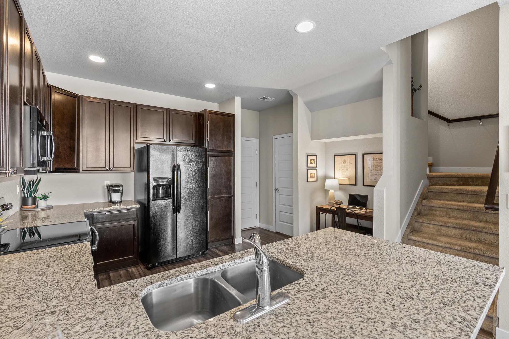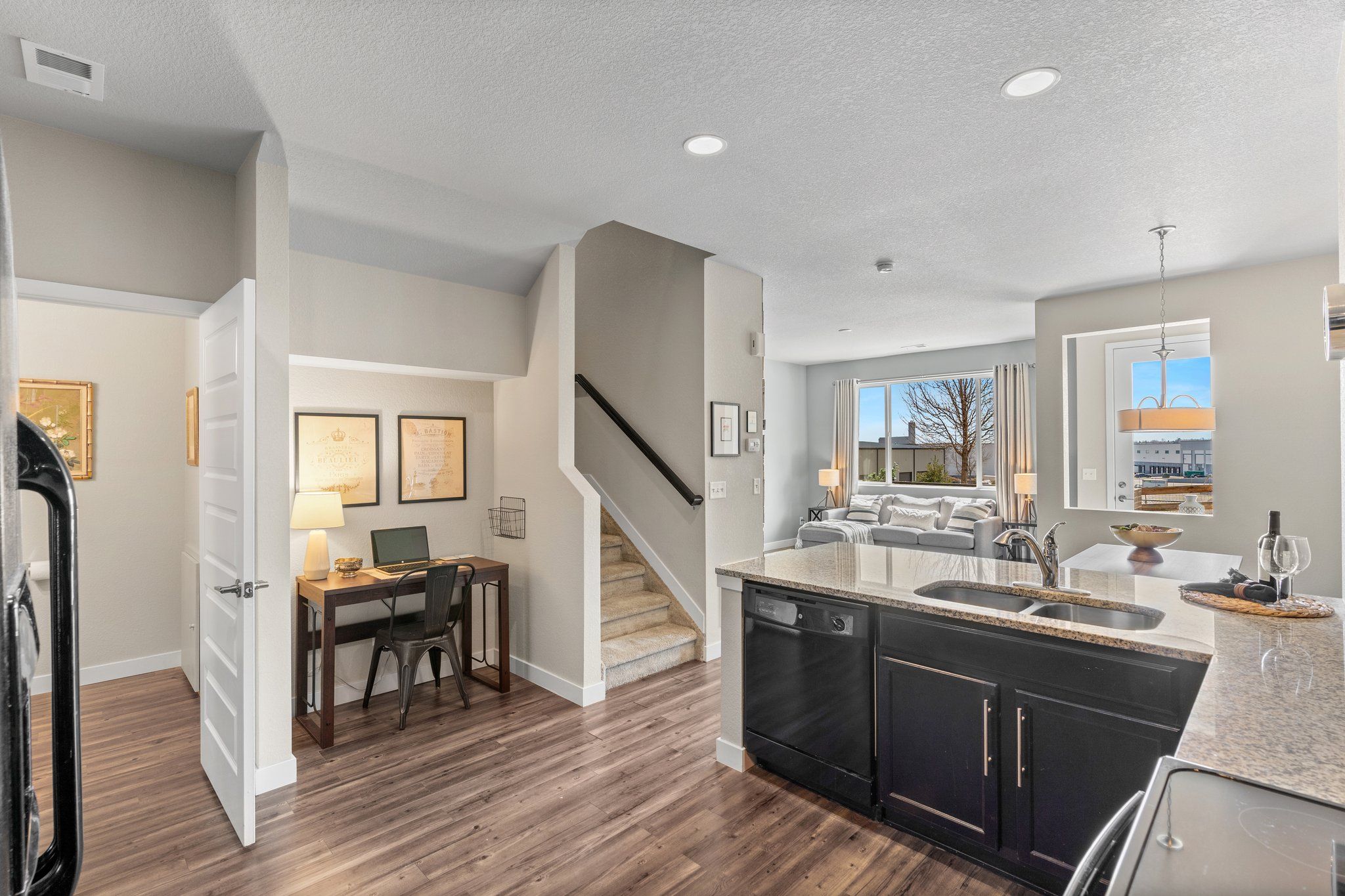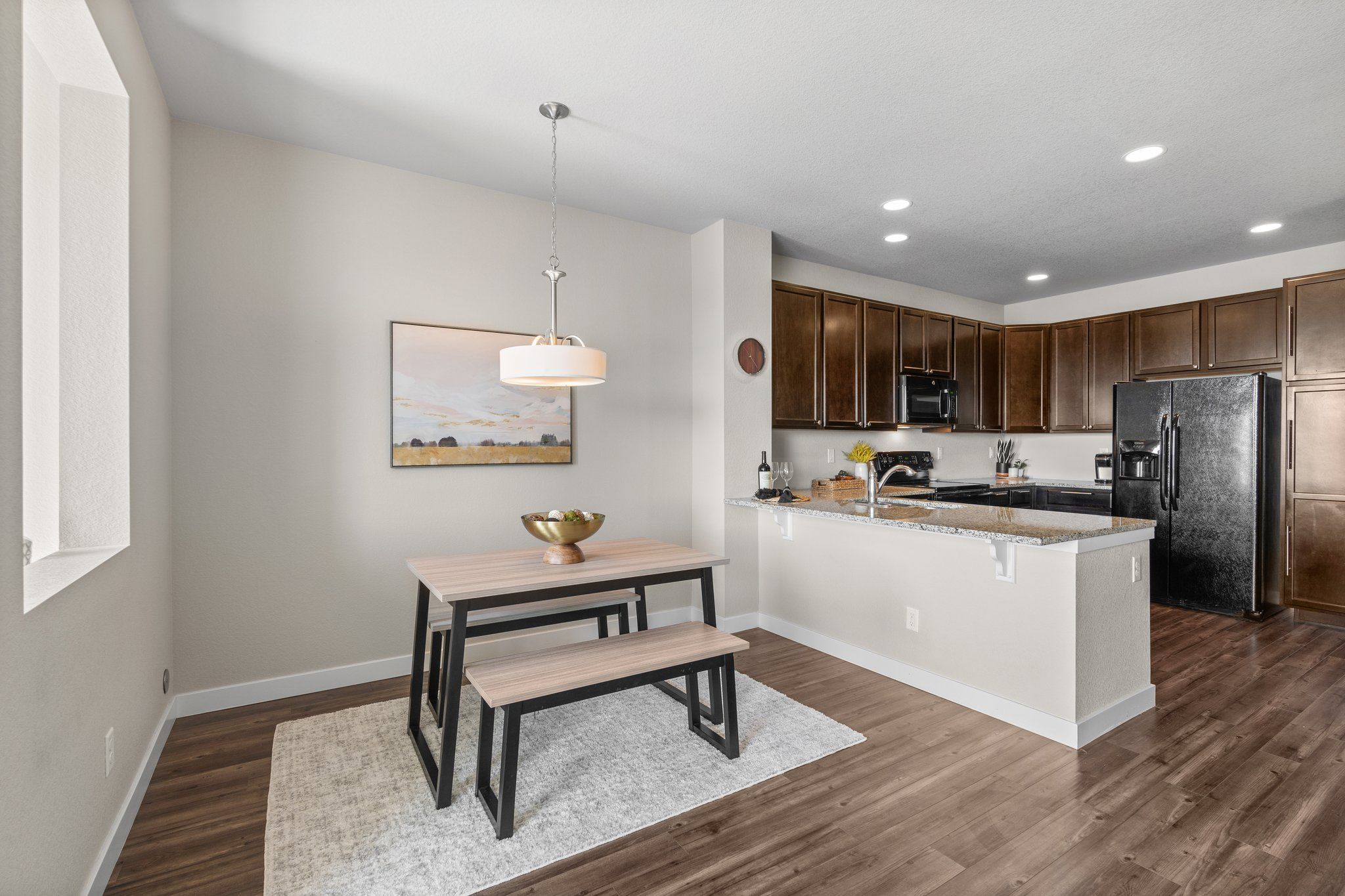 The spacious kitchen is open to the dining and living areas on the main floor. The kitchen features slab granite breakfast bar, plenty of storage, and black appliances. Tons of windows and nine-foot ceilings allow for optimal natural light. In the living room freshly painted accent walls and the built-in fireplace framed with reclaimed barn wood create a cozy place to gather.