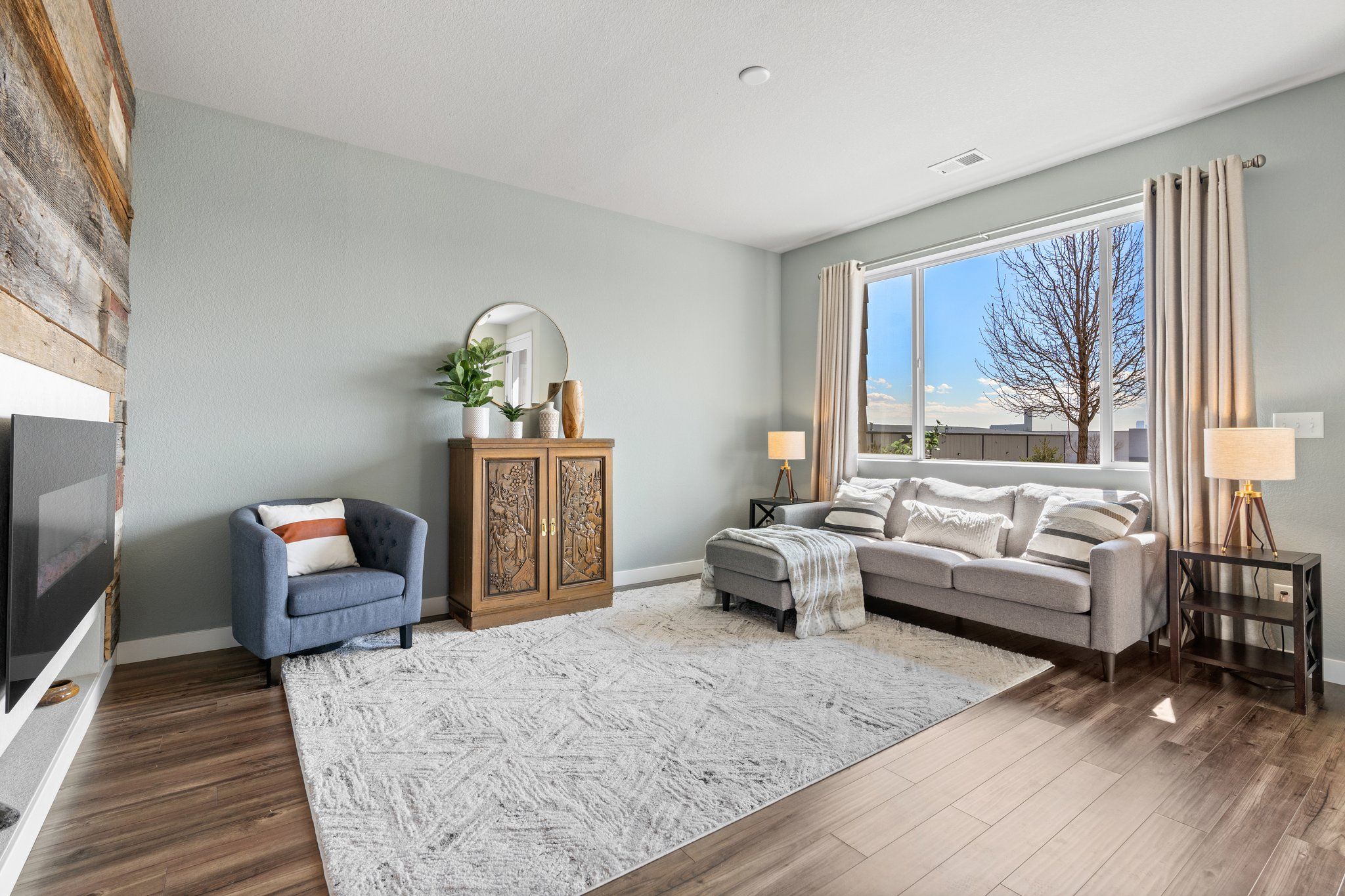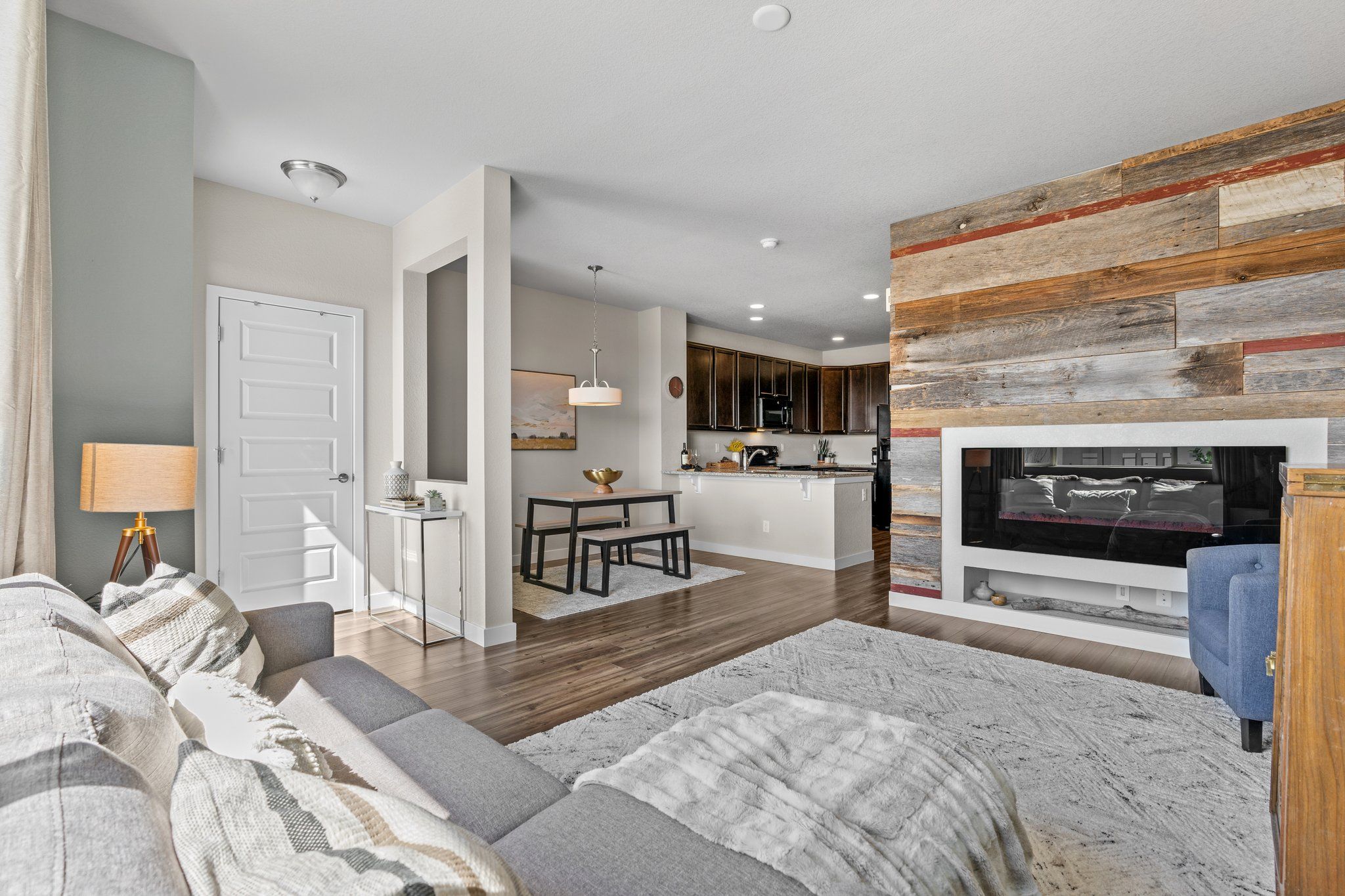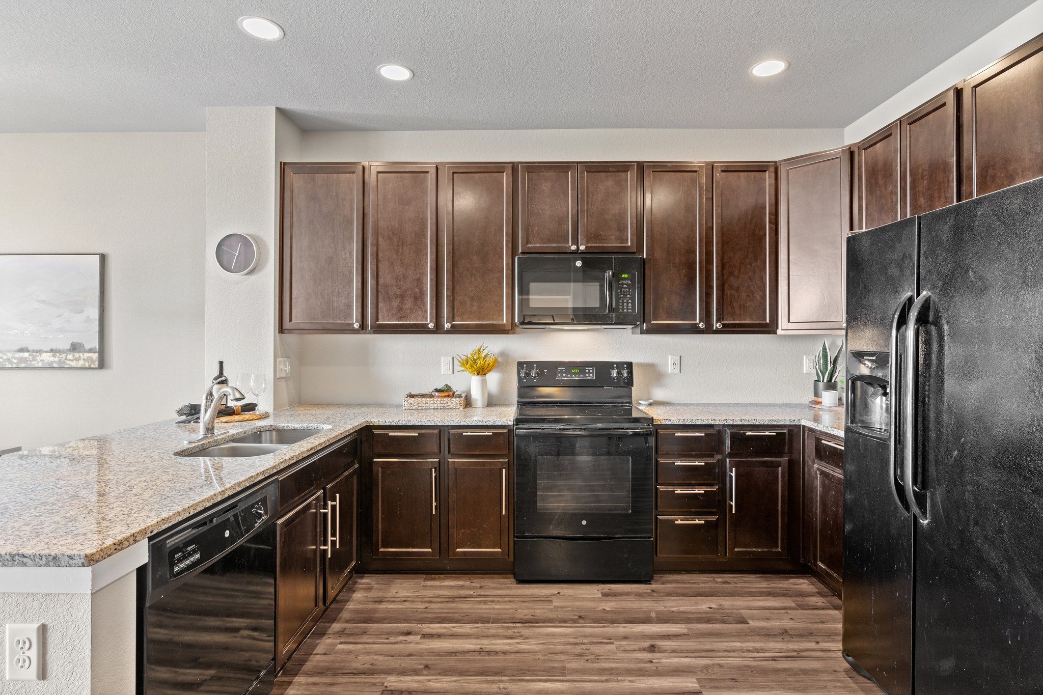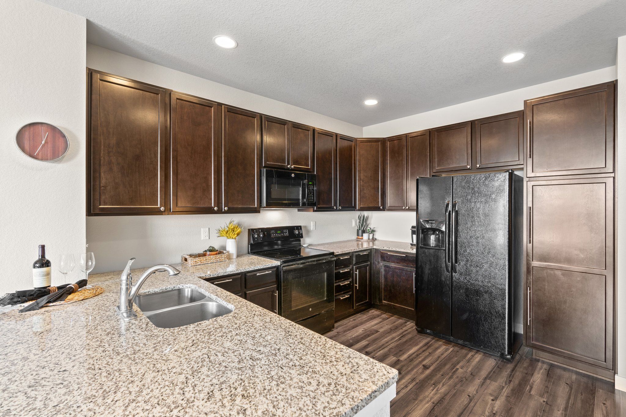 The spacious kitchen is open to the dining and living areas on the main floor. The kitchen features slab granite breakfast bar, plenty of storage, and black appliances. Tons of windows and nine-foot ceilings allow for optimal natural light. In the living room freshly painted accent walls and the built-in fireplace framed with reclaimed barn wood create a cozy place to gather.