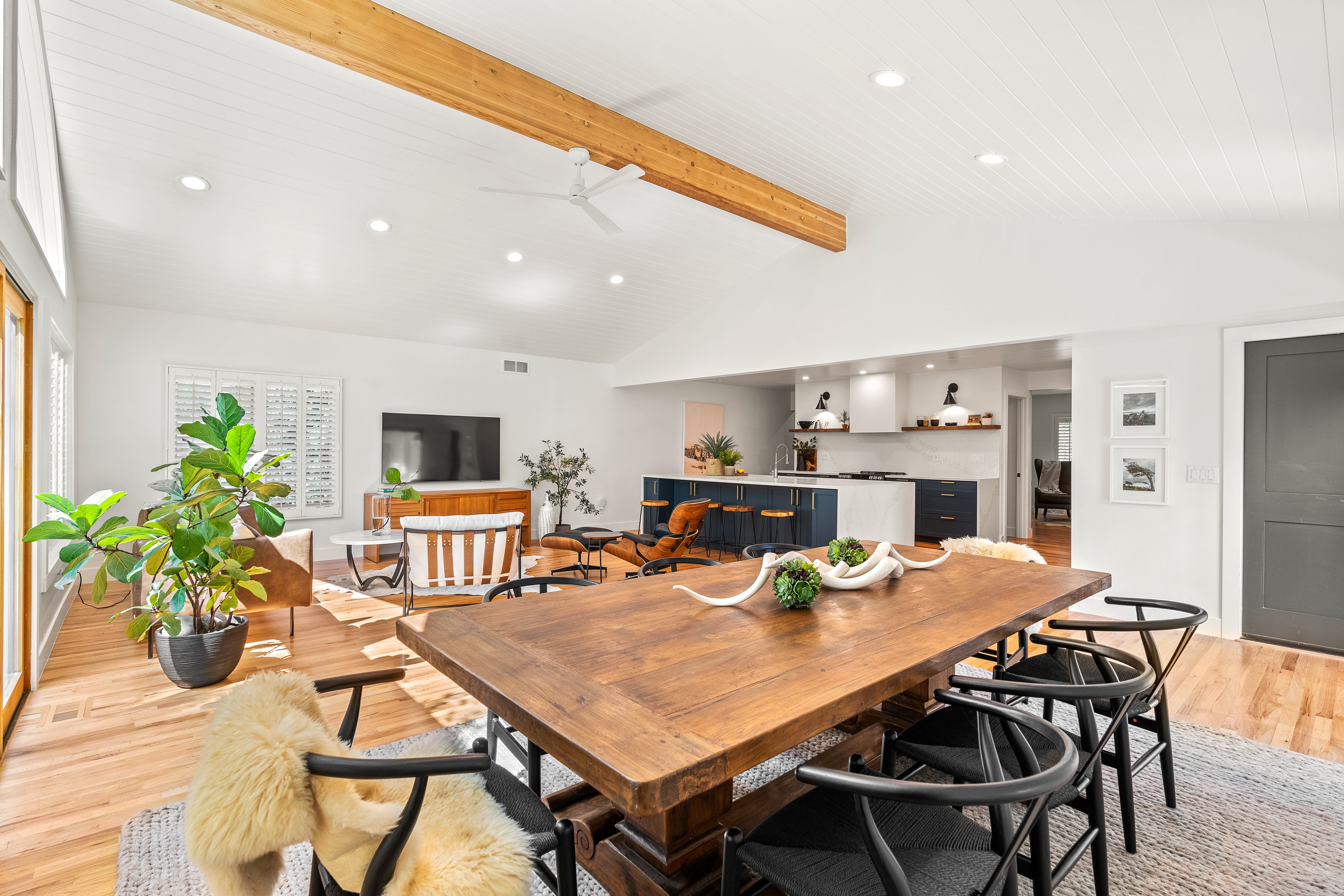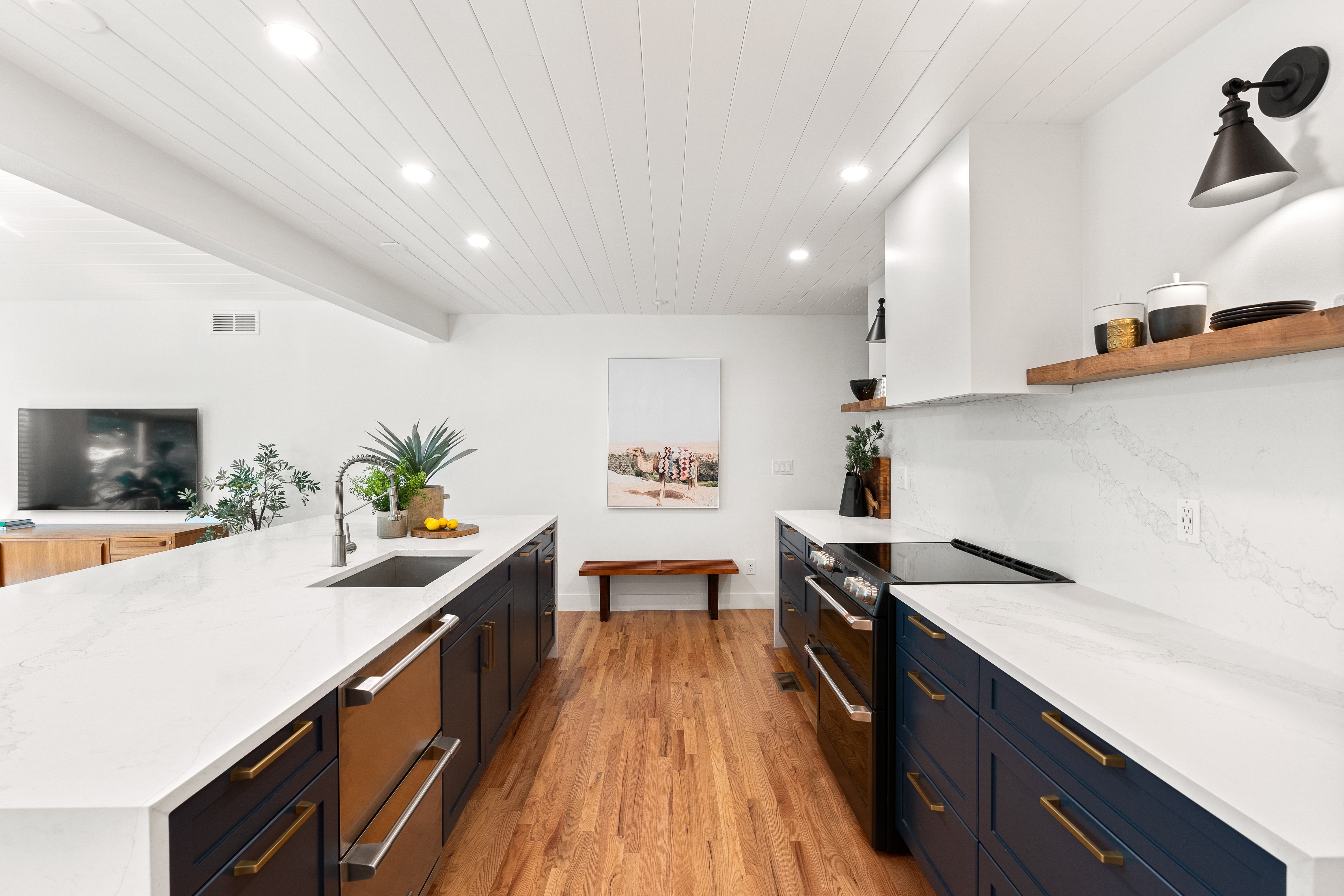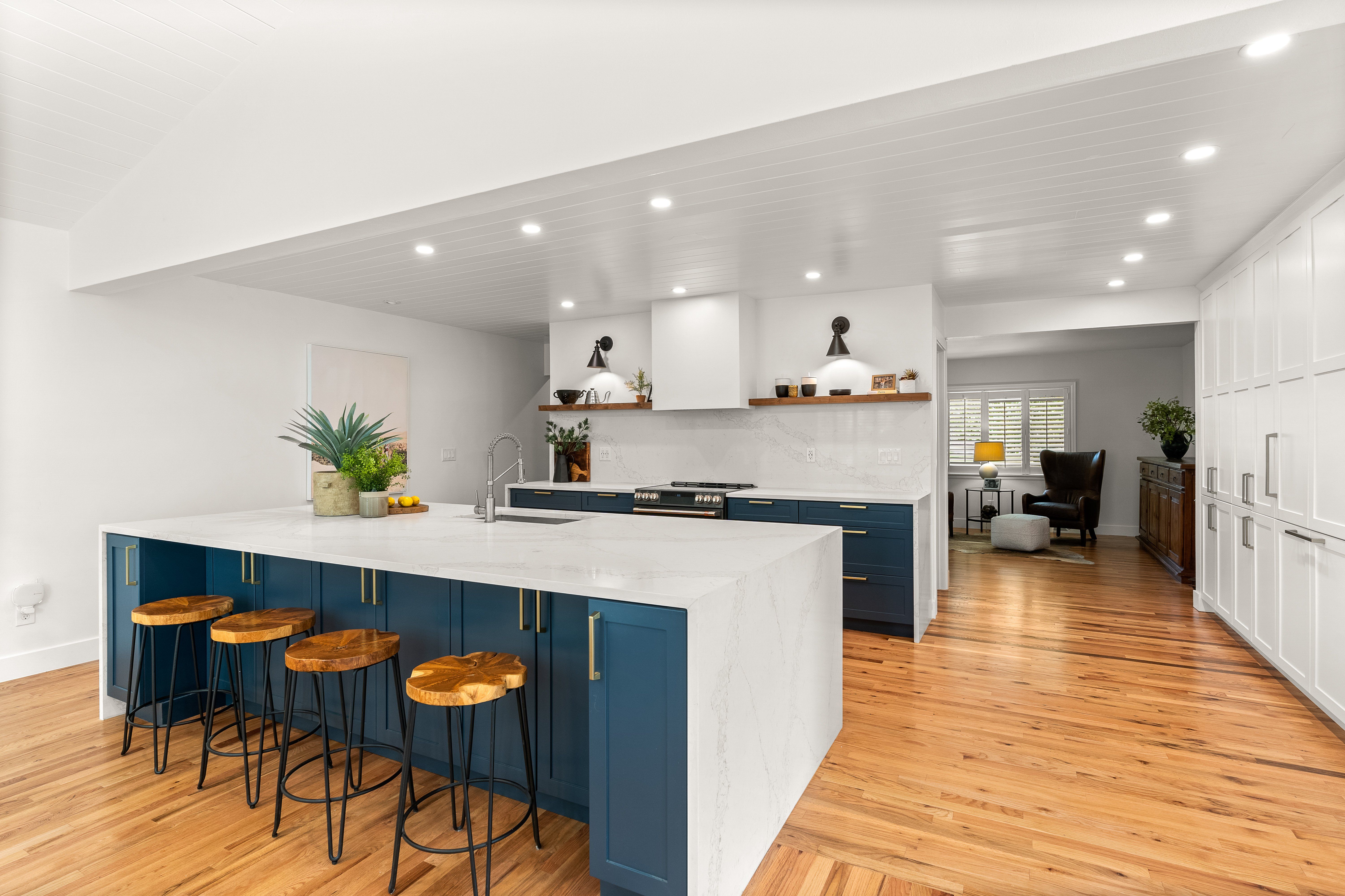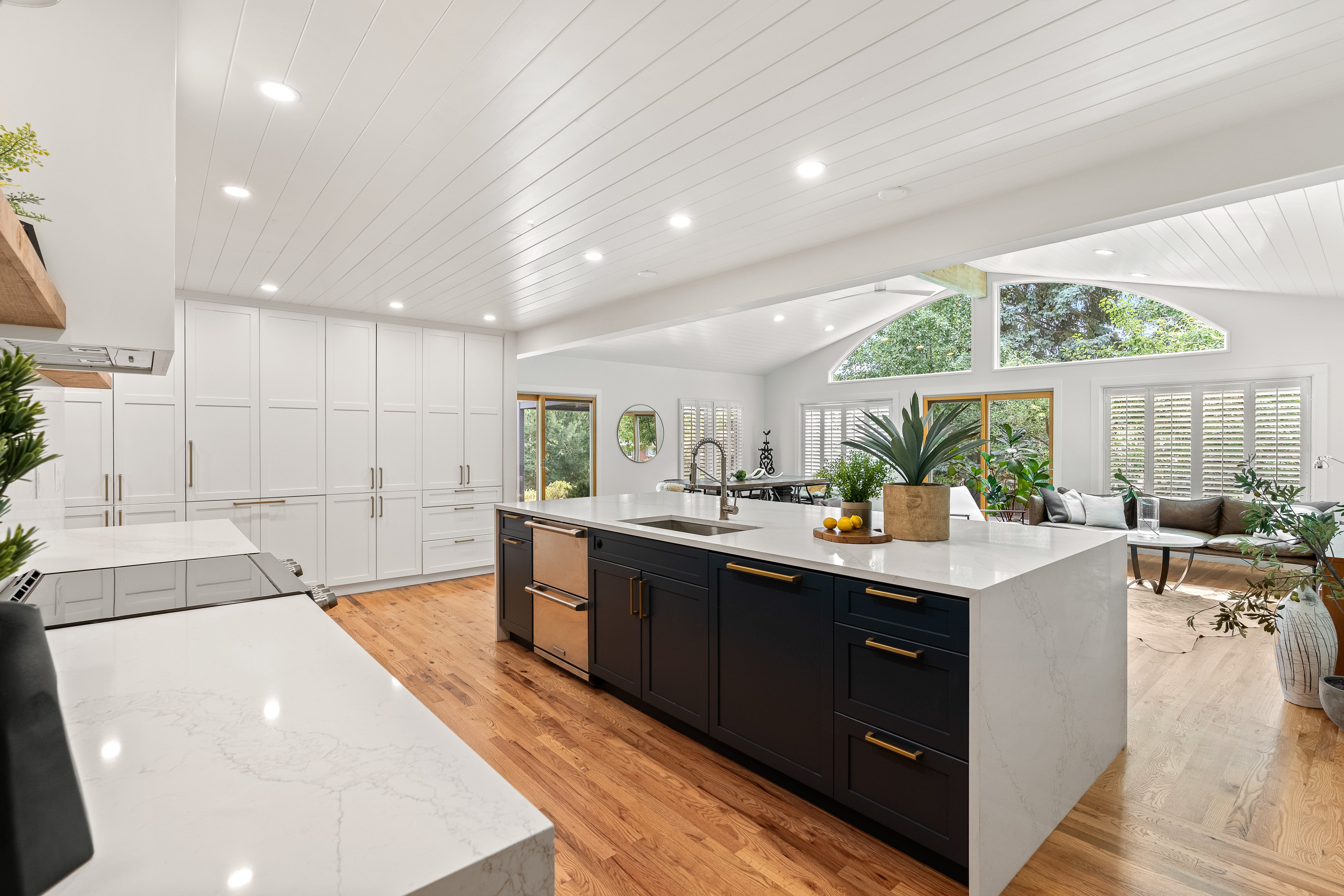 An impressive center island with quartz waterfall edge equates to easy entertaining in the show-stopping luxe kitchen. Even the most discerning home chef will find their creative experience elevated with the induction range, Electrolux refrigerator drawers, Gaggenau paneled fridge, and loads of storage in the custom-made built-ins with gold hardware.