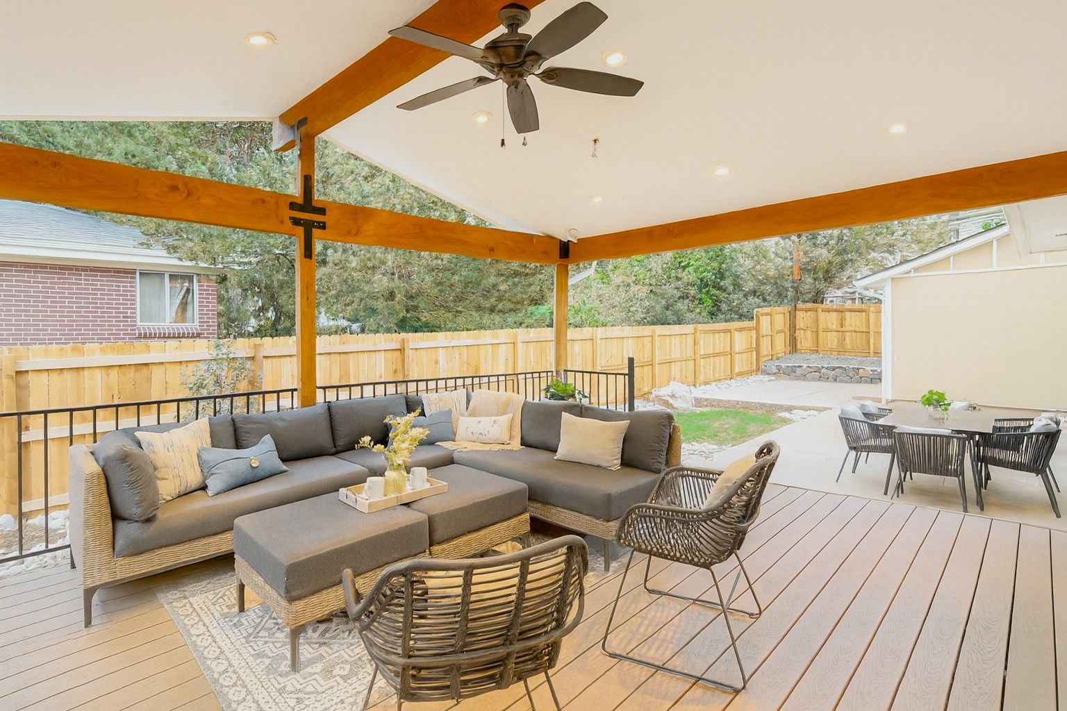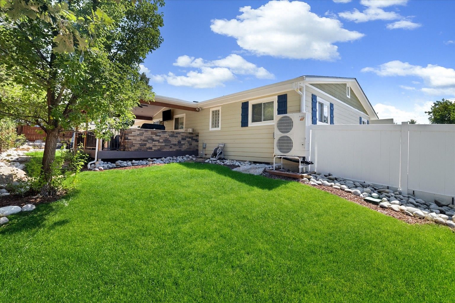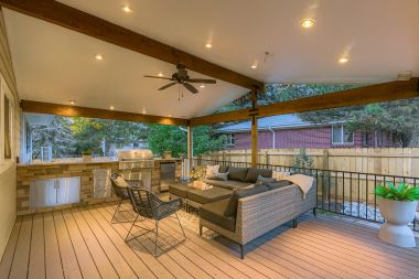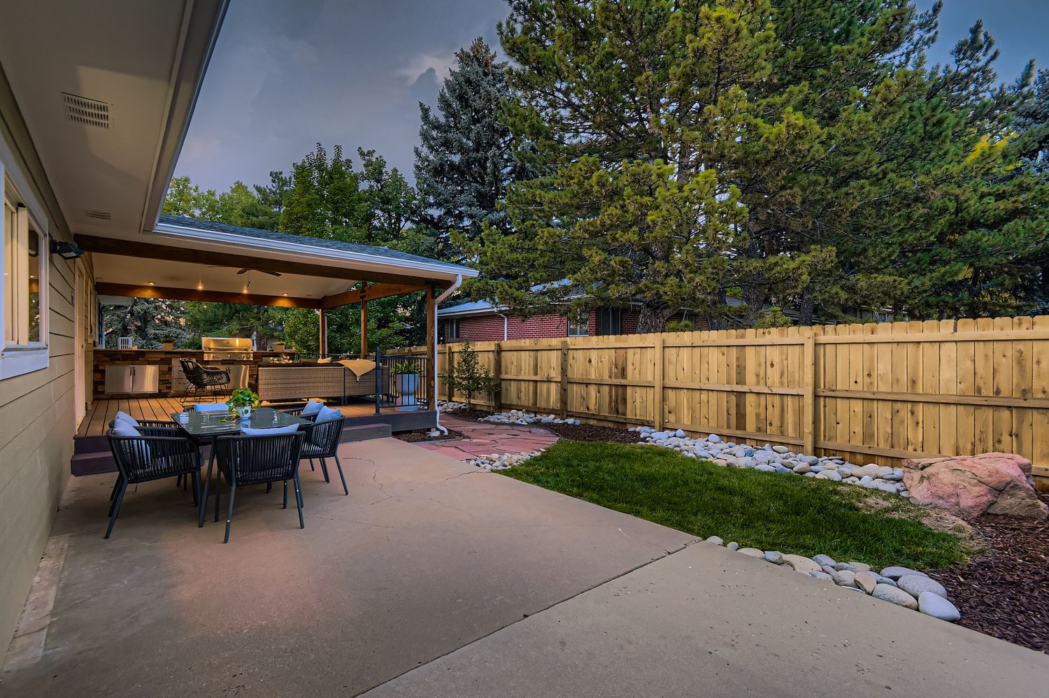 The expansive covered patio showcases a built-in, four-season kitchen with Trex decking and is pre-wired for a big-screen TV. Ceiling fan and ample lighting installed, plus a gas connection to add heat if you desire—creating the ultimate setting for game-day gatherings and year-round outdoor entertaining.