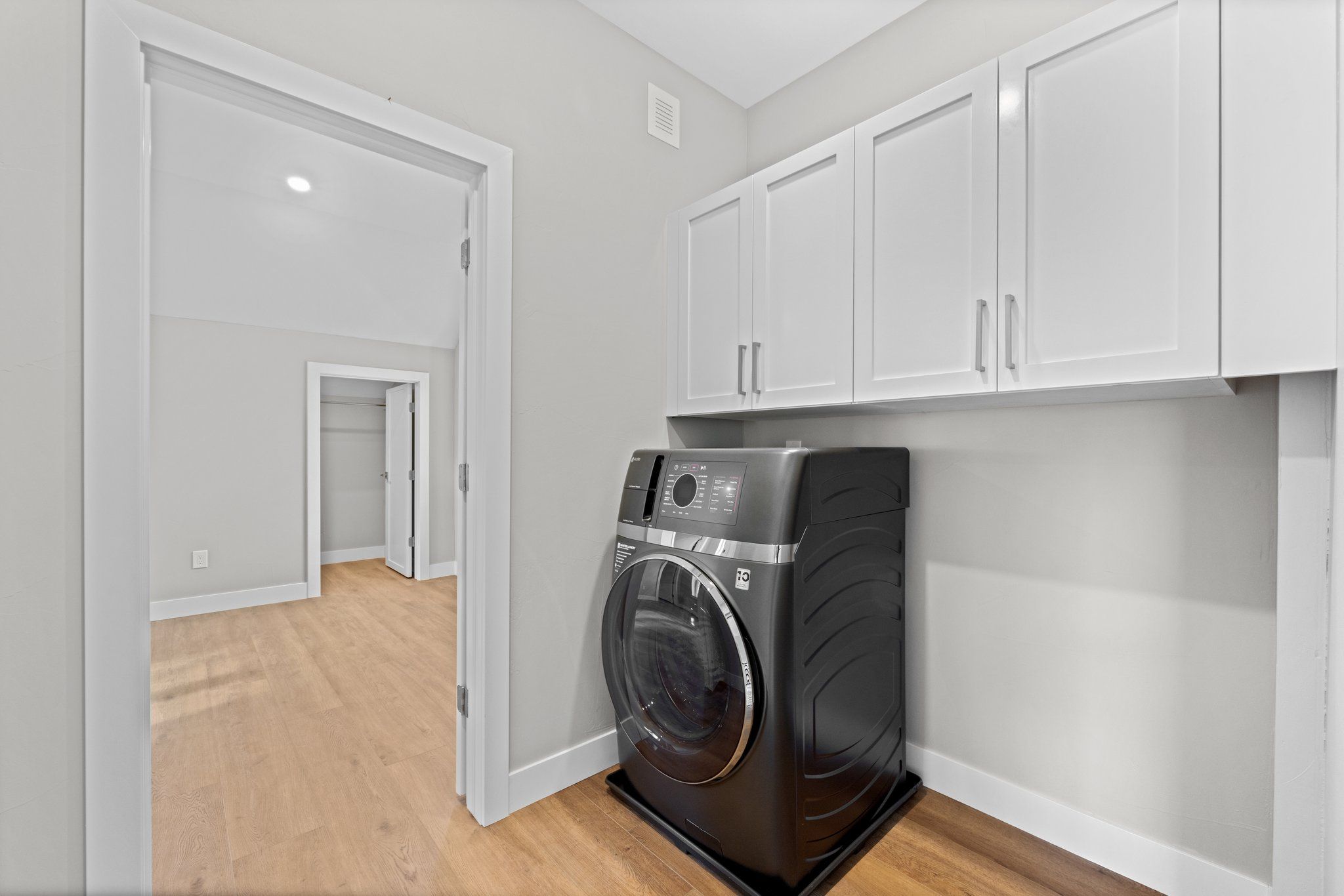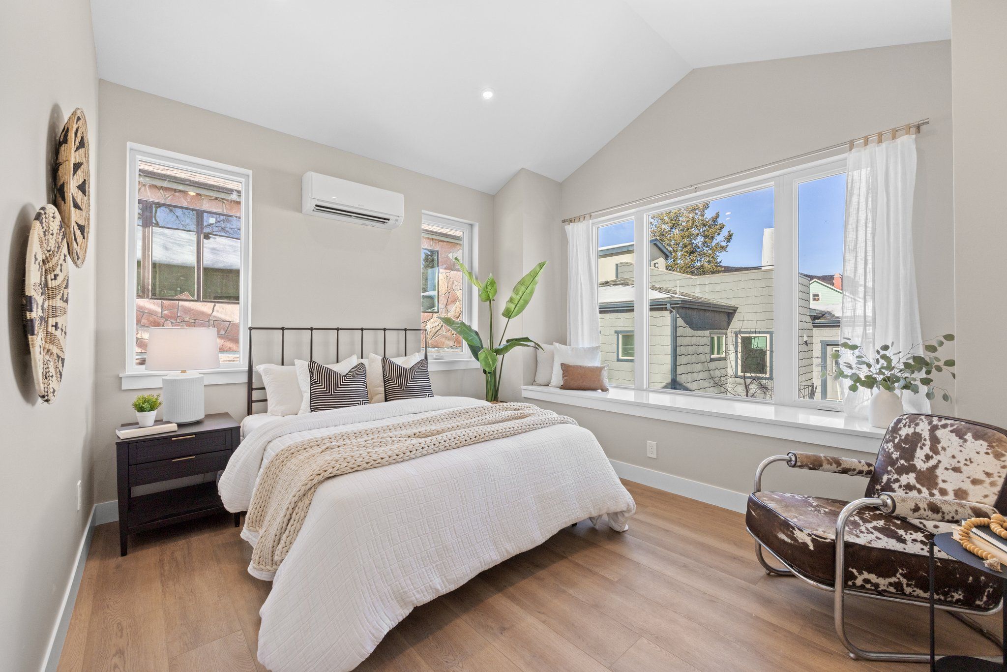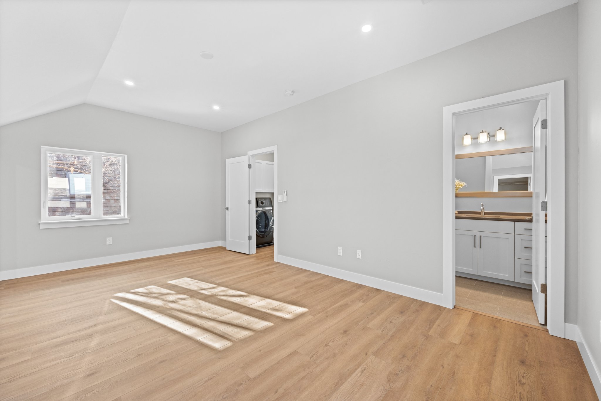 Amenities include a new state-of-the-art high efficiency heat pump washer/dryer combination, mini split heating and cooling with five separate zone controls and heat pump hot water heater. Each bedroom has its own climate control. Two primary bedrooms with ensuites are on the second level and one large bedroom with an adjacent bathroom located in the basement. The home is filled with natural light thanks to new modern windows. Efficiency was the focus of this property which equates to low utility bills. There is an attached single oversized garage with automatic garage door and 220v outlet for electric vehicle charging.